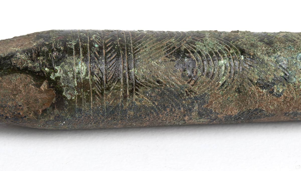 Patina originale, costolatura centrale e decorazione incisa alla base.