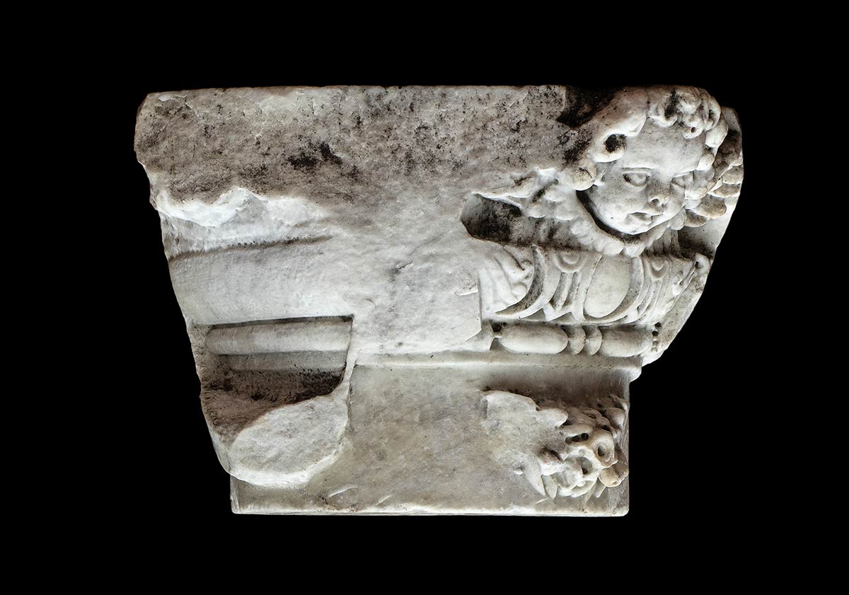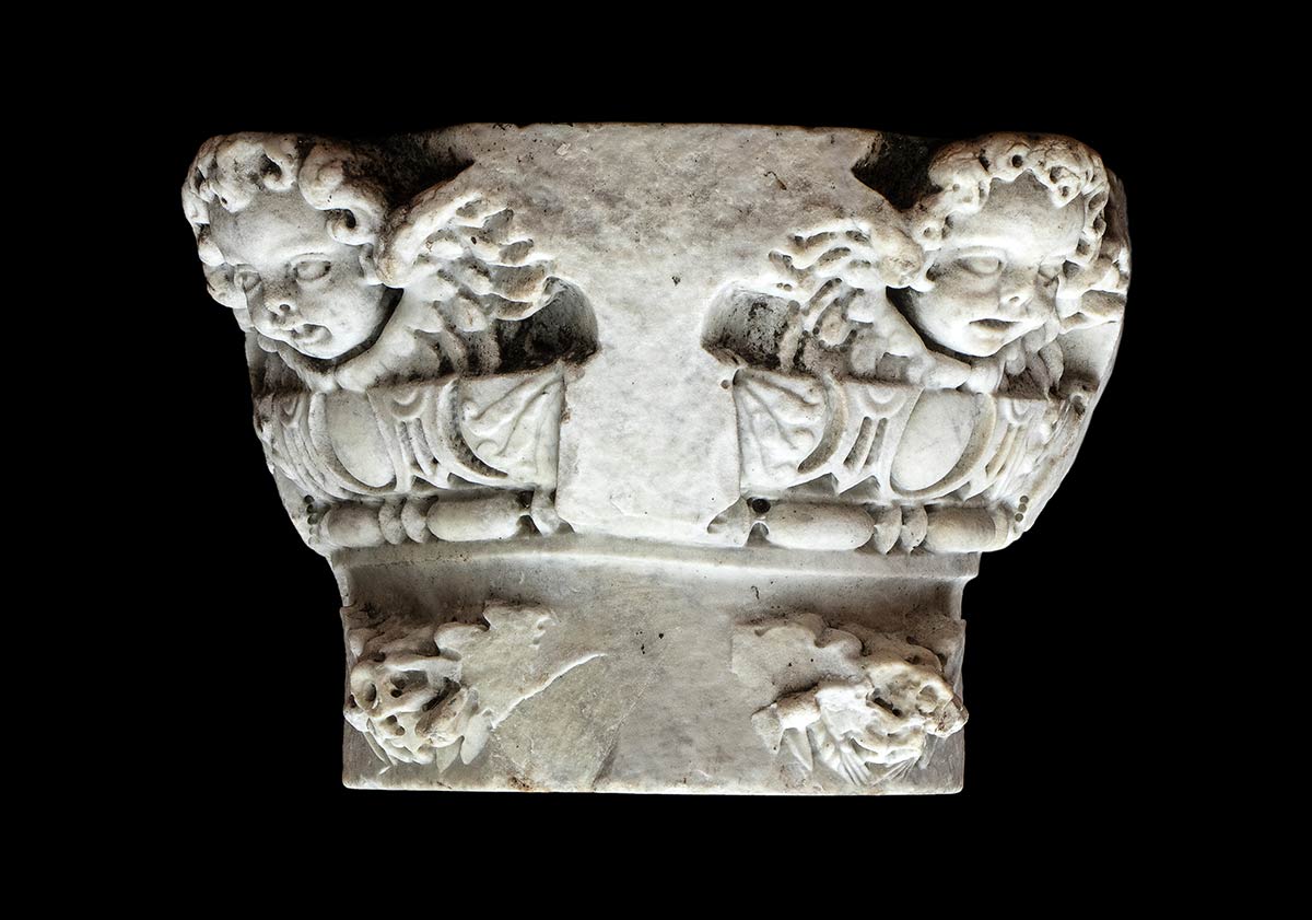 Capitello ionico composito, con festoni che dipartono dalle girali e putti alati. Leggera crepa sul piano dell'abaco e macchie di ossido ferro.