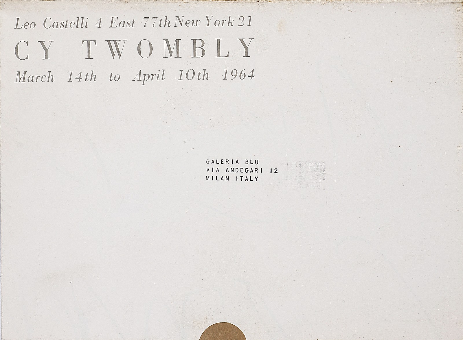 TWOMBLY CY (1928 - 2011) Senza titolo. Manifesto. Cm 48,00 x 70,00. Invito manifesto della mostra personale dell'artista tenuta presso la galleria Leo Castelli, New York, dal 14 marzo al 10 aprile 1964 (come riportato al retro) indirizzato alla galleria Blu, Via Andegari 12, Milano. . Cornice presente
