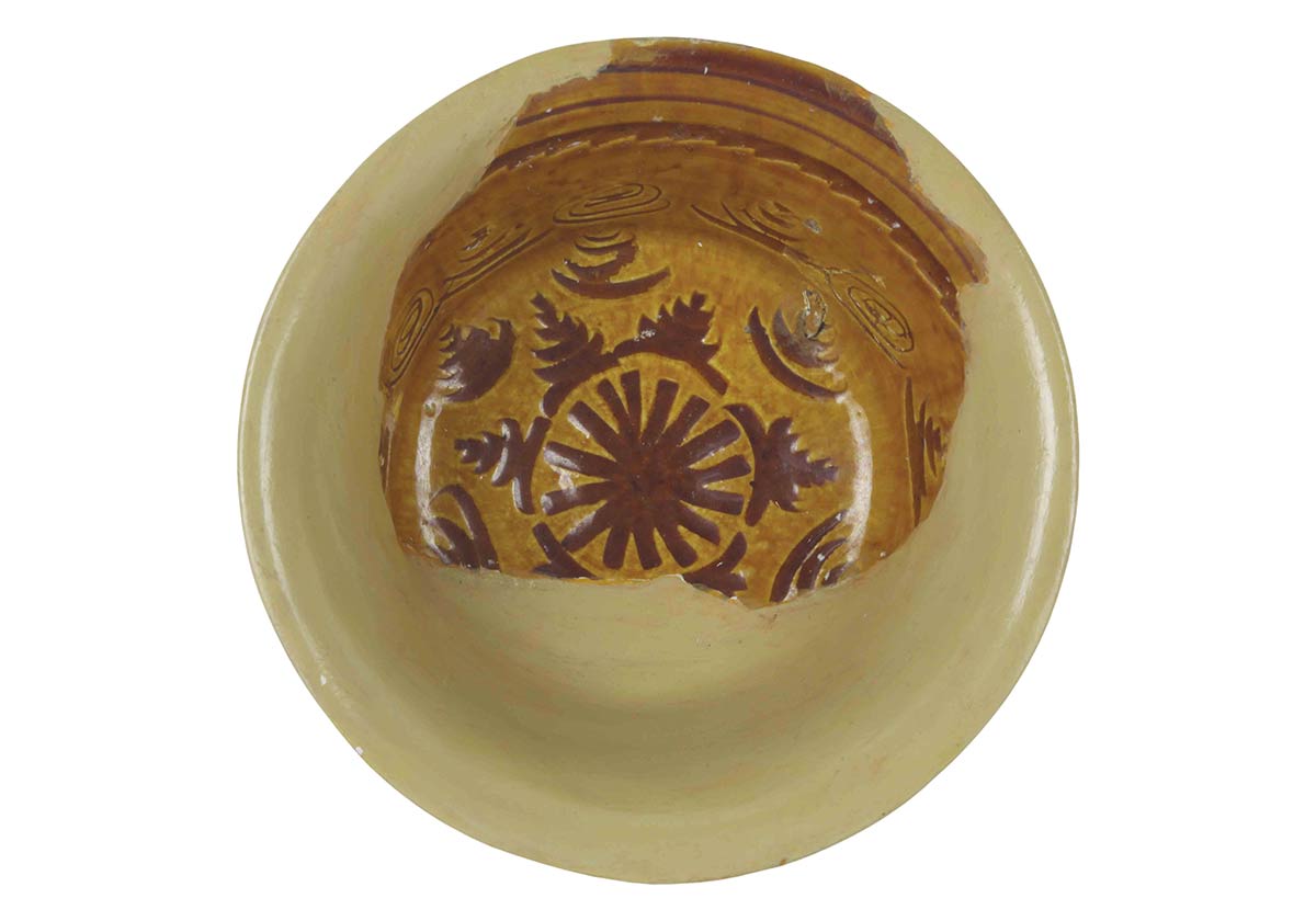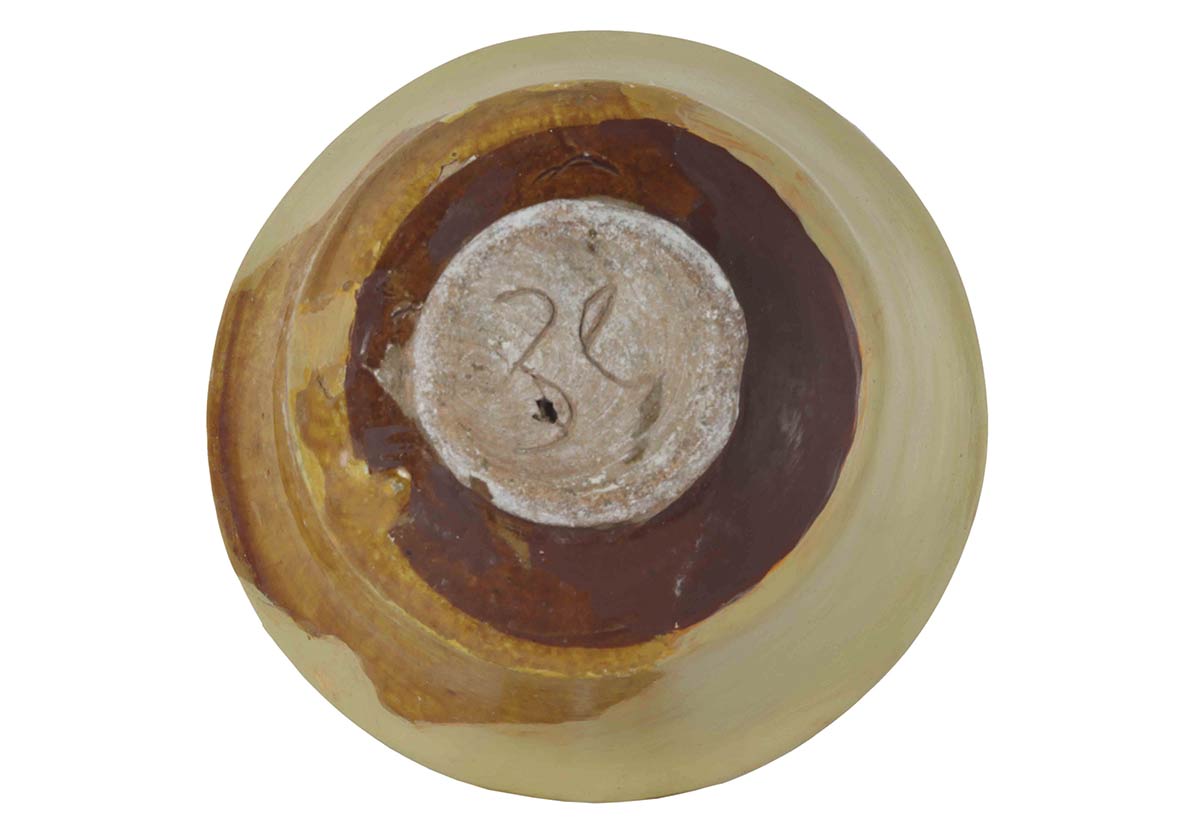 Oggetto da corredo di tipologia monastica postridentina propria del Seicento (R. Magnani, "La ceramica ferrarese tra Medioevo e Rinascimento", I-II, Ferrara 1982). Lettere graffite sul fondo; evidente restauro integrativo.