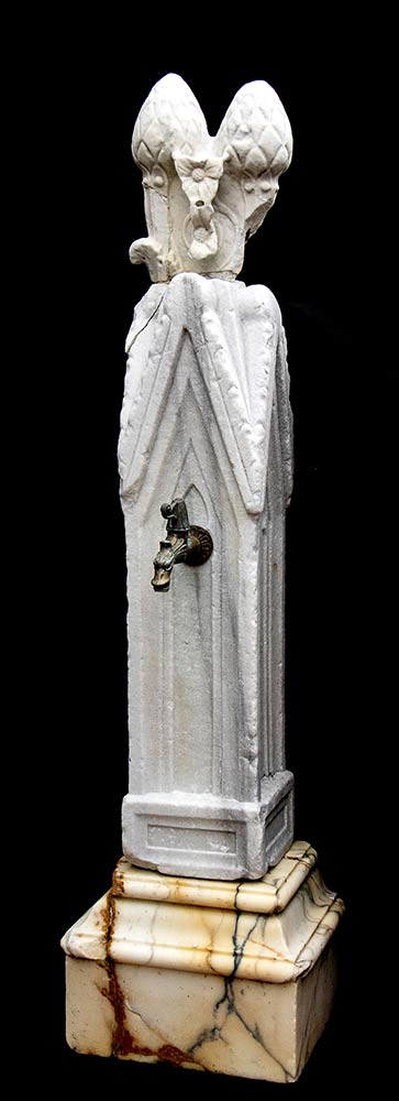 Fontana/pastiche del tipo vedovella realizzata unendo varie decorazioni marmoree di epoca romana e medievale. La base è in marmo giallo antico, il fusto è composto da una guglia presumibilmente di epoca medievale, infine a coronamento sono pigne di epoca romana scolpite in marmo lunense tra fiori e girali di acanto. Crepa passante in alto a sinistra.