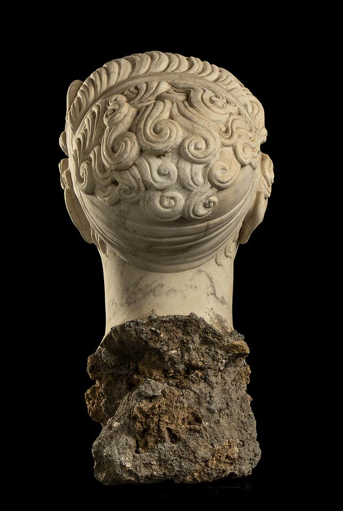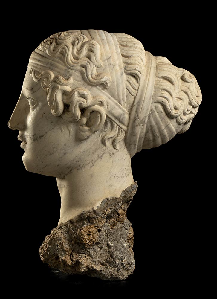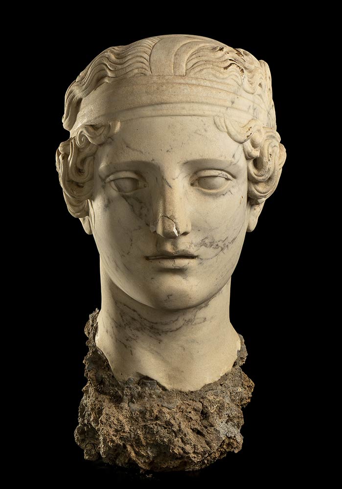 In stile greco, con capelli raccolti nel sakkos. Base di malta.