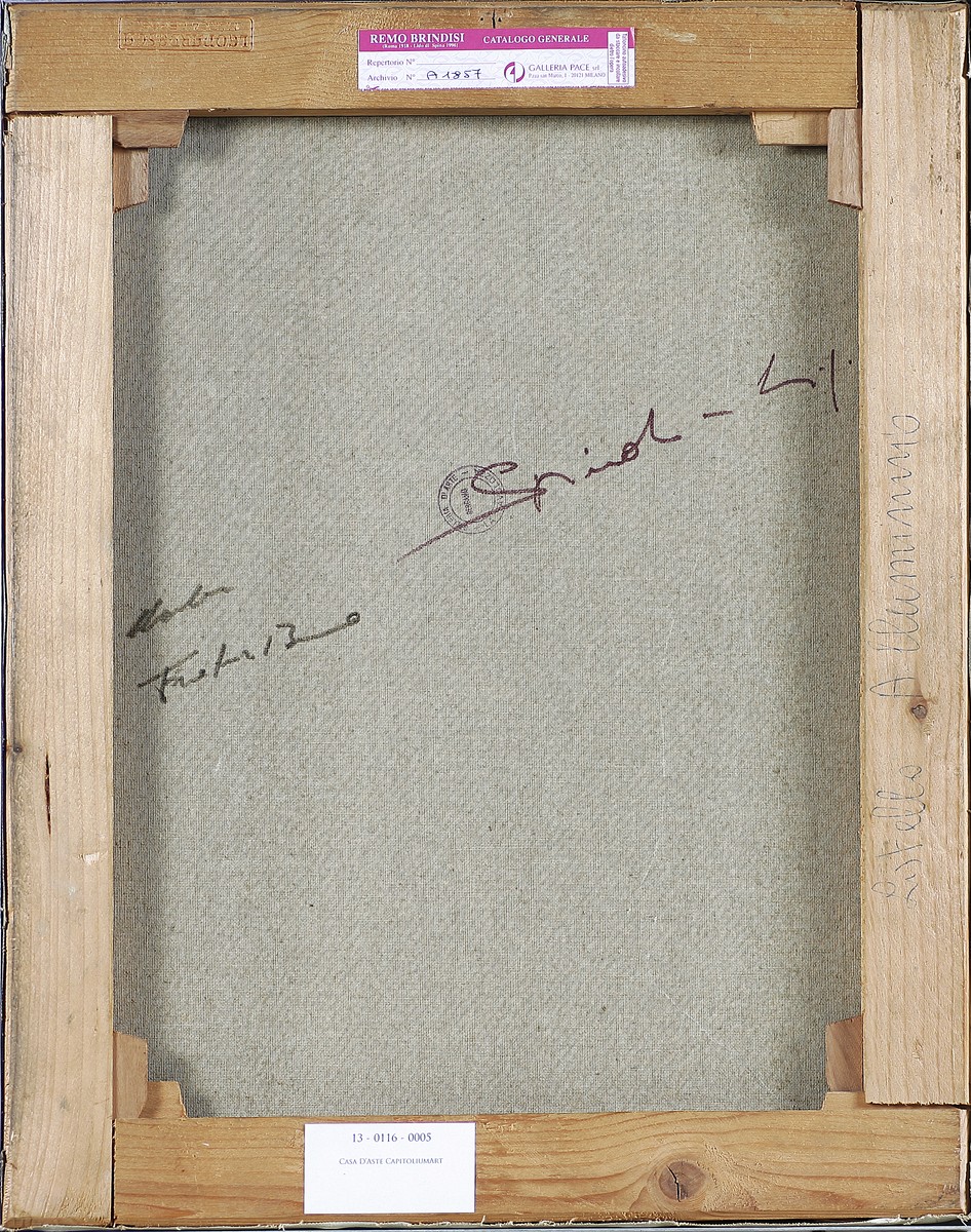 BRINDISI REMO (1918 - 1996) Senza titolo. Tempera su carta intelata. Cm 40,00 x 50,00. Firma in basso a destra. Al retro reca il timbro della galleria d'arte La Tavolozza, Bergamo e il cartiglio del Catalogo Generale Remo Brindisi, Galleria Pace, Milano. Opera archiviata presso il Catalogo Generale Remo Brindisi, a cura della Galleria Pace, come da documentazione fotografica riportante il relativo numero d'inventario. Cornice presente