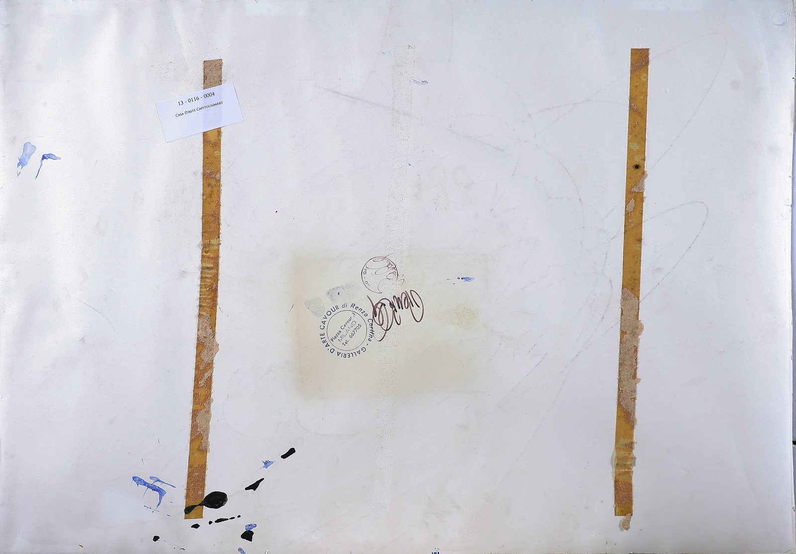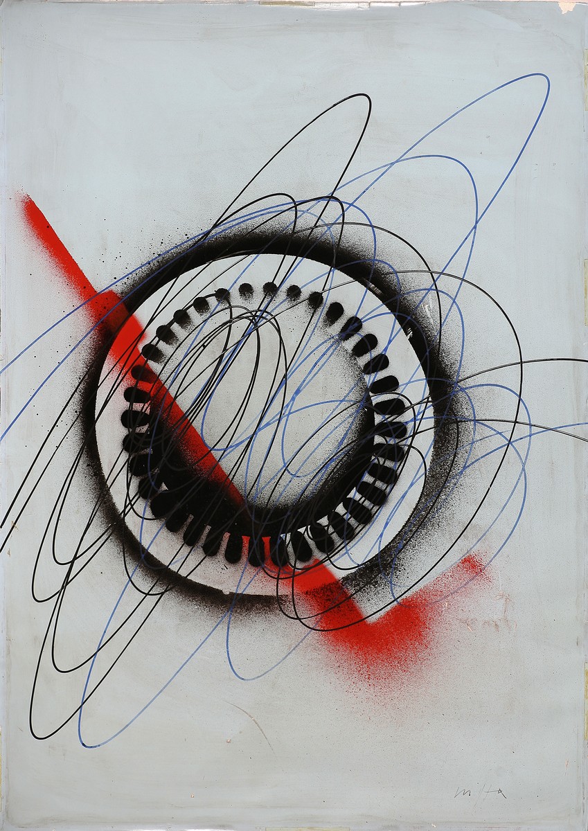 CRIPPA ROBERTO (1921 - 1972) Spirale con ingranaggio. Acrilico su cartoncino. Cm 49,50 x 70,00. Perdite di colore nella parte centrale e in quella inferiore. Firma in basso a destra. Al retro riporta il timbro della galleria d'arte Cavour, di Renzo Cortina, Milano. Opera archiviata presso il Catalogo Generale delle opere del Maestro Roberto Crippa, a cura della Galleria Pace, Milano, come da documentazione fotografica allegata all'opera riportante il relativo numero d'inventario.