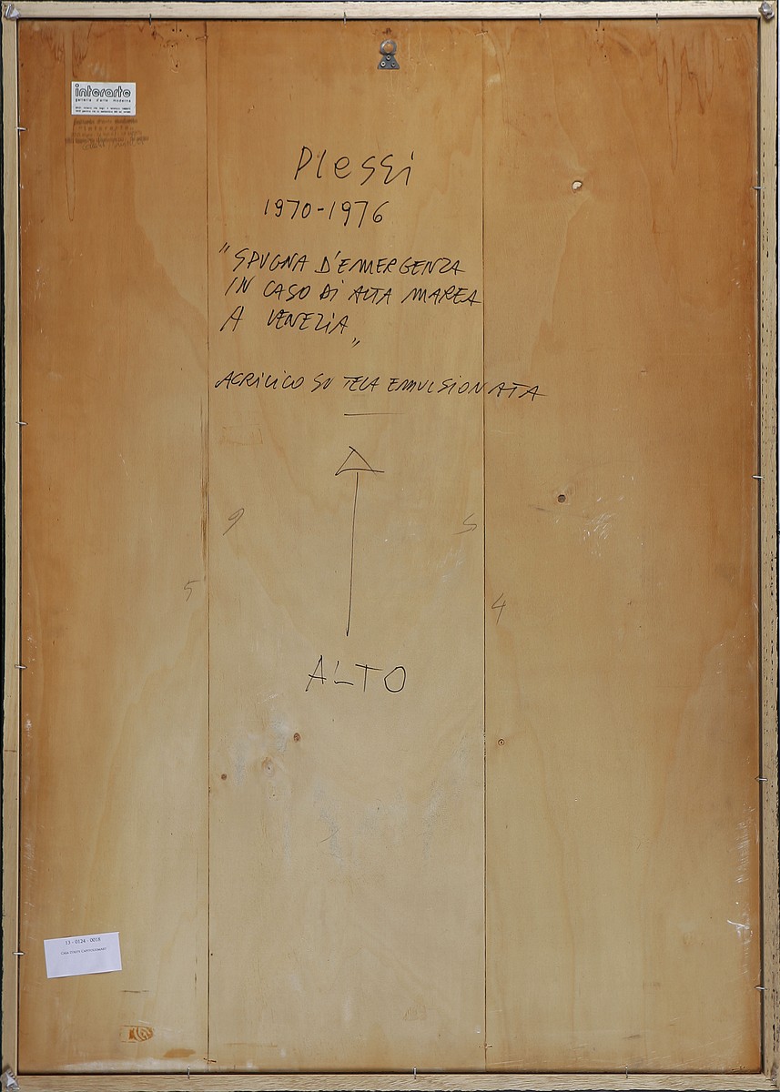 PLESSI FABRIZIO (n. 1940) Spugna d'emergenza in caso di alta marea a Venezia. 1970. Acrilico su tela emulsionata riportata su tavola. Cm 70,00 x 100,00. Dalla serie degli interventi sul paesaggio urbano. Firma in basso a destra. Al retro firma, titolo, data e cartiglio della Galleria d'arte Interarte di Milano e Genova. Cornice presente