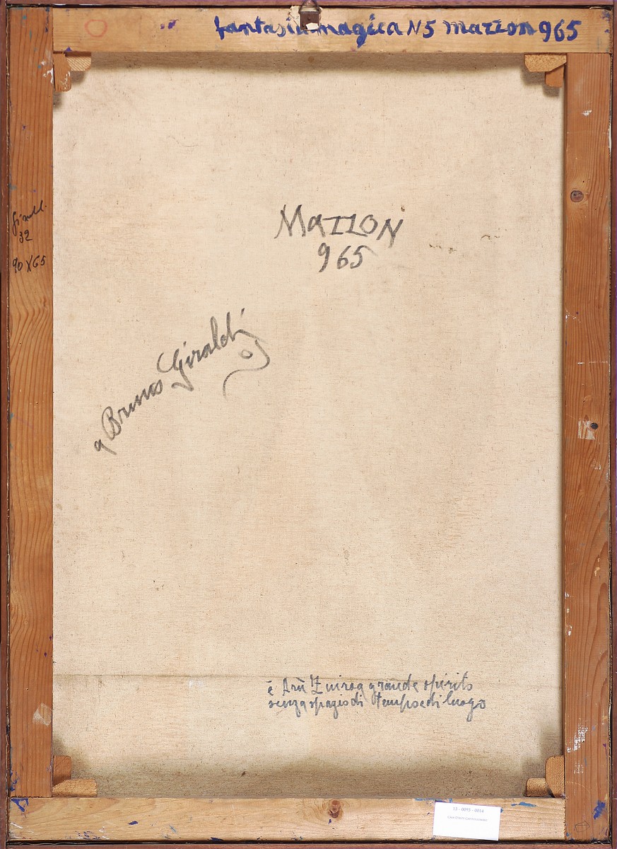 MAZZON GALLIANO (1896 - 1978) Fantasia magia n.5. 1965. Olio su tela . Cm 65,00 x 90,00. Firma e anno in basso a destra. Al retro Titolo firma anno e dedica a Bruno Giraldi. Restauri nella parte bianca in alto a sinistra e nella parte blu in basso a destra.