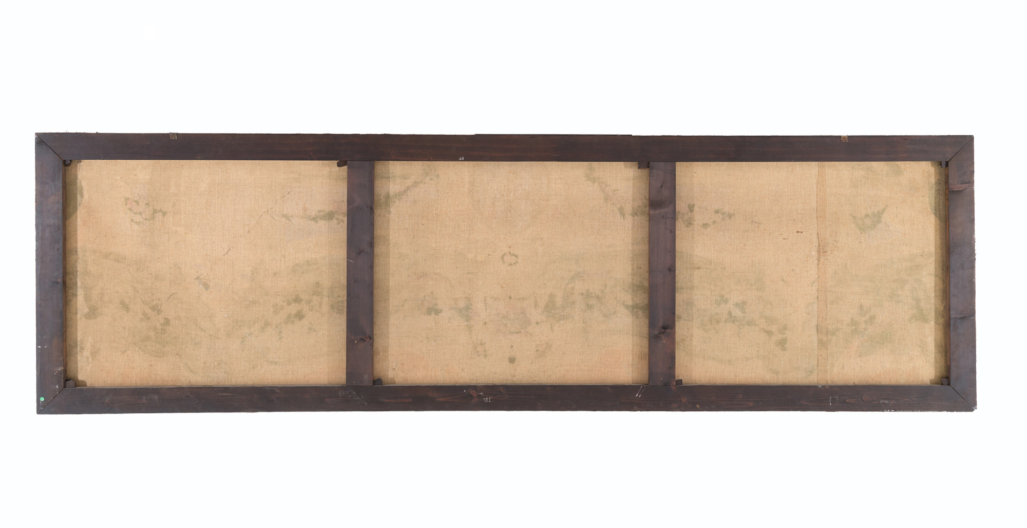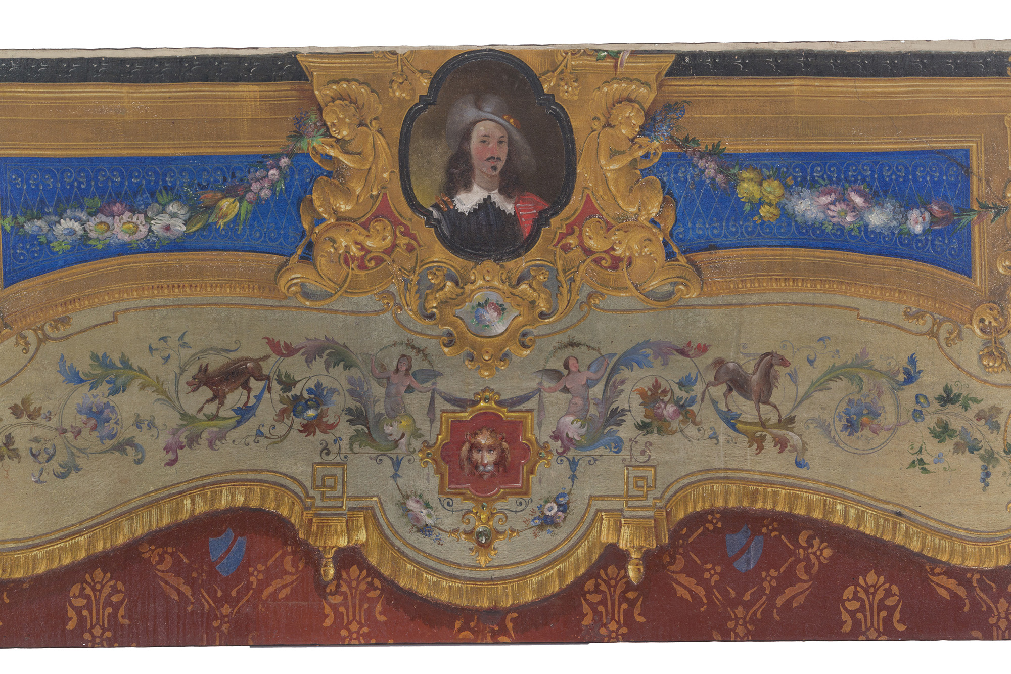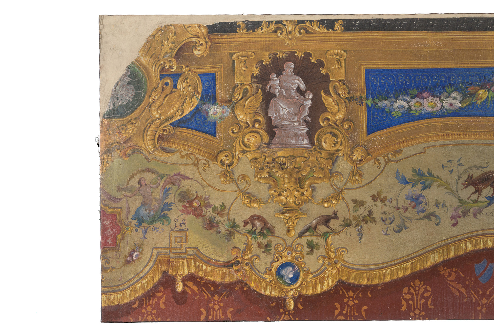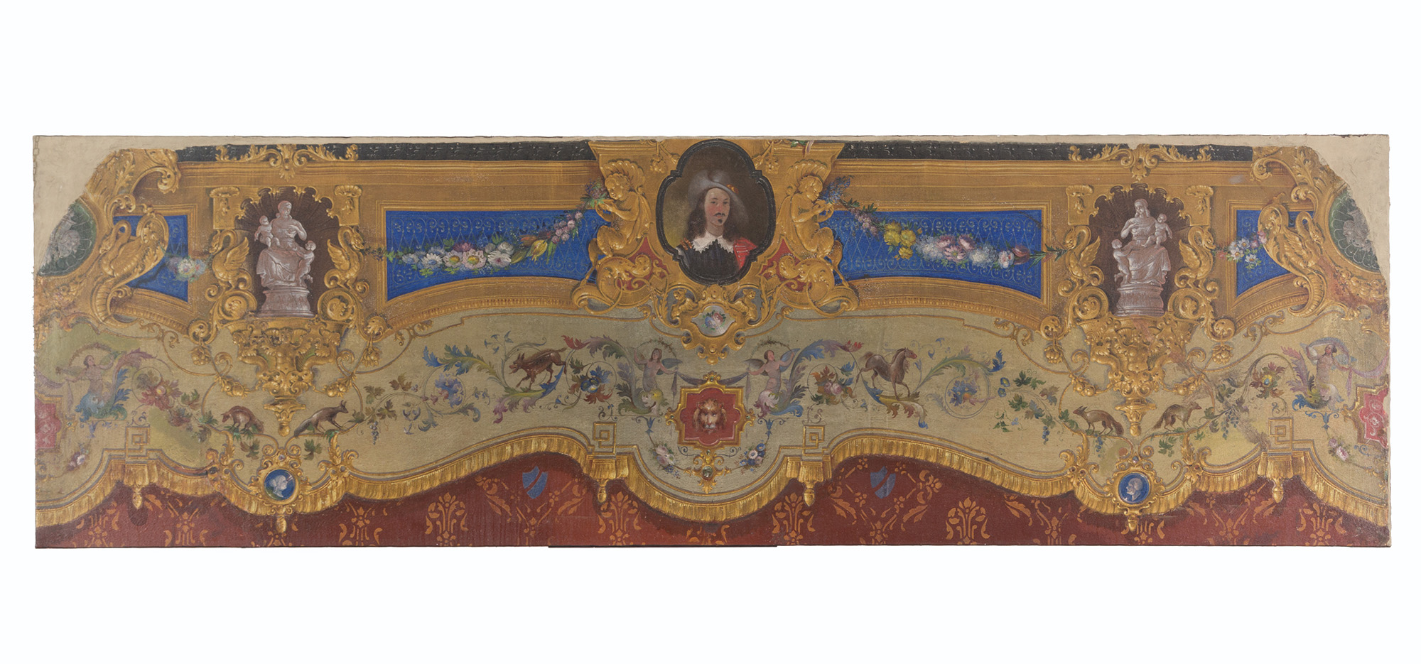 Dipinto olio su tela raff. ''FESTONI CON GHIRLANDE DI FIORI, ANIMALI E DECORAZIONI A TROMPE L'OEIL''. Inizi XIX secolo. Mis. Lung. cm. 350 Alt. cm. 105 ca.