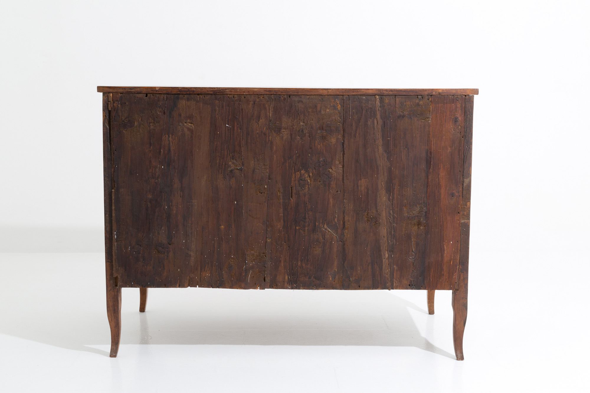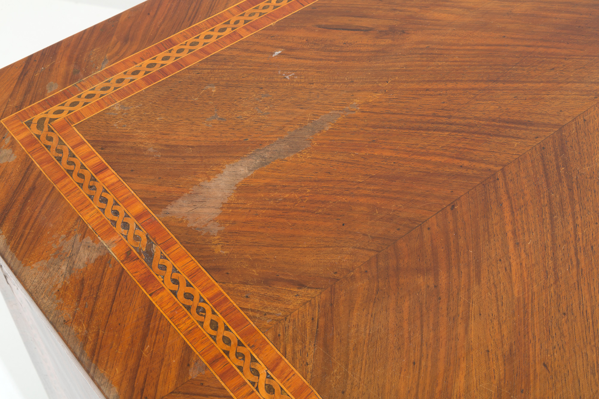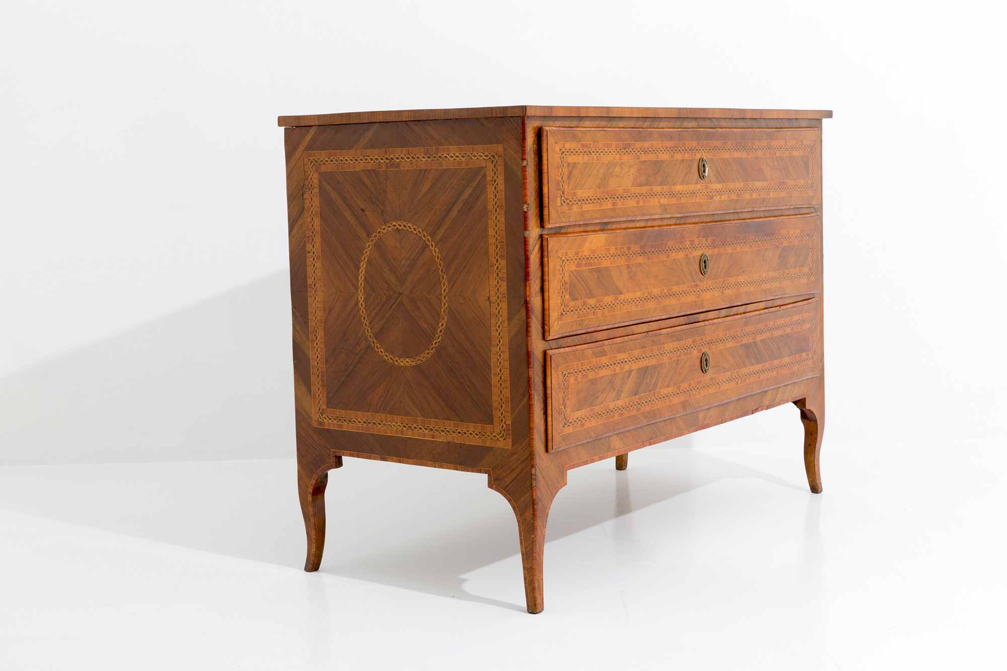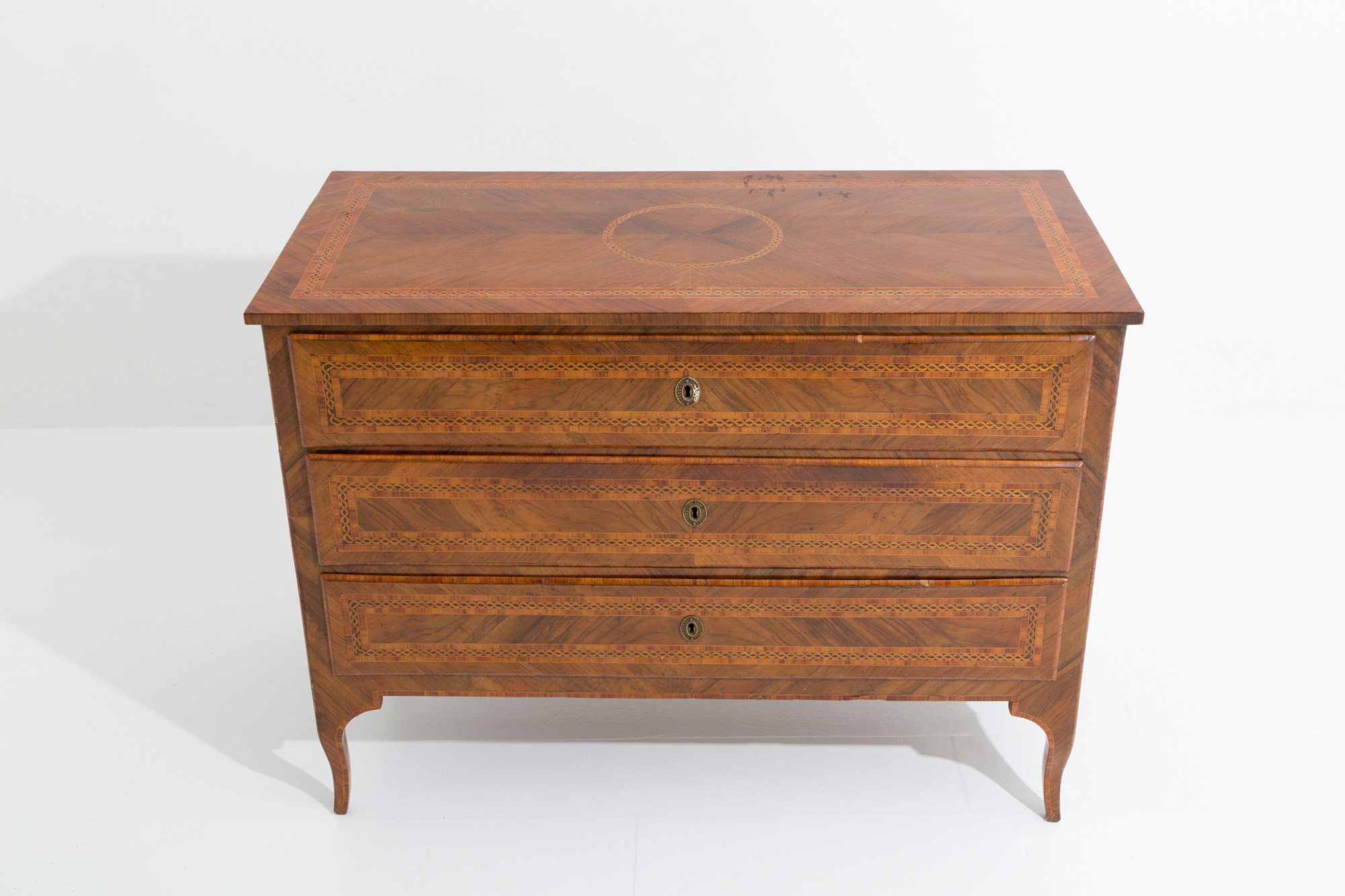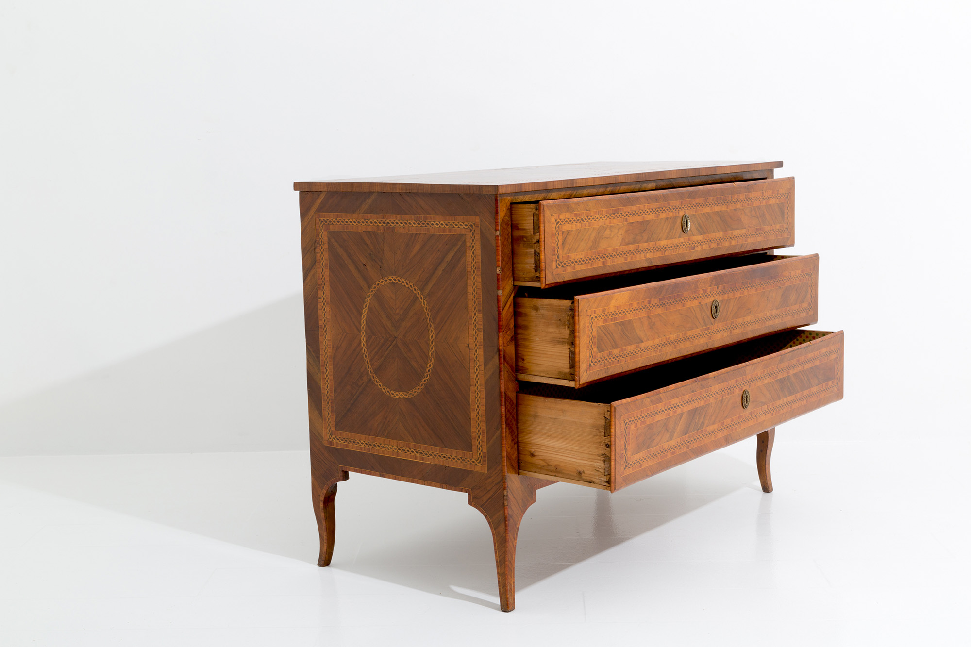 Comò lastronato e intarsiato in legni vari con tre cassetti. Periodo Luigi XVI. Lievi difetti e piano non coevo. Mis. Lung. cm. 120.5 Alt. cm. 89.5 Prof. cm. 59 ca.