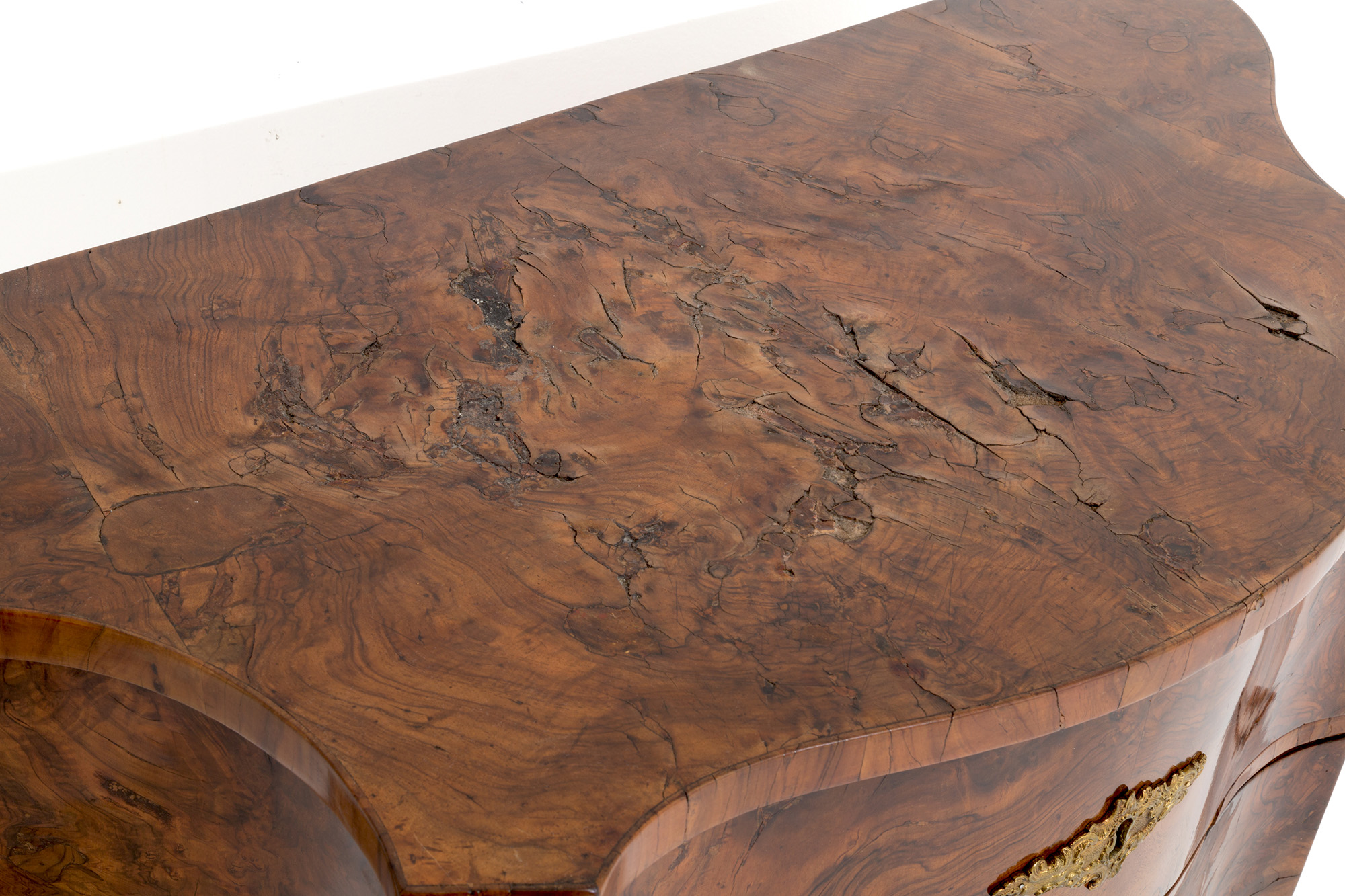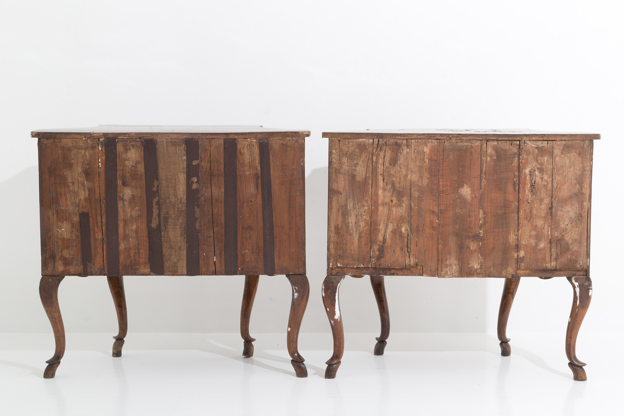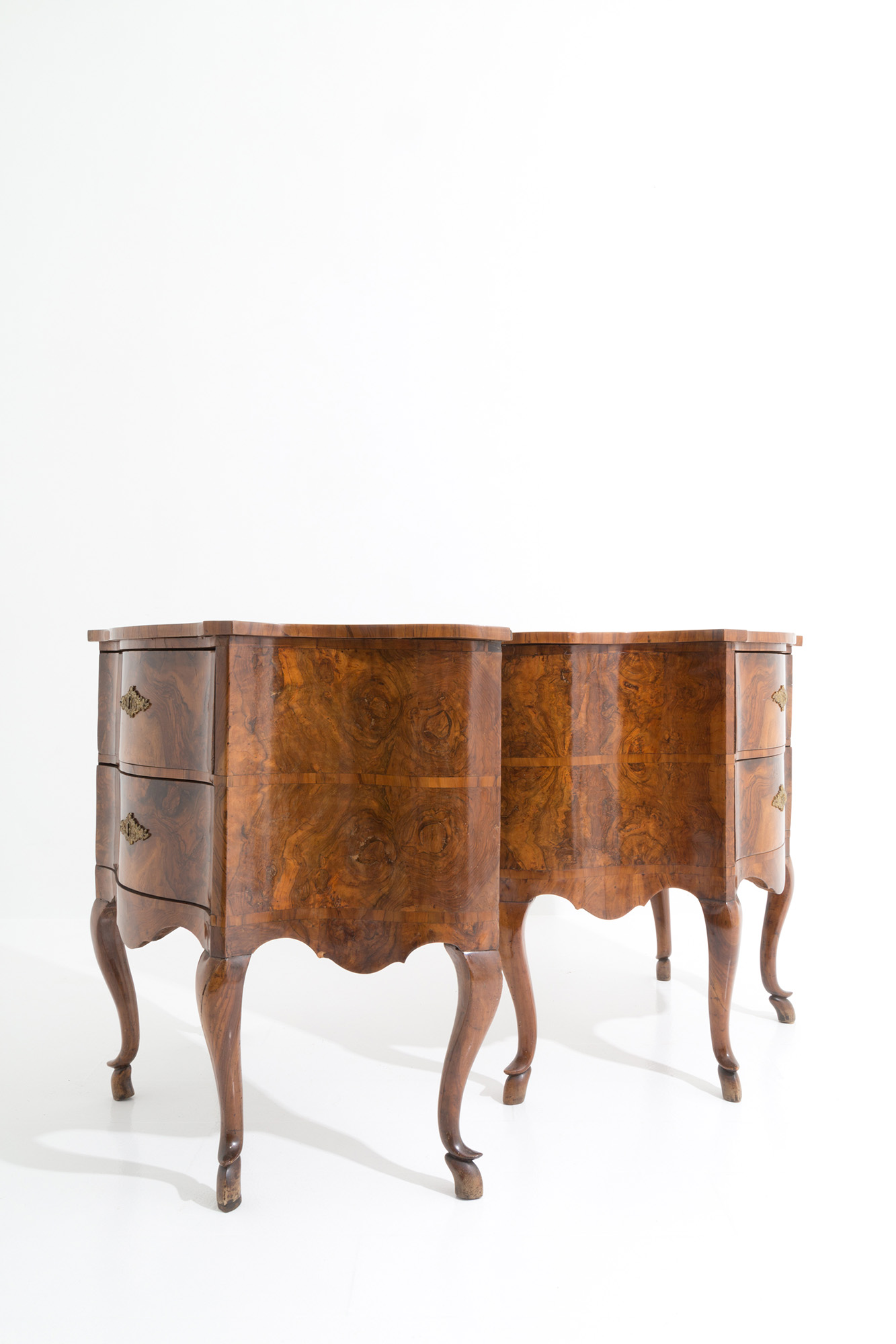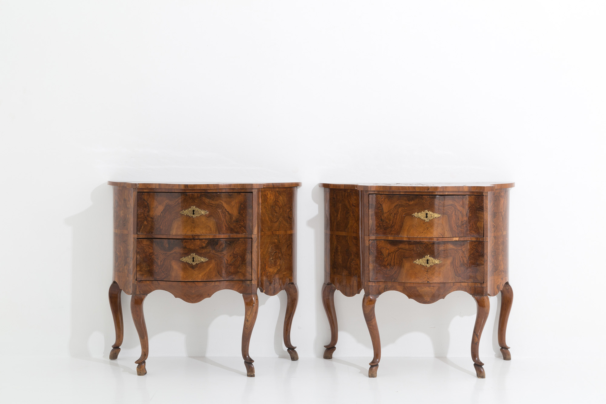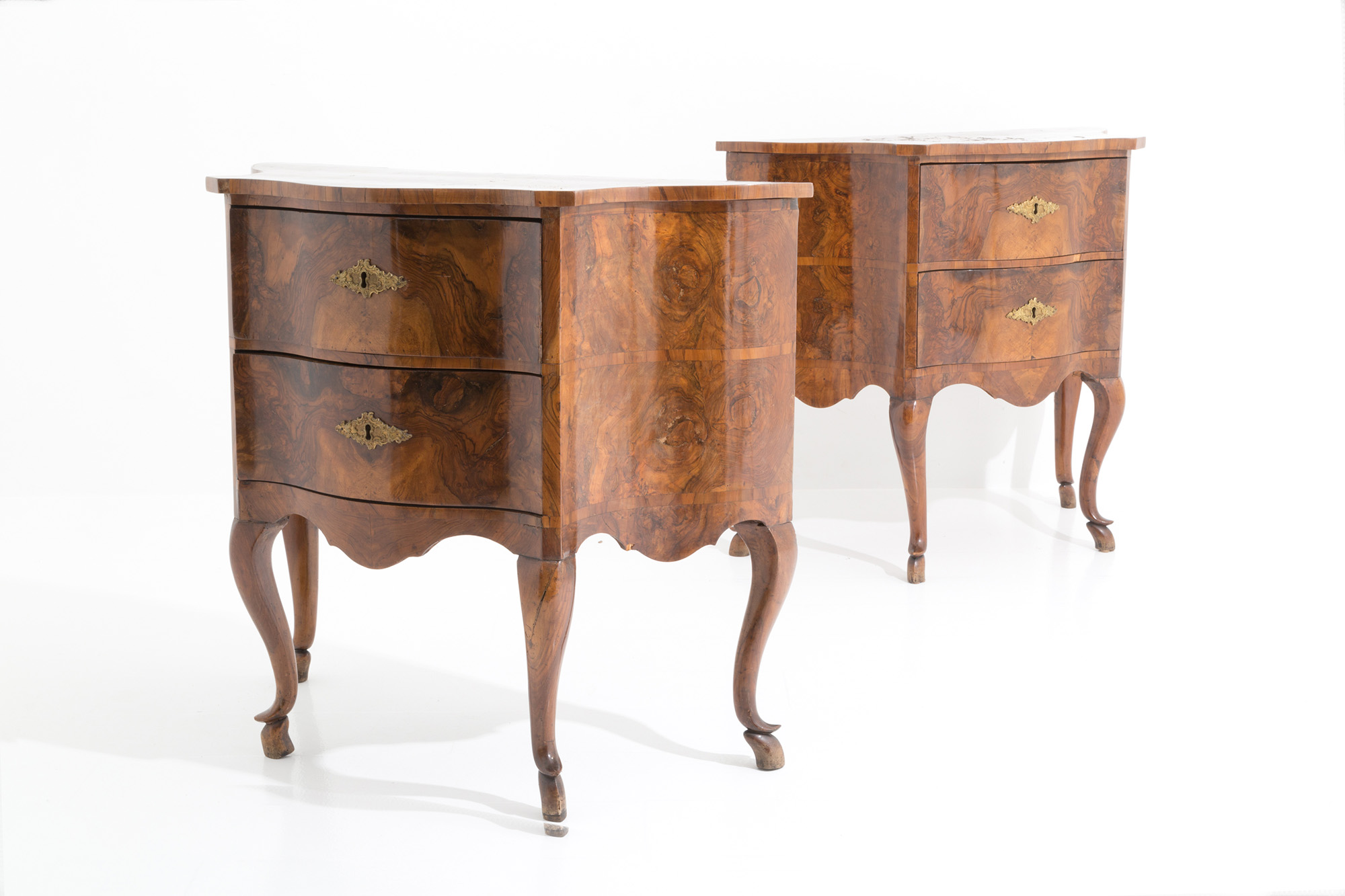 Coppia di piccoli comò lastronati in radica di noce con fronte e fianchi mossi. XVIII secolo. Ferrara. Difetti e restauri. Mis. Lung. cm. 96 Alt. cm. 89 Prof. cm. 45 ca.