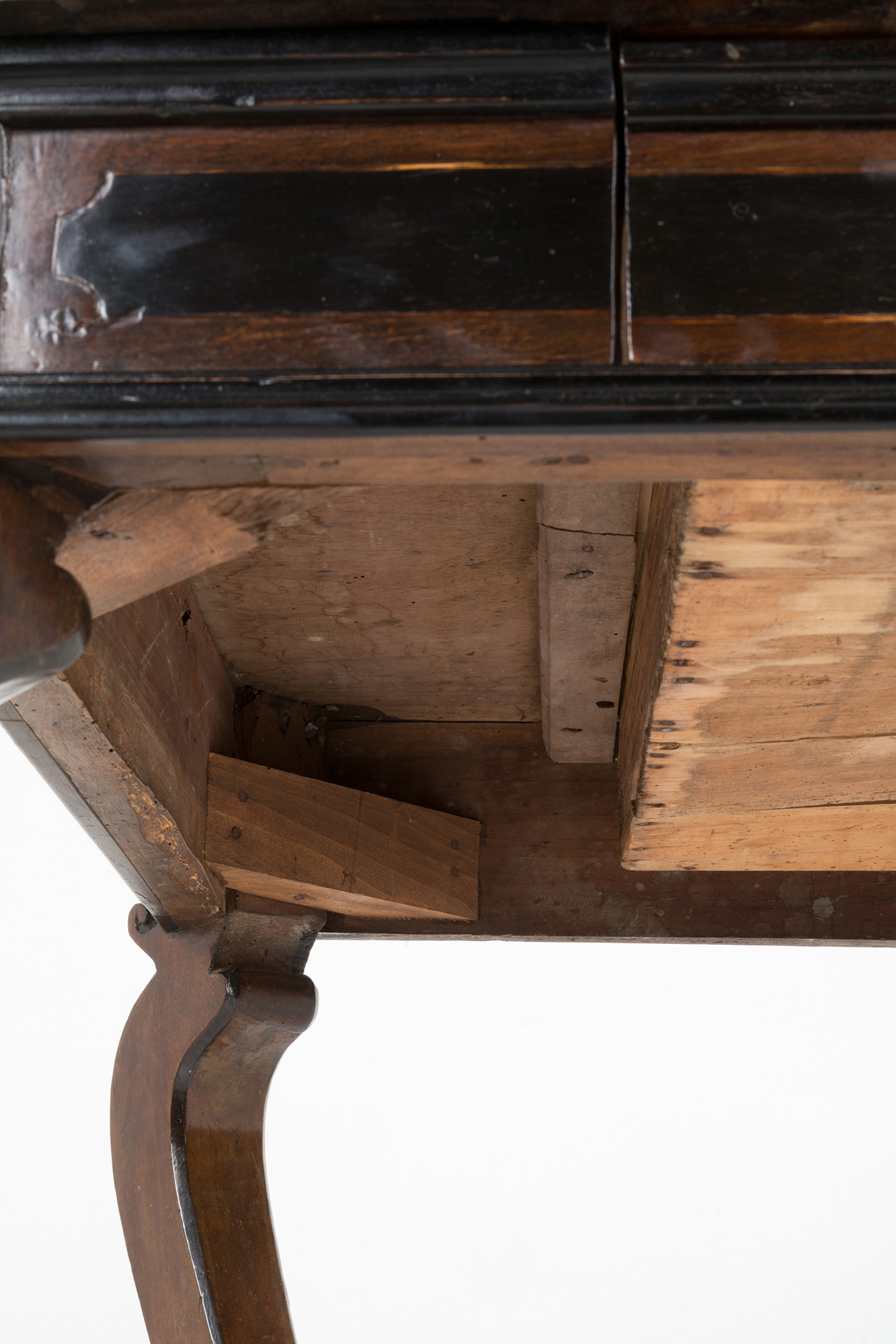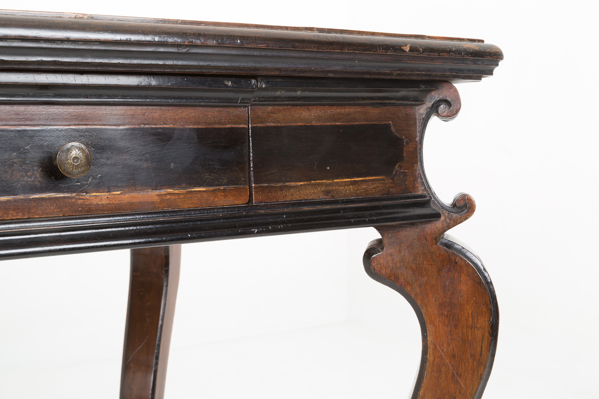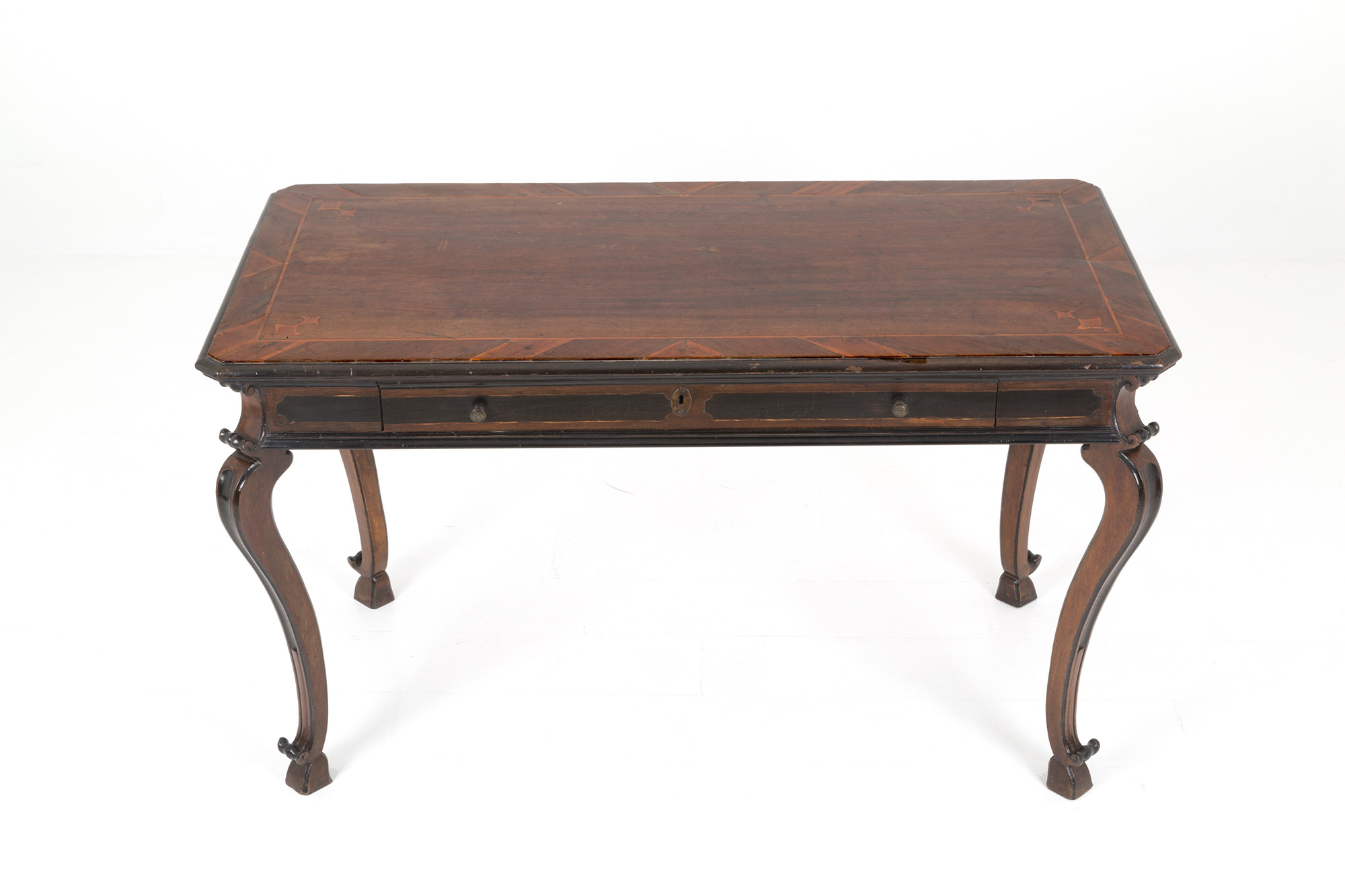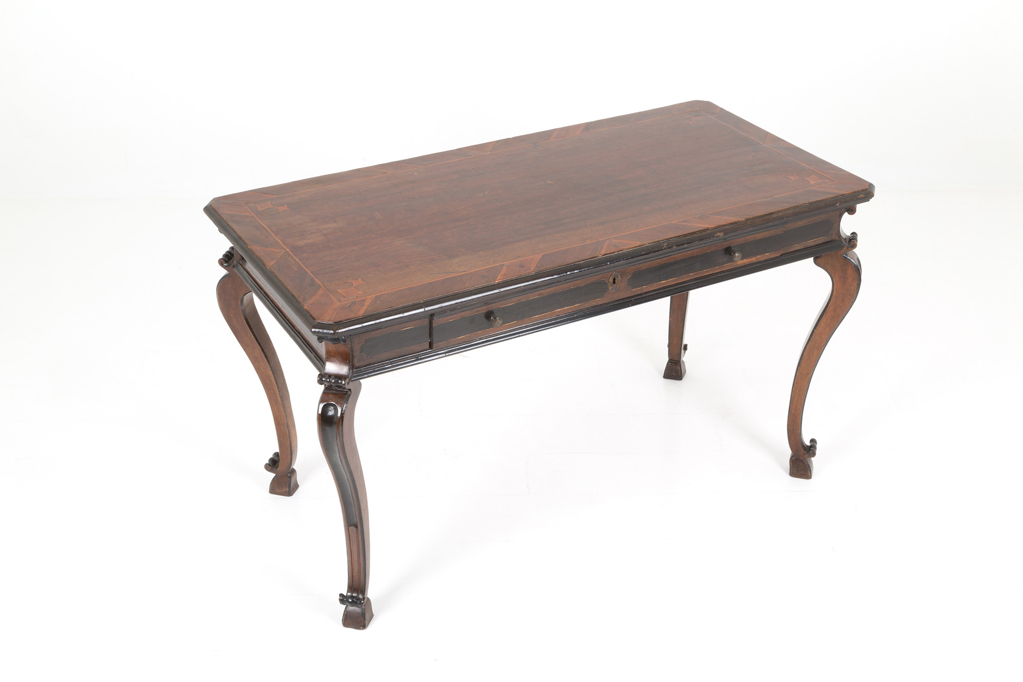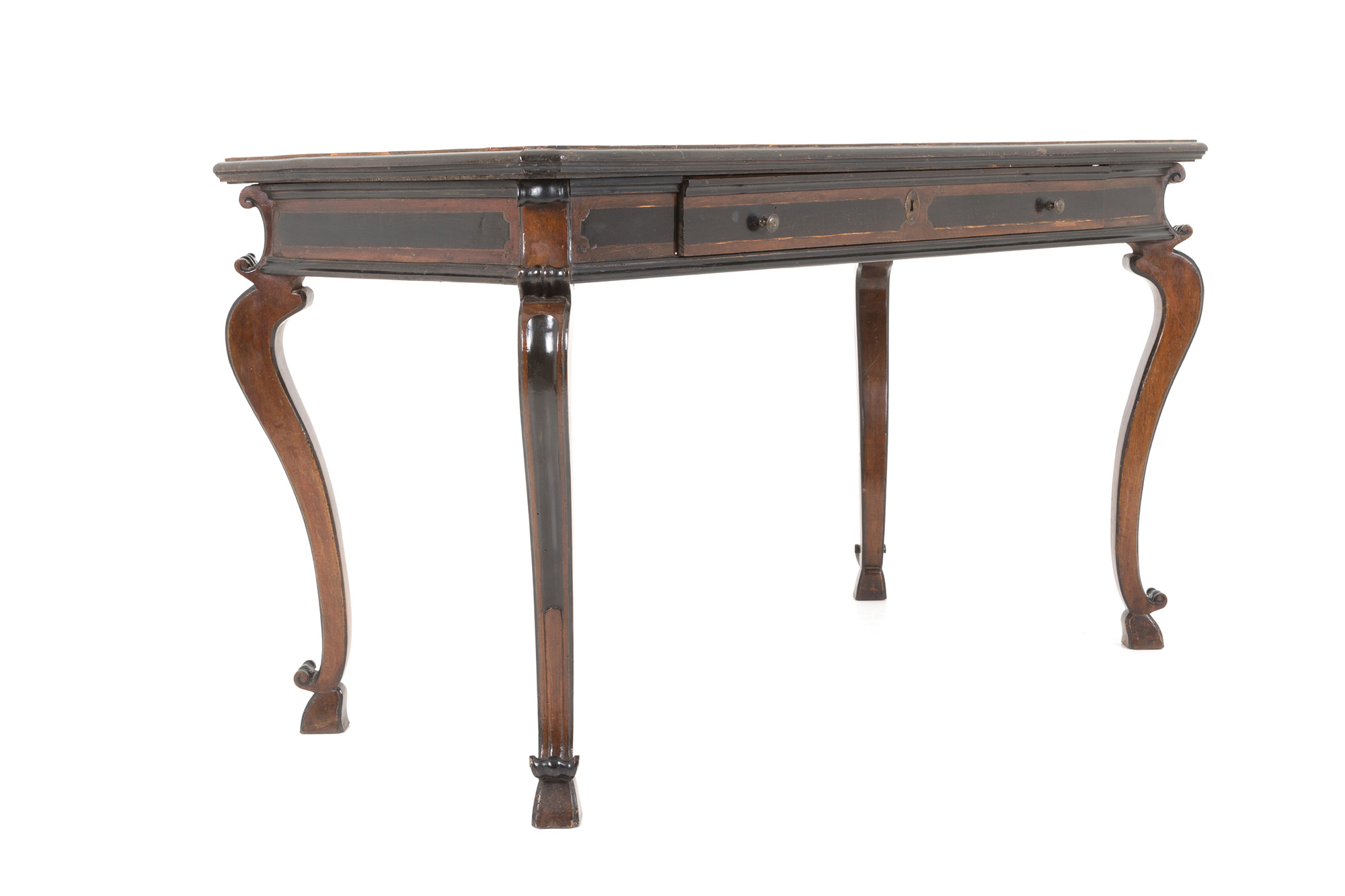 Scrittoio lastronato in noce e filettato in legno di bosso con finiture ebanizzate e gamba mossa. Lombardia. Inizi XVIII secolo. Ottime condizioni. Mis. Lung. cm. 146 Alt. cm. 83 Prof. cm. 74 ca.
