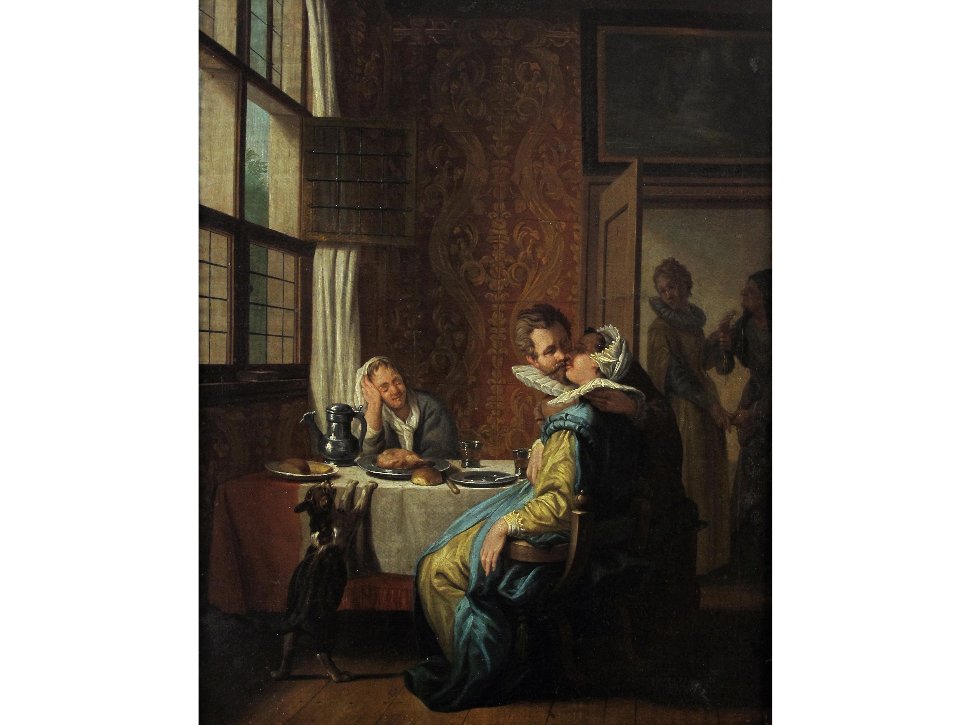 Scuola fiamminga (inizio XIX secolo) Corteggiamento Olio su tela Cornice...