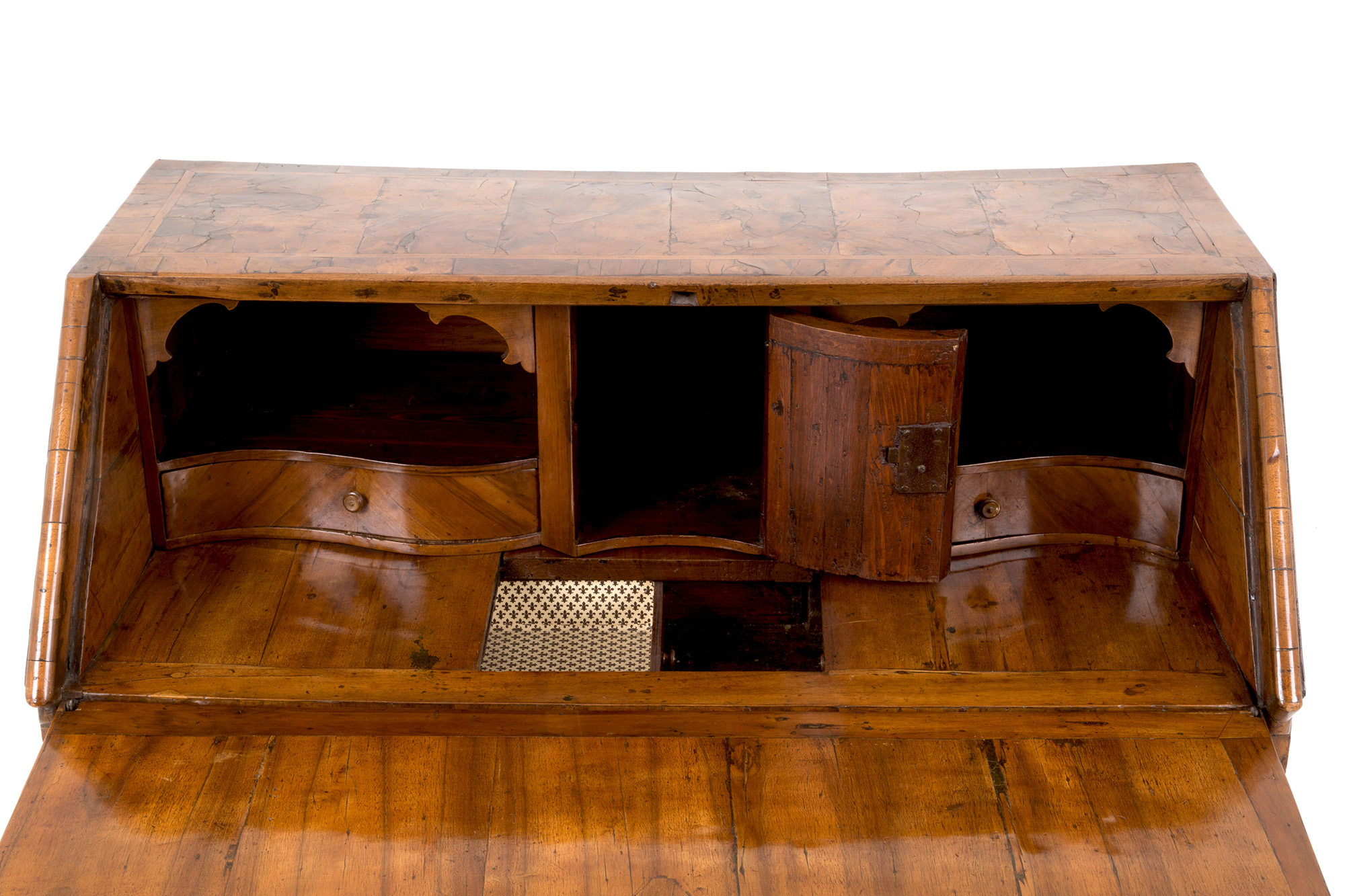 Ribalta lastronata in radica di noce biondo con cassetti a doppia mossa. Cassetti e segreto all'interno della calatoia. Veneto. XVIII secolo. Mis. Lung. cm. 107 Alt. cm. 104 Prof. cm. 57 ca.
