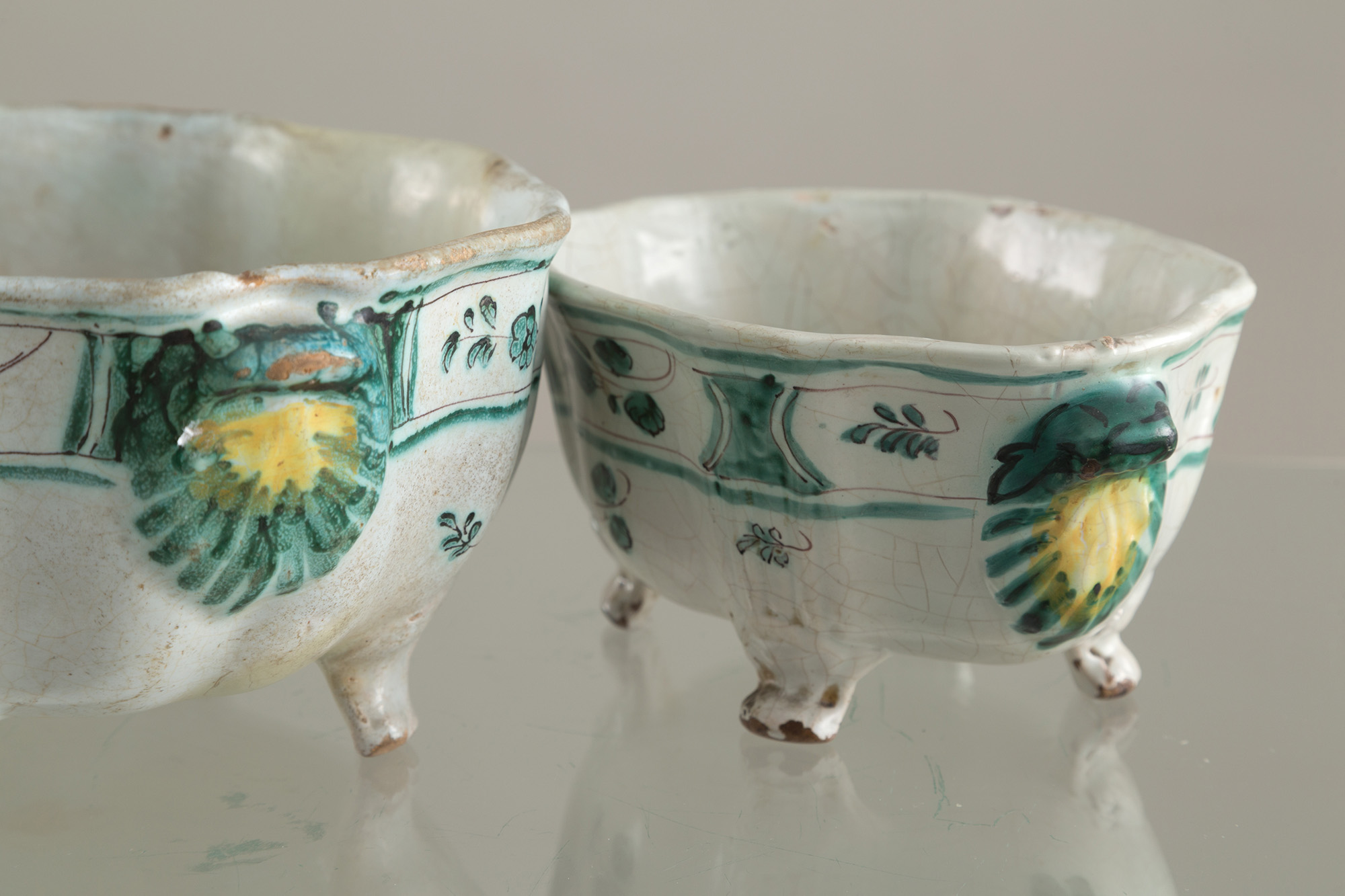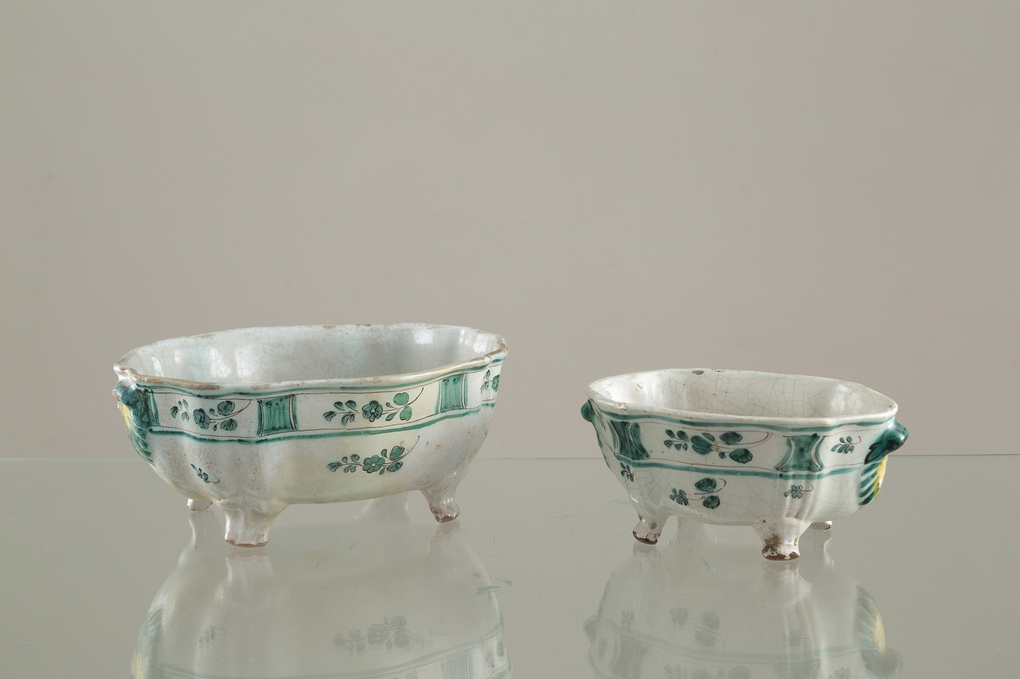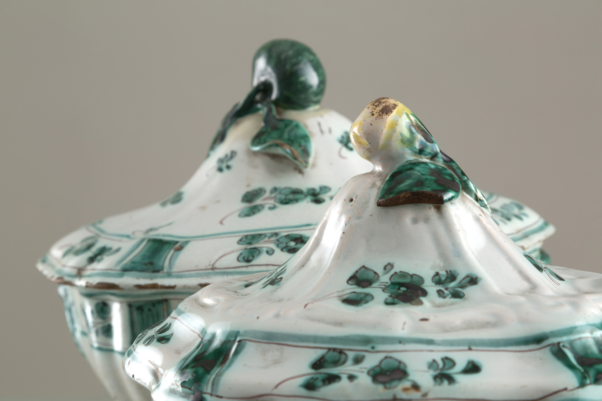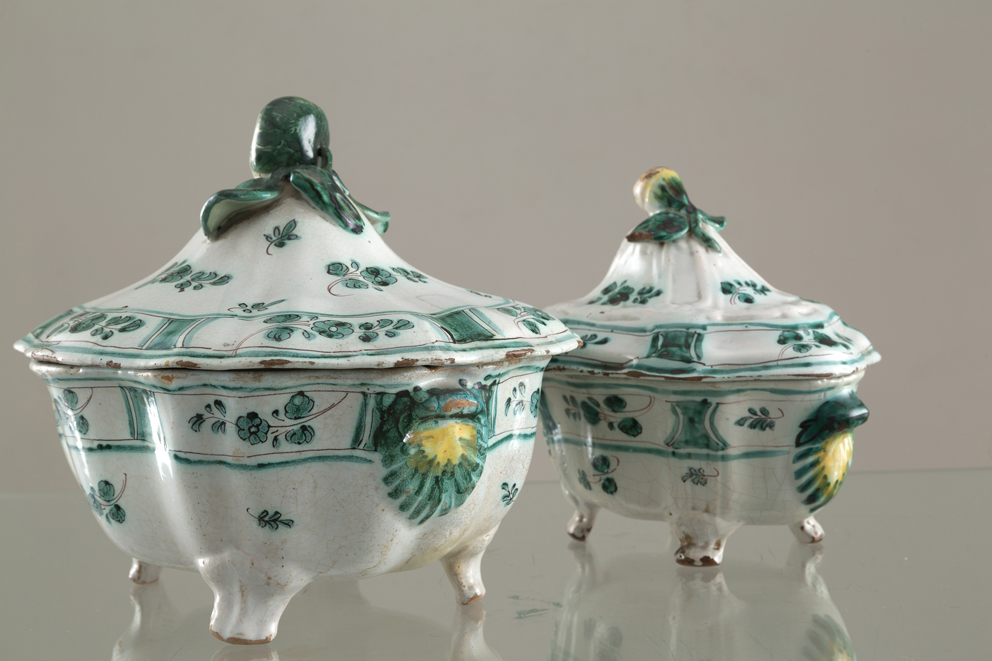 Due zuppiere in maiolica di Cerreto. XVIII secolo. Difetti. Mis. Lung. cm. 27, Alt. cm. 22, Prof. cm. 22 ca Mis. Lung. cm. 22, Alt. cm. 18, Prof. cm. 17 ca.
