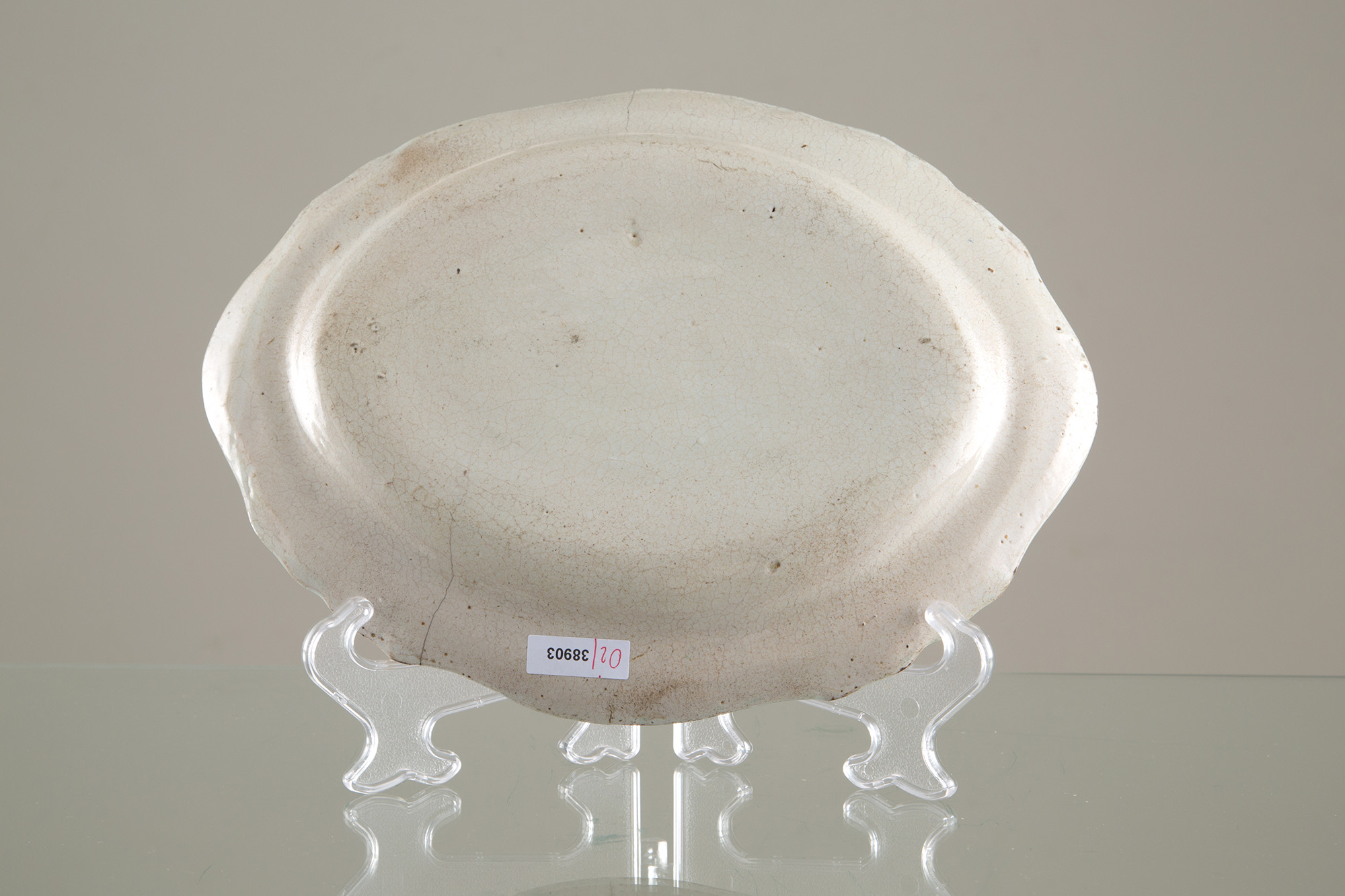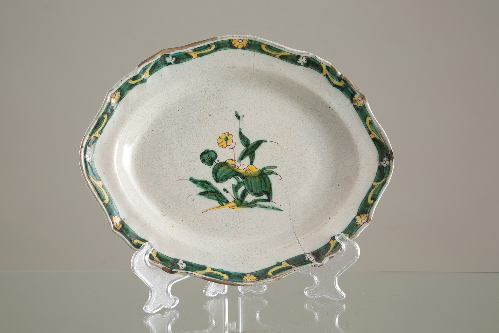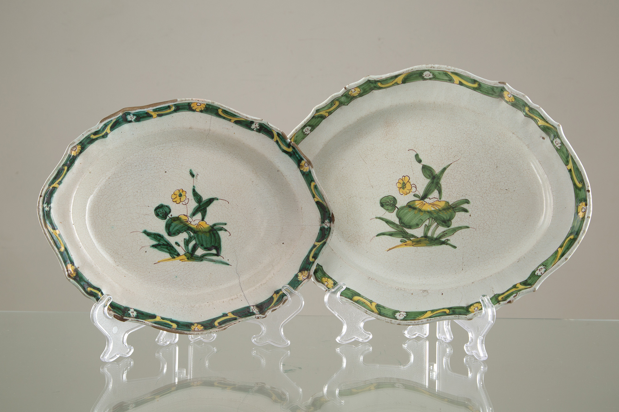 Due vassoi in maiolica di Cerreto. XVIII secolo. Difetti. Mis. Lung cm. 34, Prof. cm. 26 ca., Mis. Lung cm. 31, Prof. cm. 39 ca.