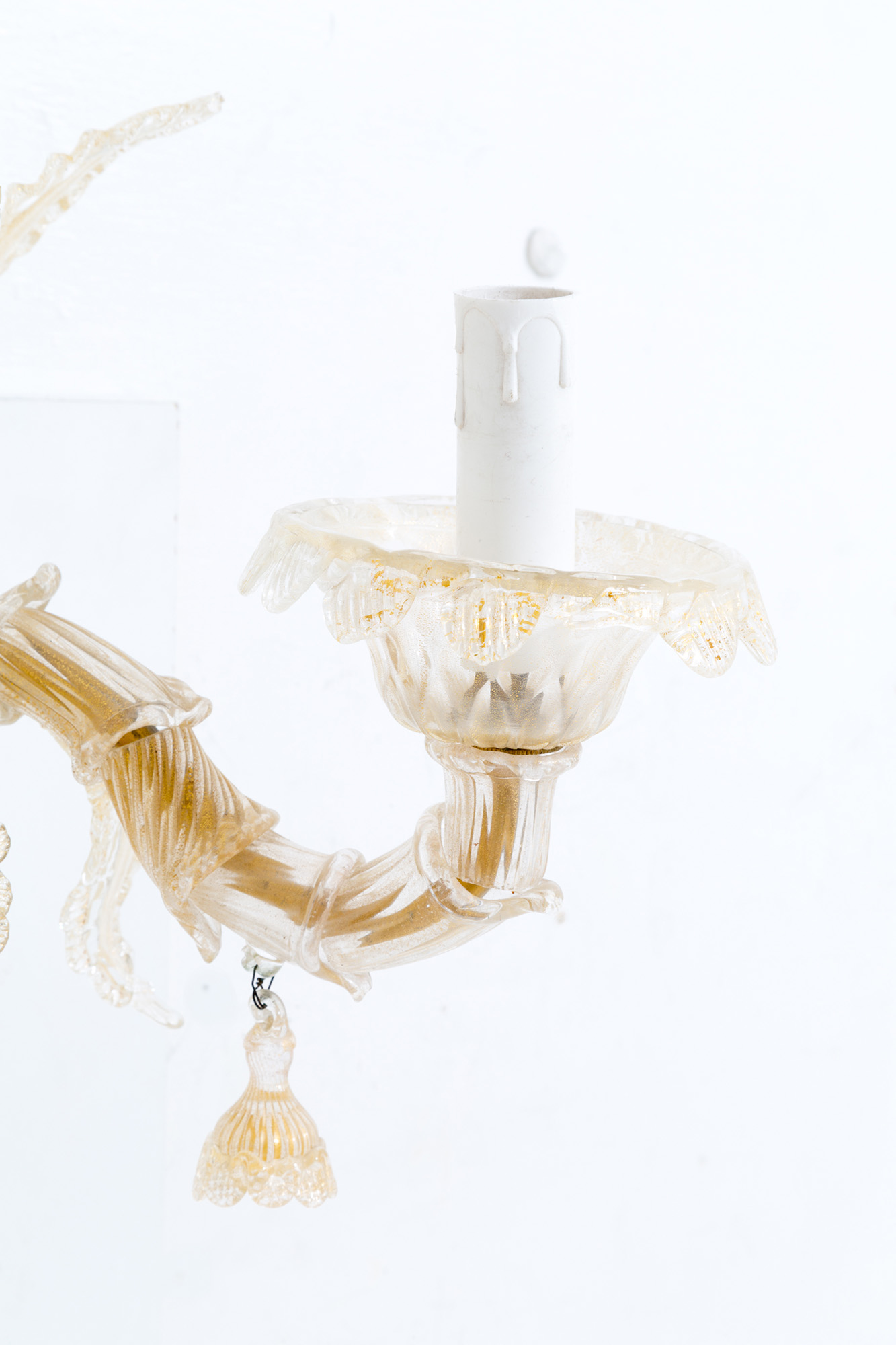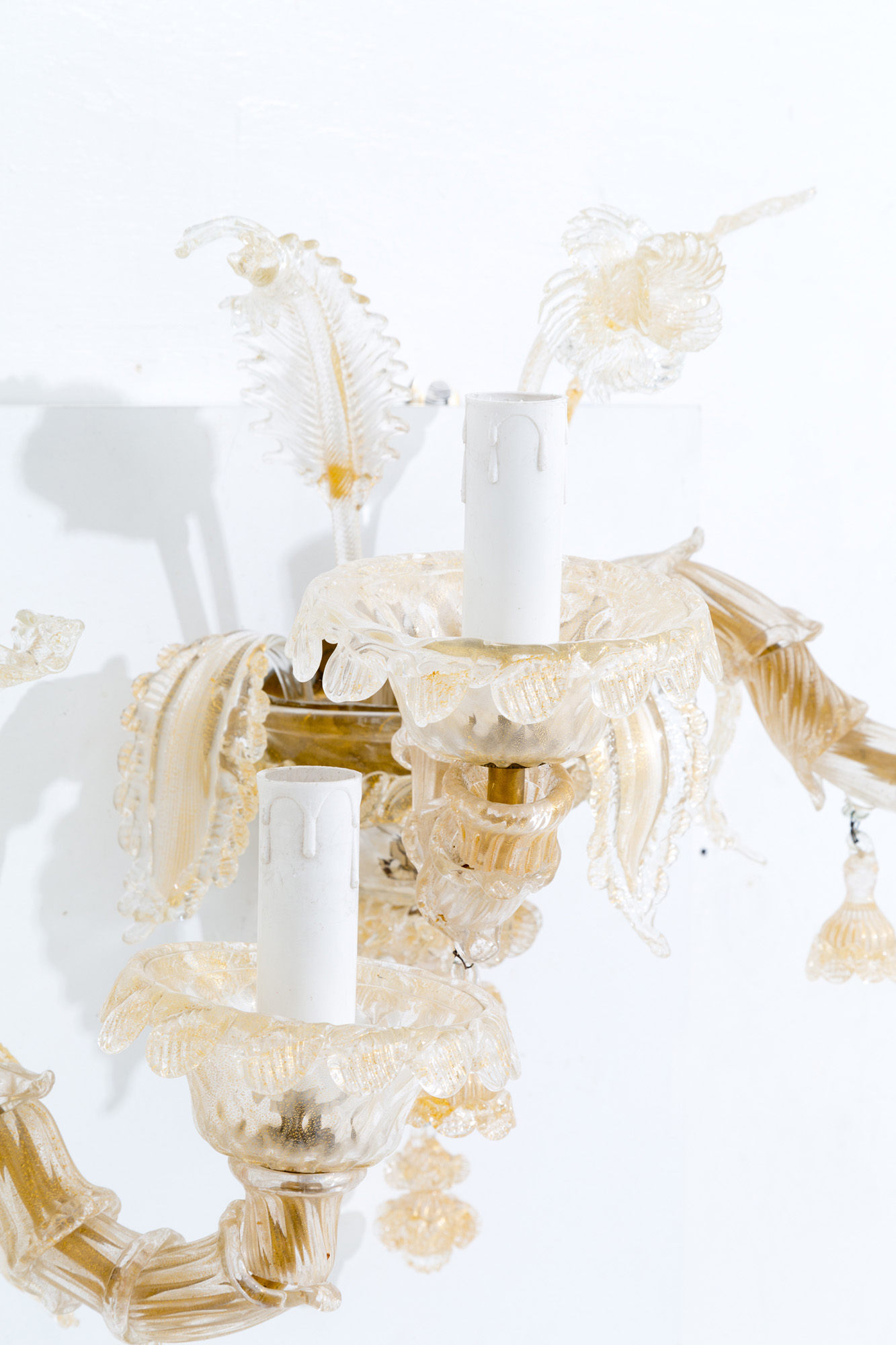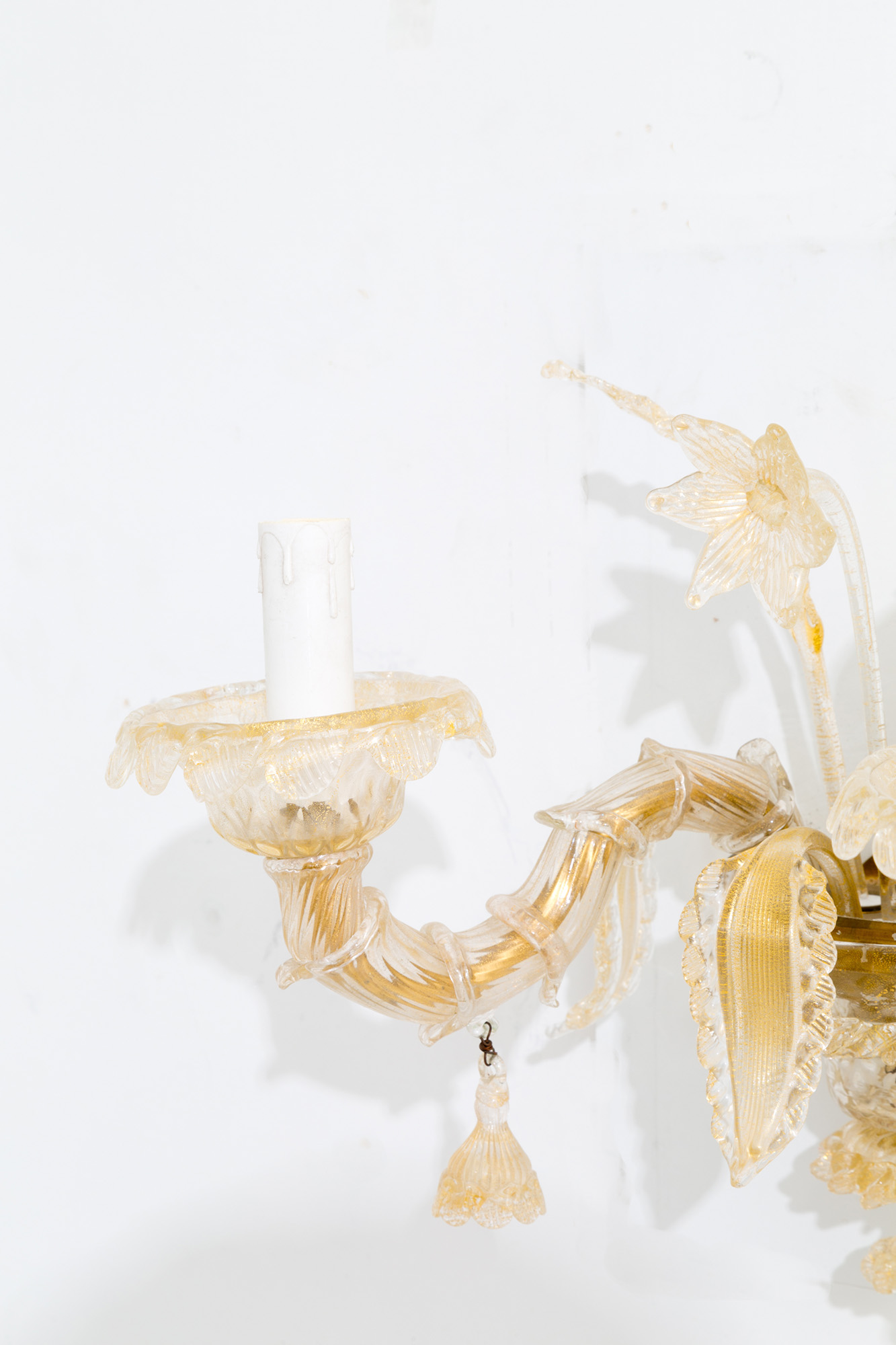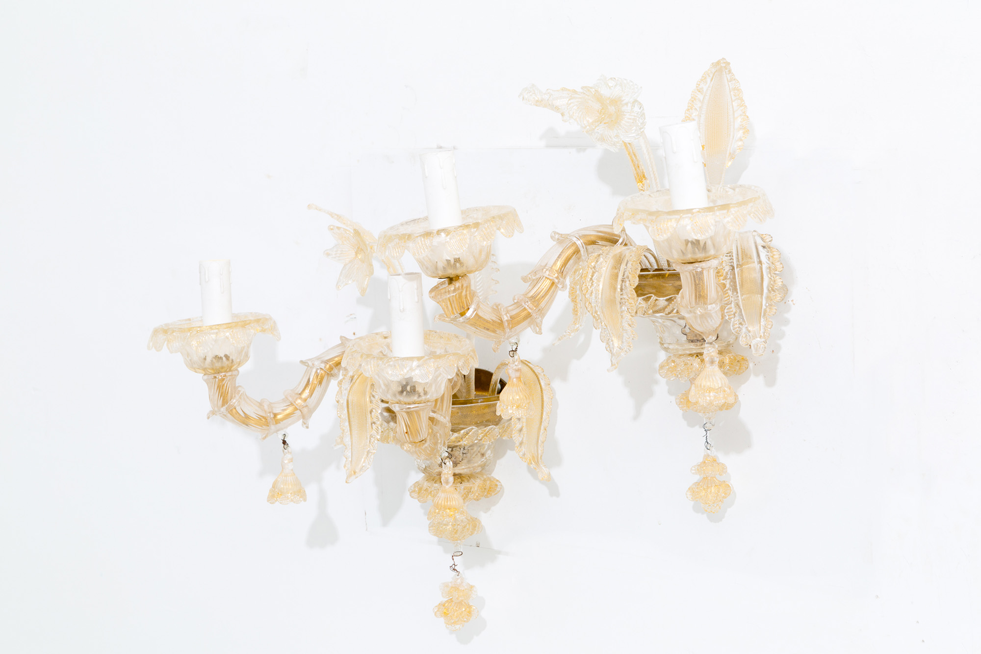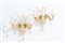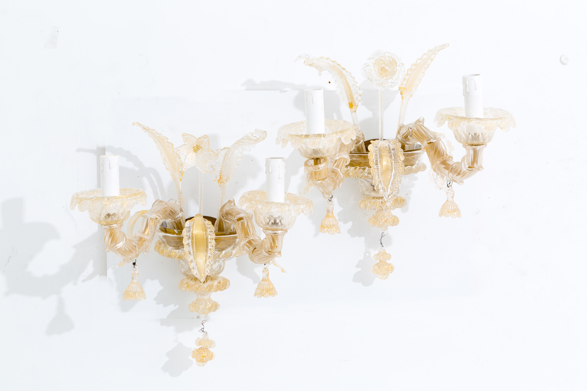 Coppia di applique due luci in vetro di Murano trasparente e oro con foglie e fiori. Inizi XX secolo. Mis. Lung. cm. 33 Alt. cm. 40 Prof. cm. 26 ca.