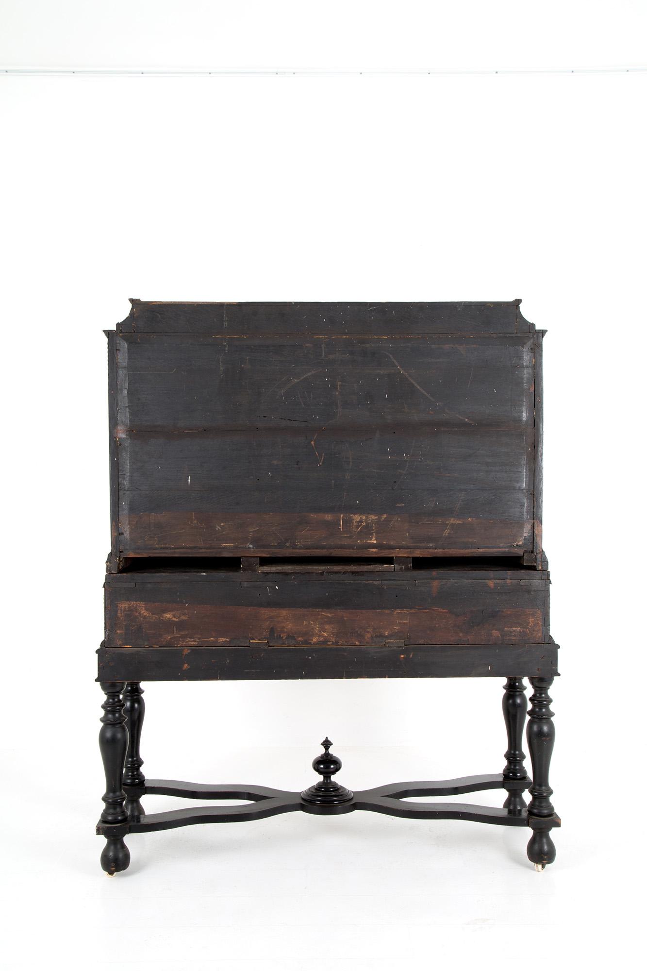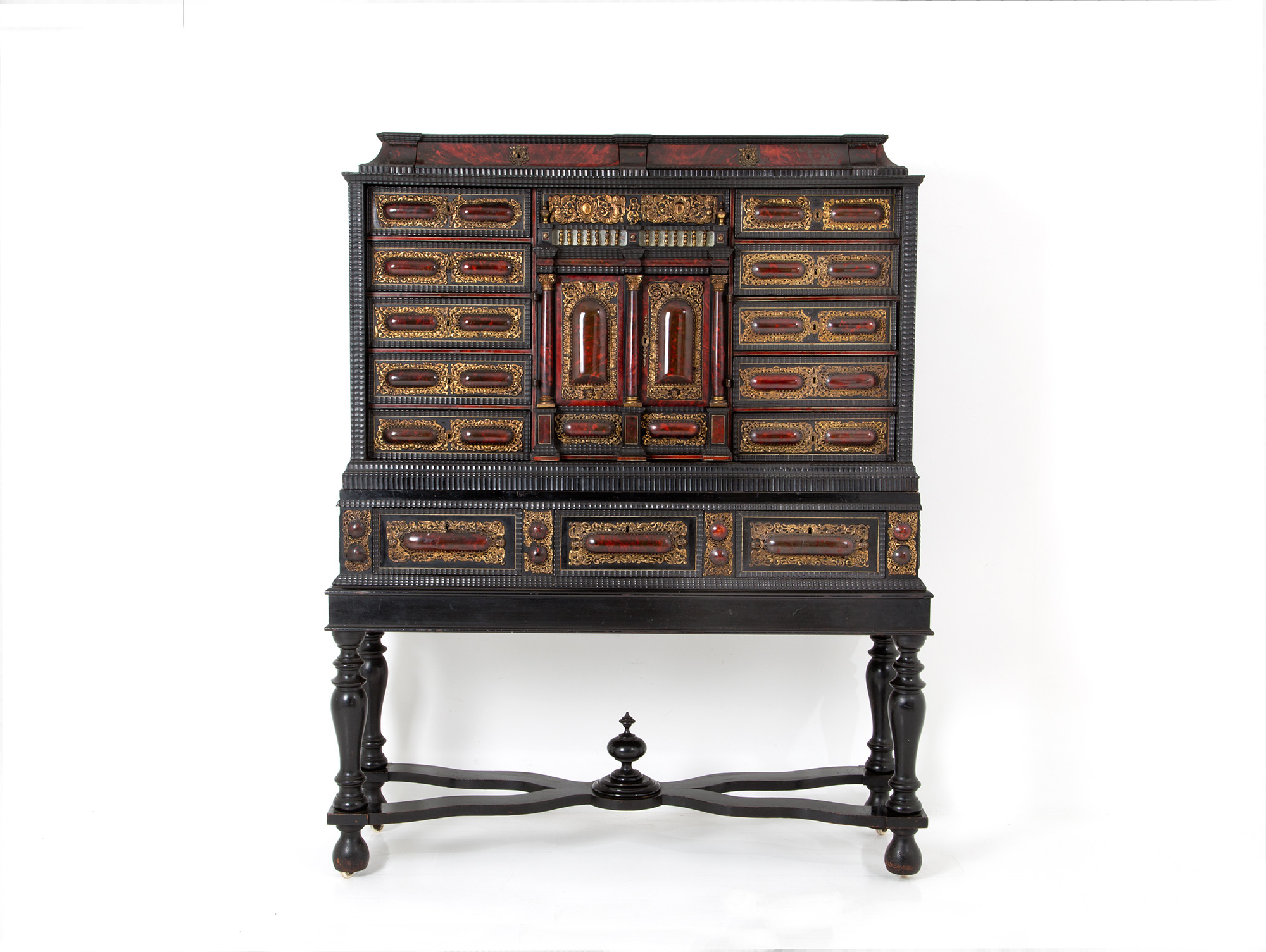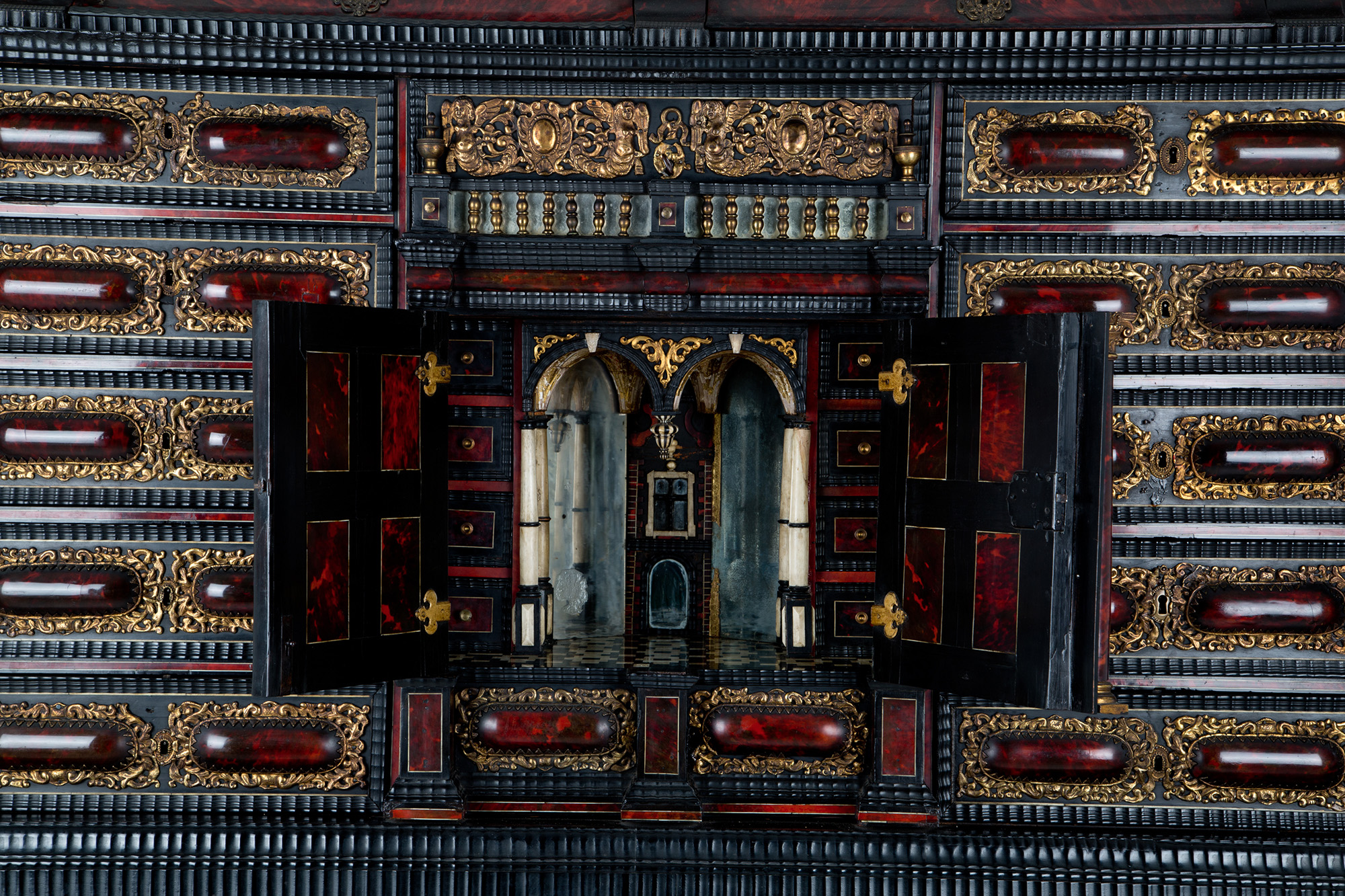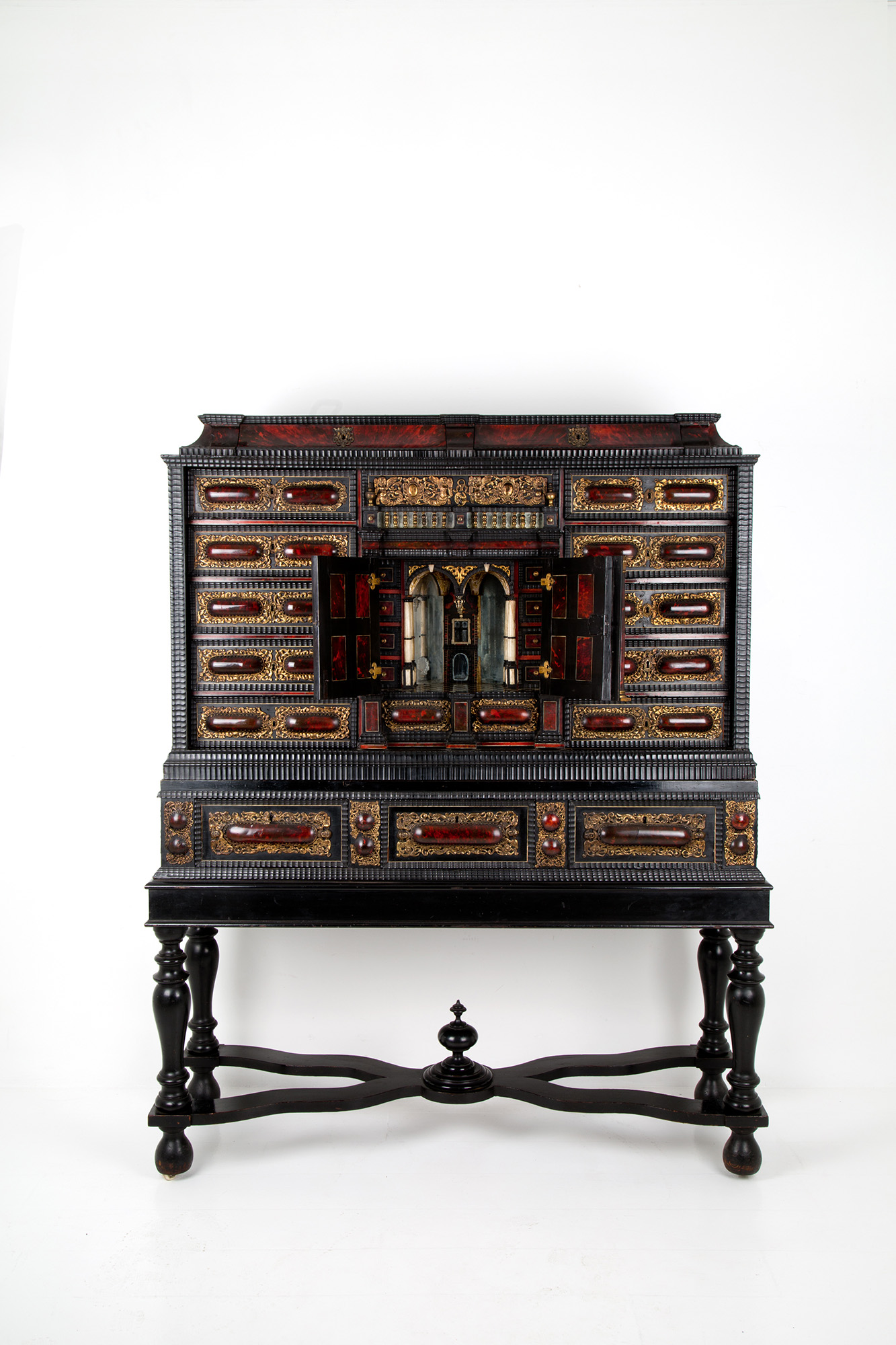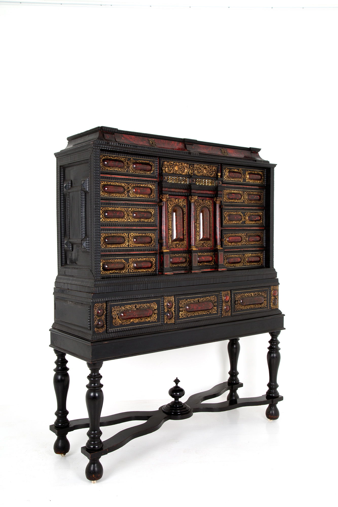 Monetiere in legno di ebano con rivestimento in tartaruga e finiture in bronzo cesellato e dorato. All'interno struttura architettonica con elementi in avorio. Nord Europa. XVII secolo. Mis. Lung. cm. 152 Alt. cm. 190 Prof. cm. 50 ca.