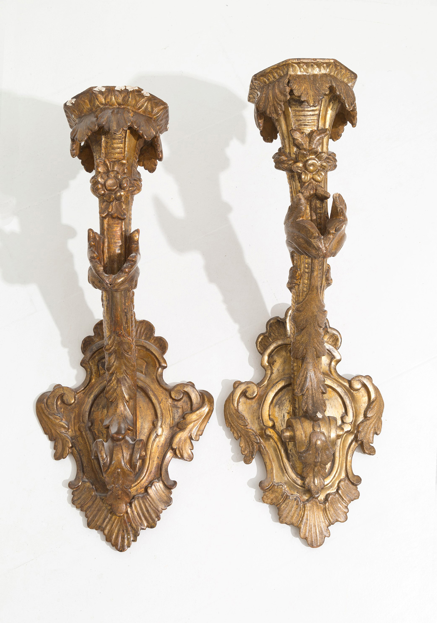 Coppia di portaceri in legno intagliato e dorato a mecca. Napoli. XVIII secolo. Mis. Lung. cm. 30 Alt. cm. 70 Prof. cm. 39 ca.