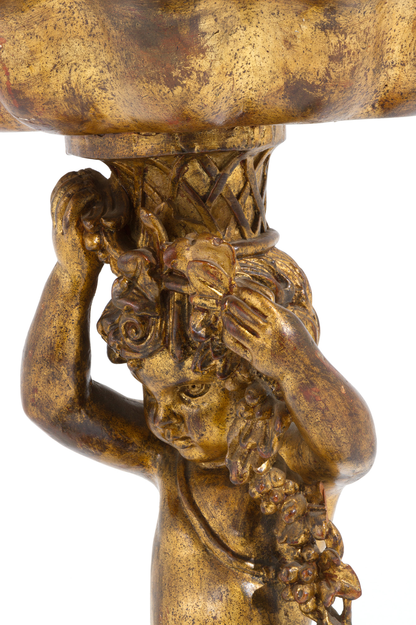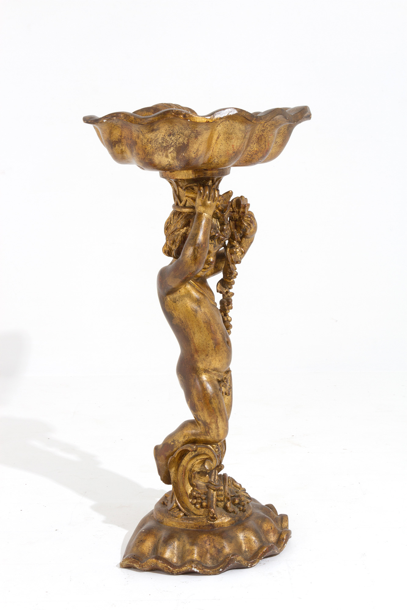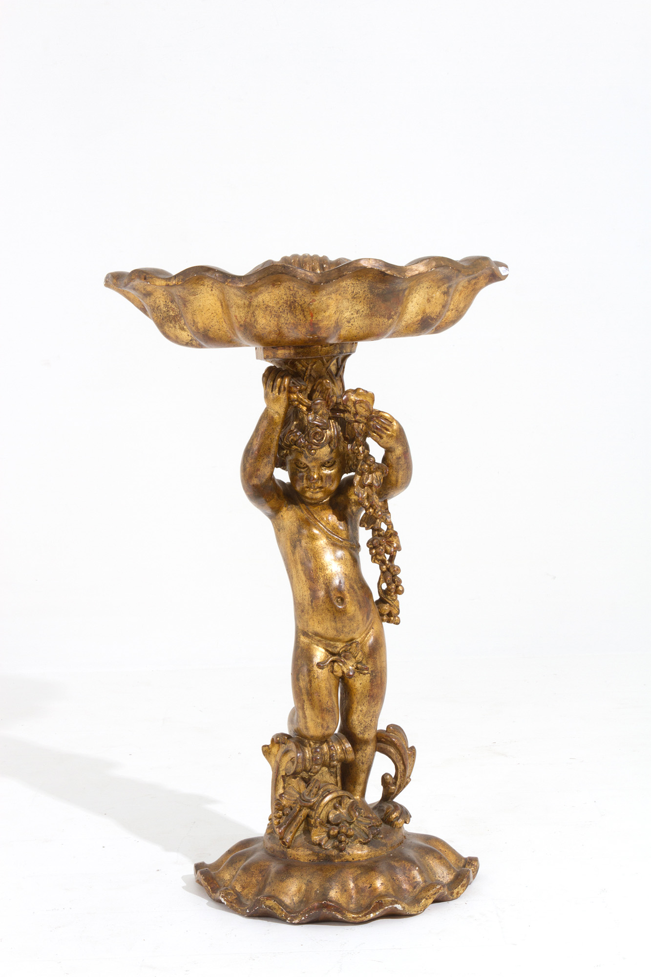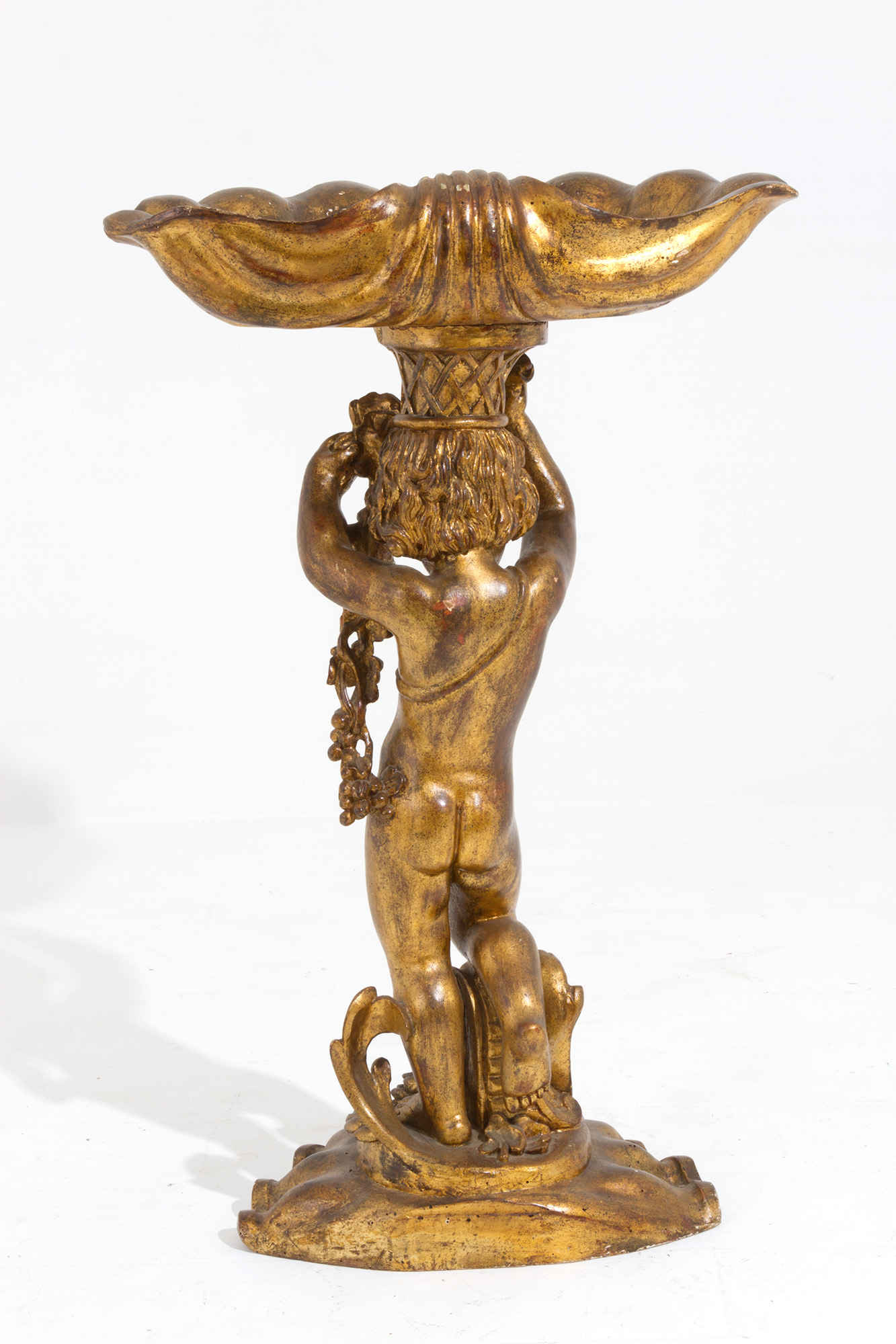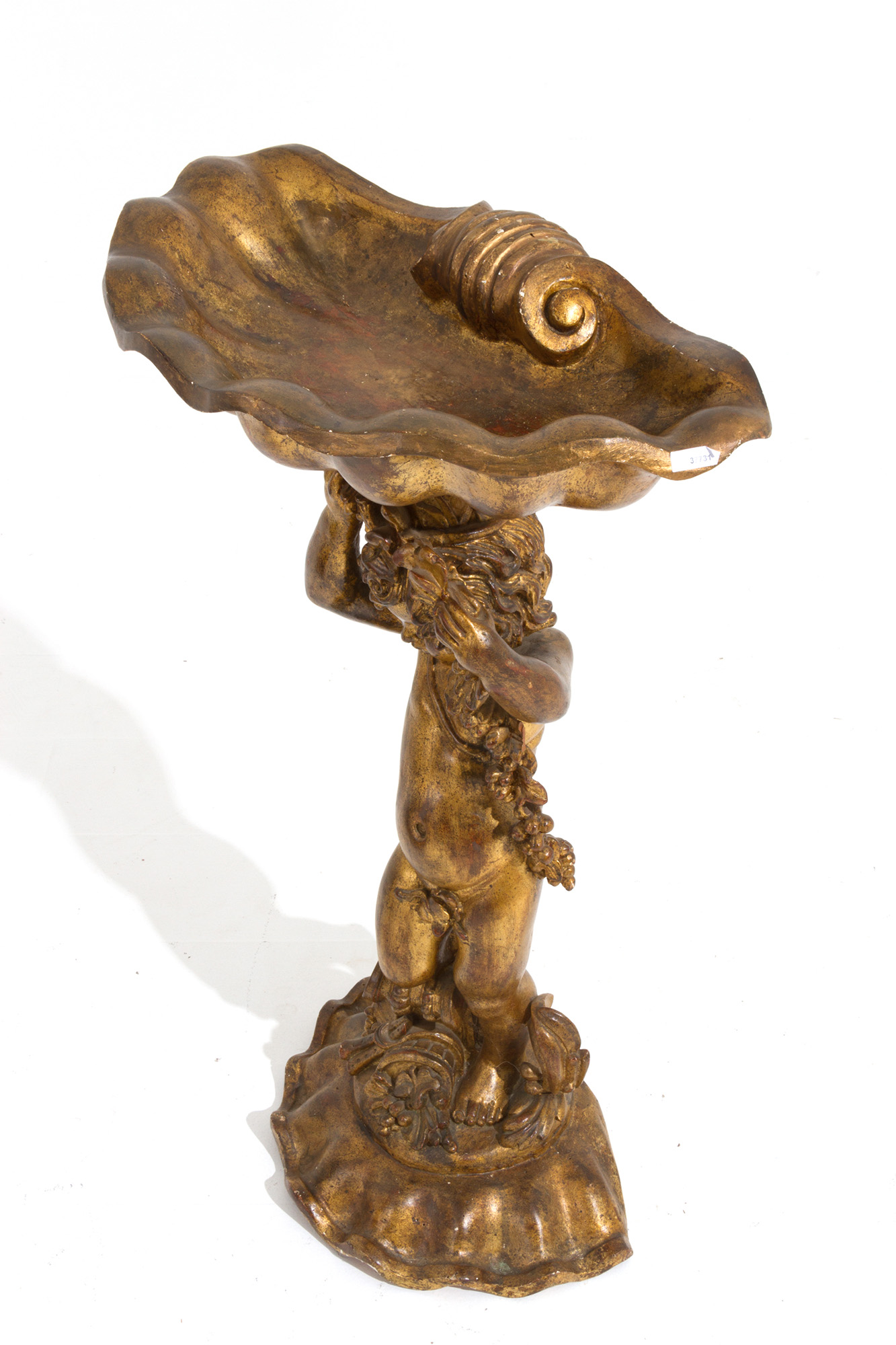 Scultura in legno intagliato e dorato raff. ''PUTTO CON CONCHIGLIA''. XIX secolo. Mis. Lung. cm. 65 Alt. cm. 103 Prof. cm. 38 ca.
