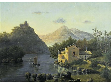 Anonimo (XIX secolo) Paesaggio lacustre Olio su tela Misure 34x47 cm