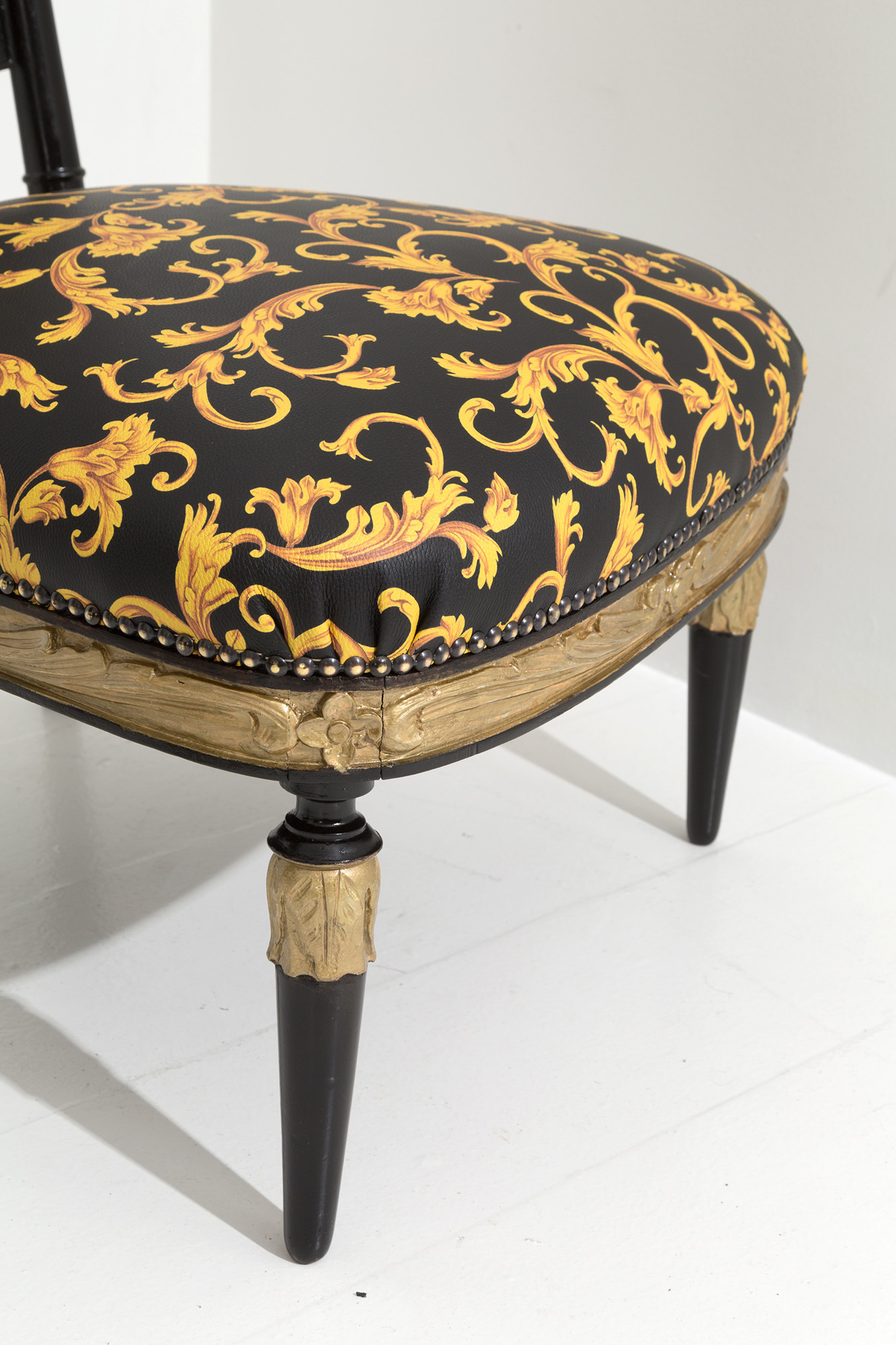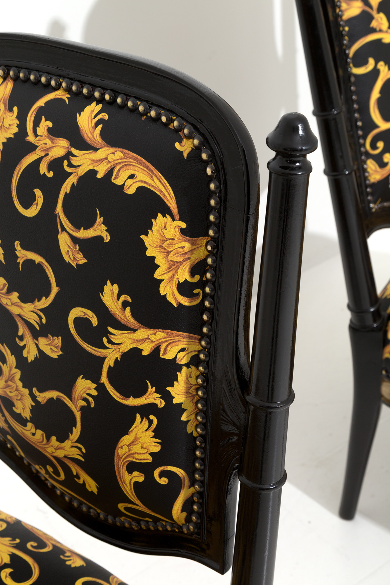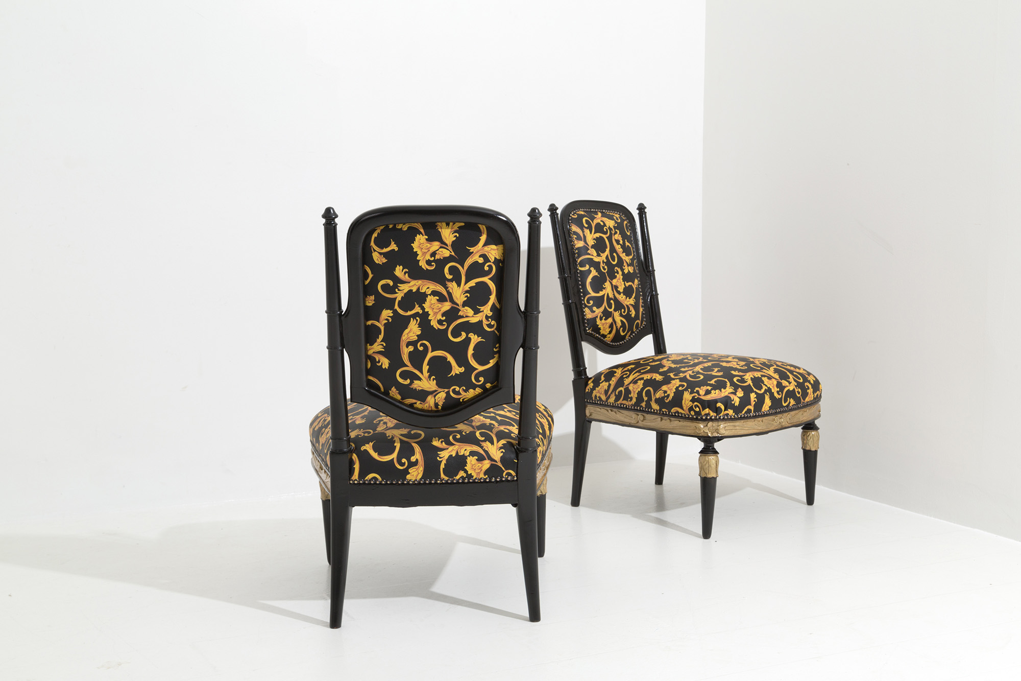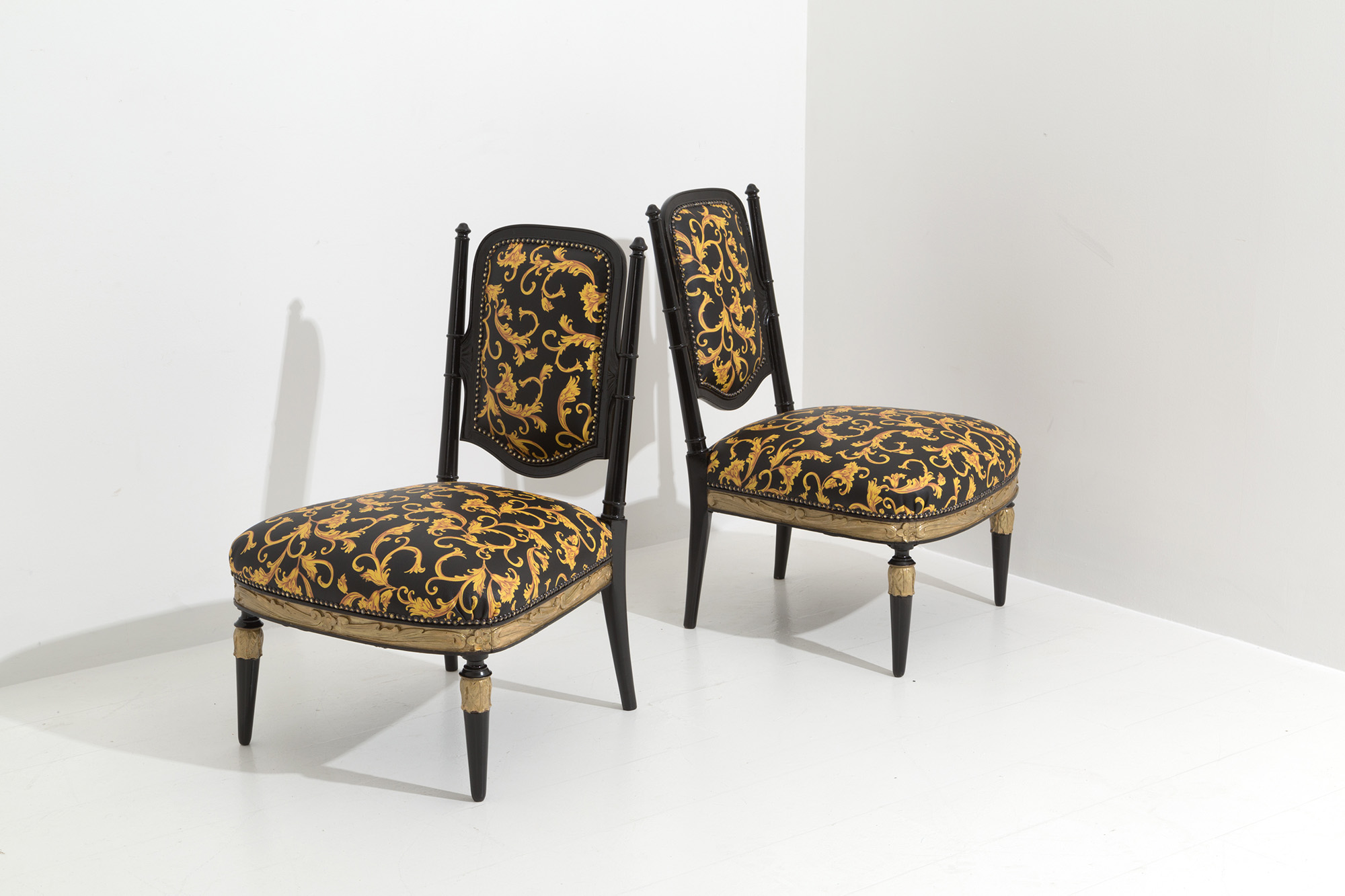 Coppia di poltrone in legno e vera pelle fashion. Manifattura italiana. XX secolo. Mis. Lung. cm. 55 Alt. cm. 80 Prof. cm. 60 ca.
