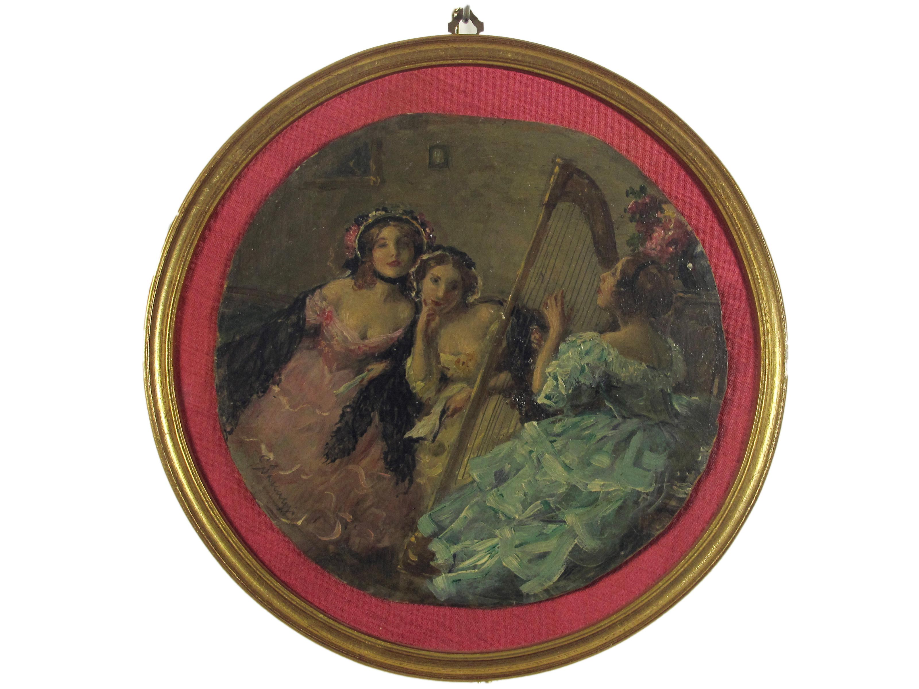 Cesare Saccaggi (Tortona 1868-1934) Compagnia Olio su tavoletta Firmato Diametro 21 cm