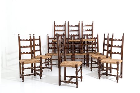 GIO PONTI (Attr.) (Milano, 1891-1979). Dodici sedie in legno con sedute in paglia. Anni '40. Difetti. Mis. Lung. cm. 41 Alt. cm. 108 Prof. cm. 43 ca.