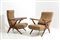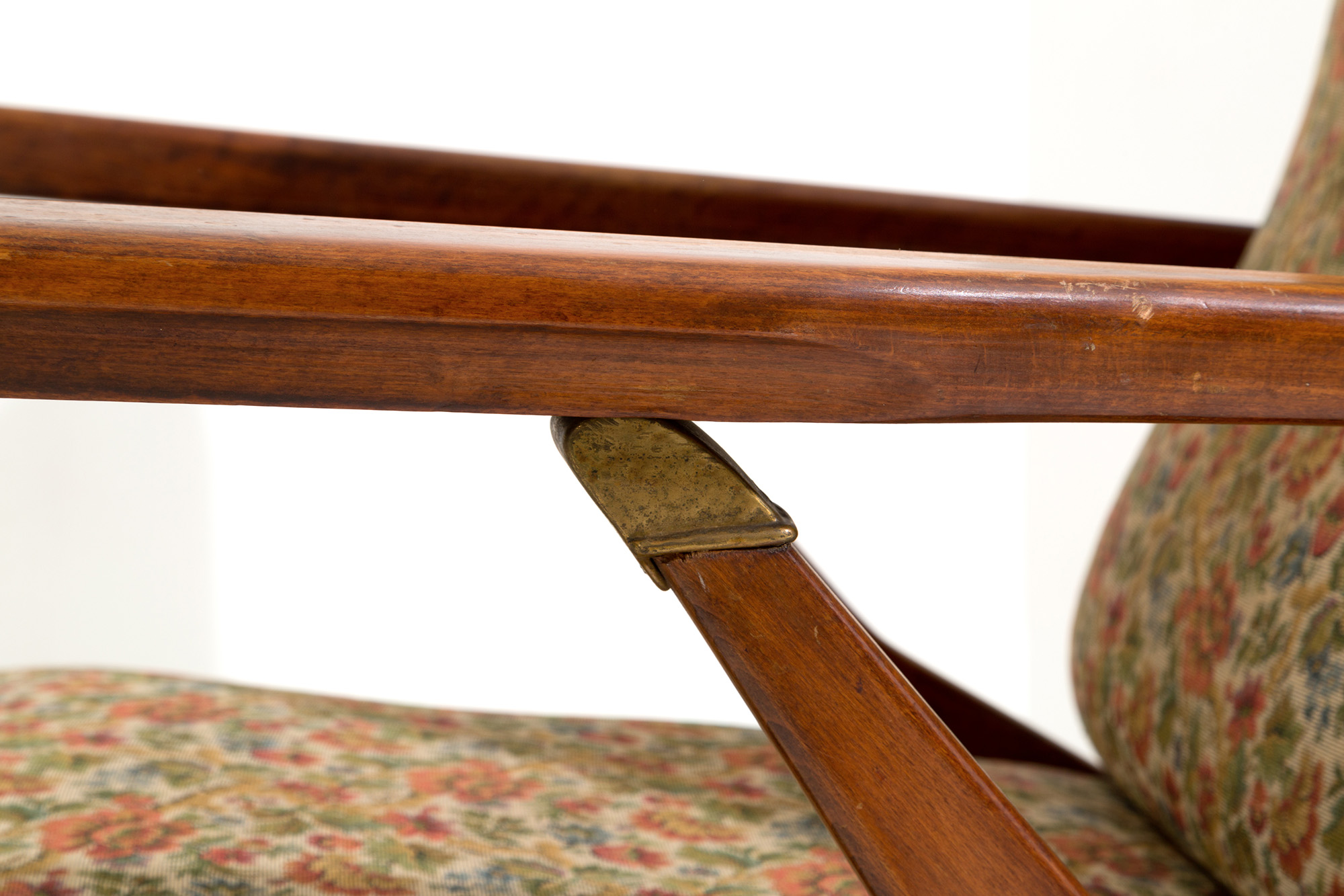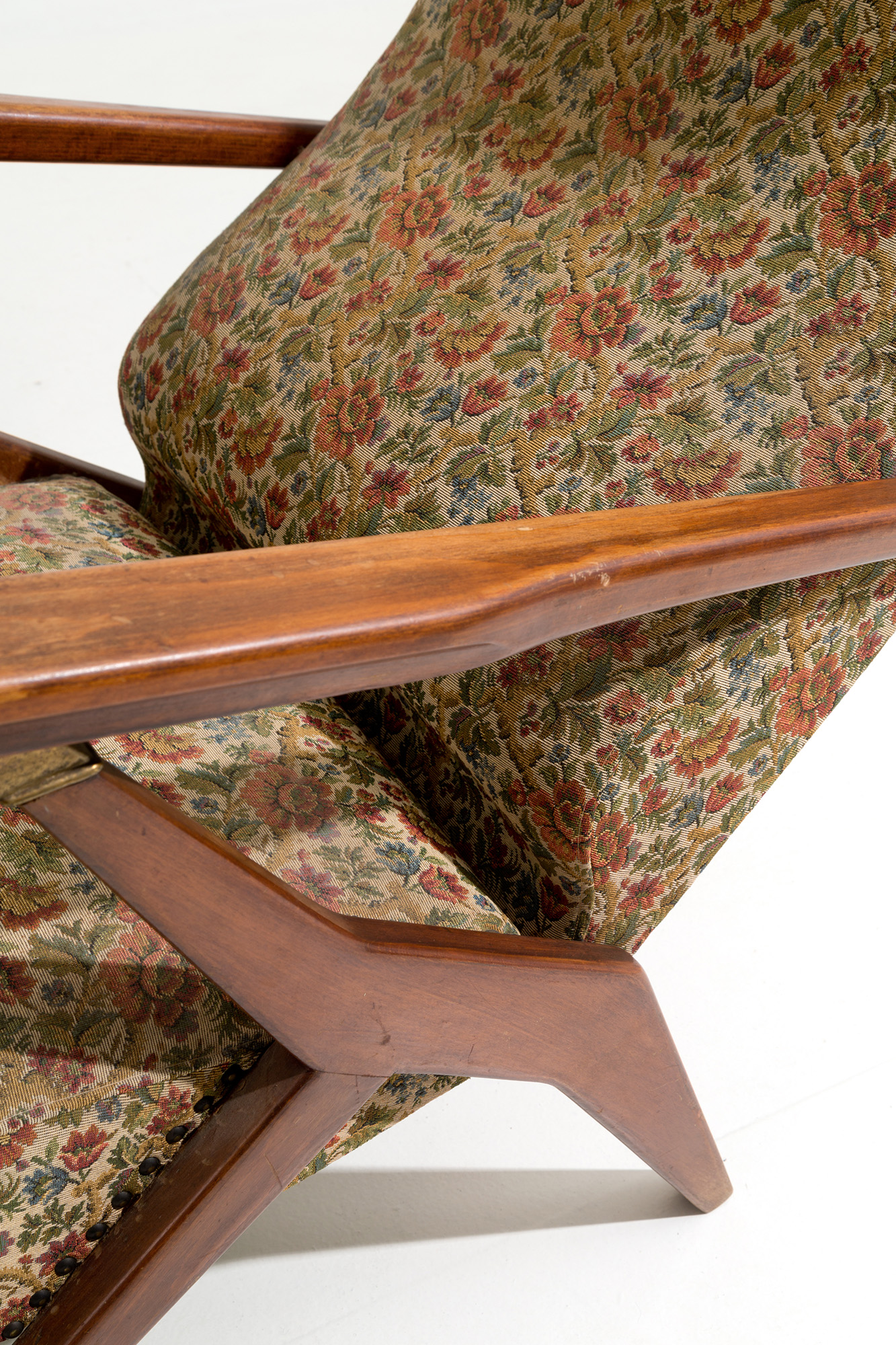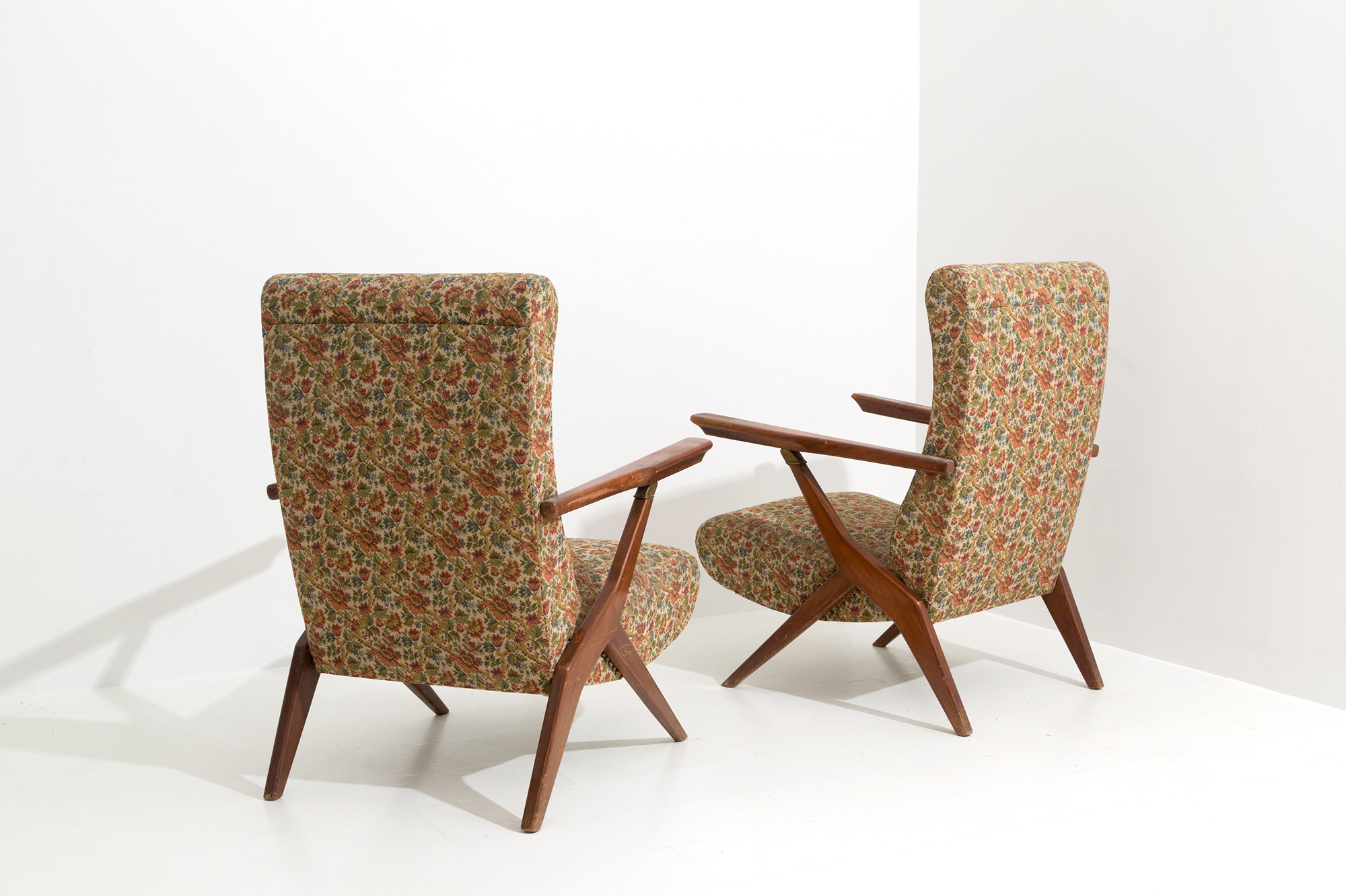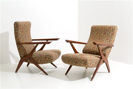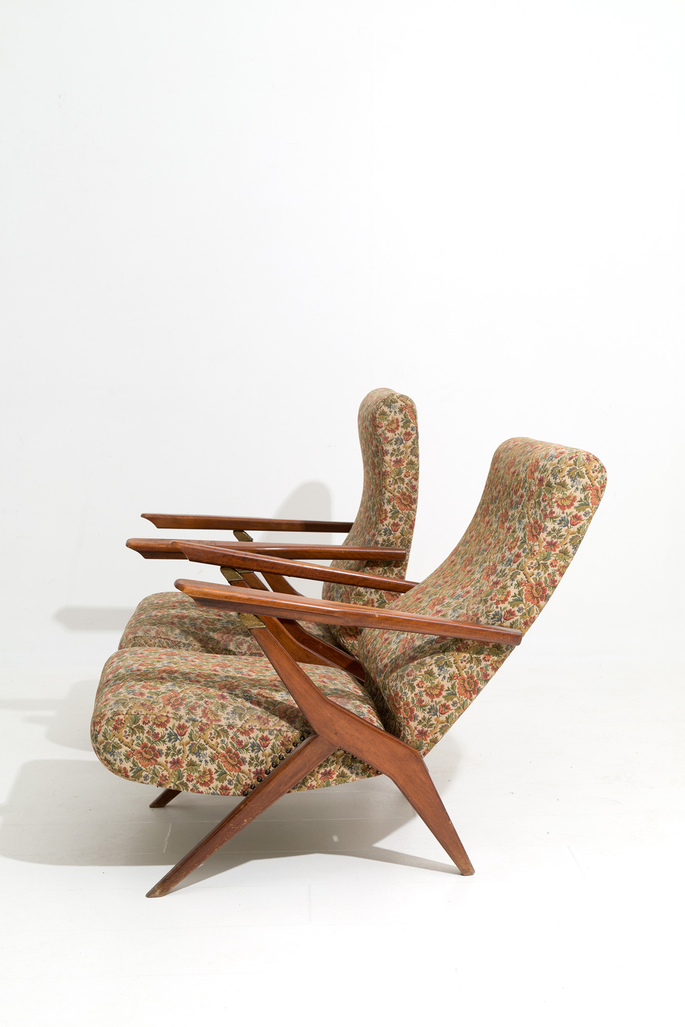 ANTONIO GORGONE. Due poltrone con struttura in legno, schienali reclinabili e tessuto con decori floreali. Anni '50. Segni di usura. Mis. Lung. cm. 63 Alt. cm. 95 Prof. cm. 75 ca.