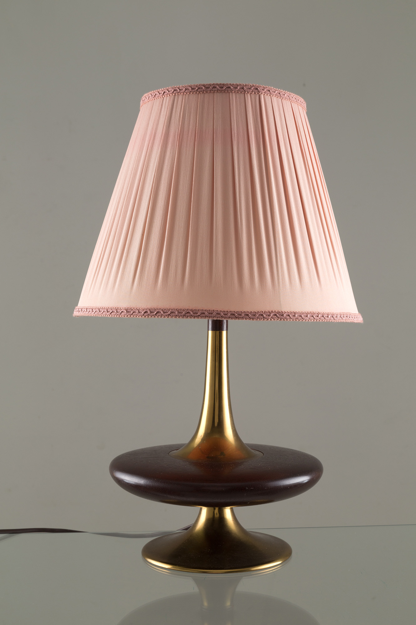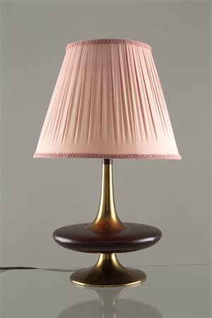 Lampada da tavolo in ottone con base in legno e paralume in seta rosa. Manifattura italiana. Anni '50. Mis. Alt. cm. 60 Diam. cm. 36 ca.