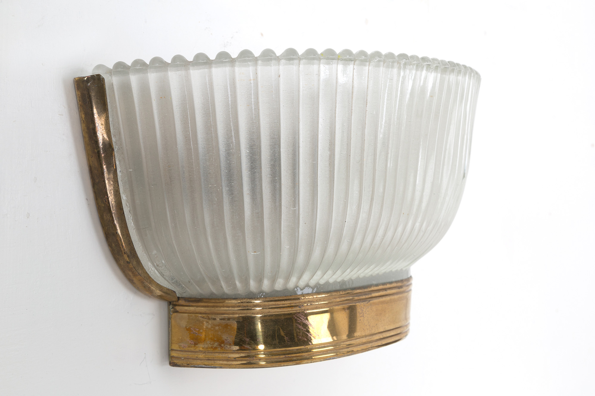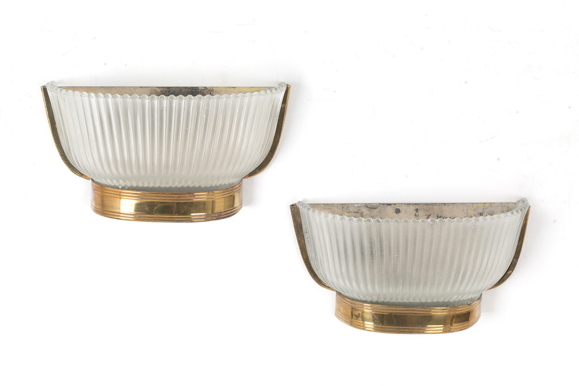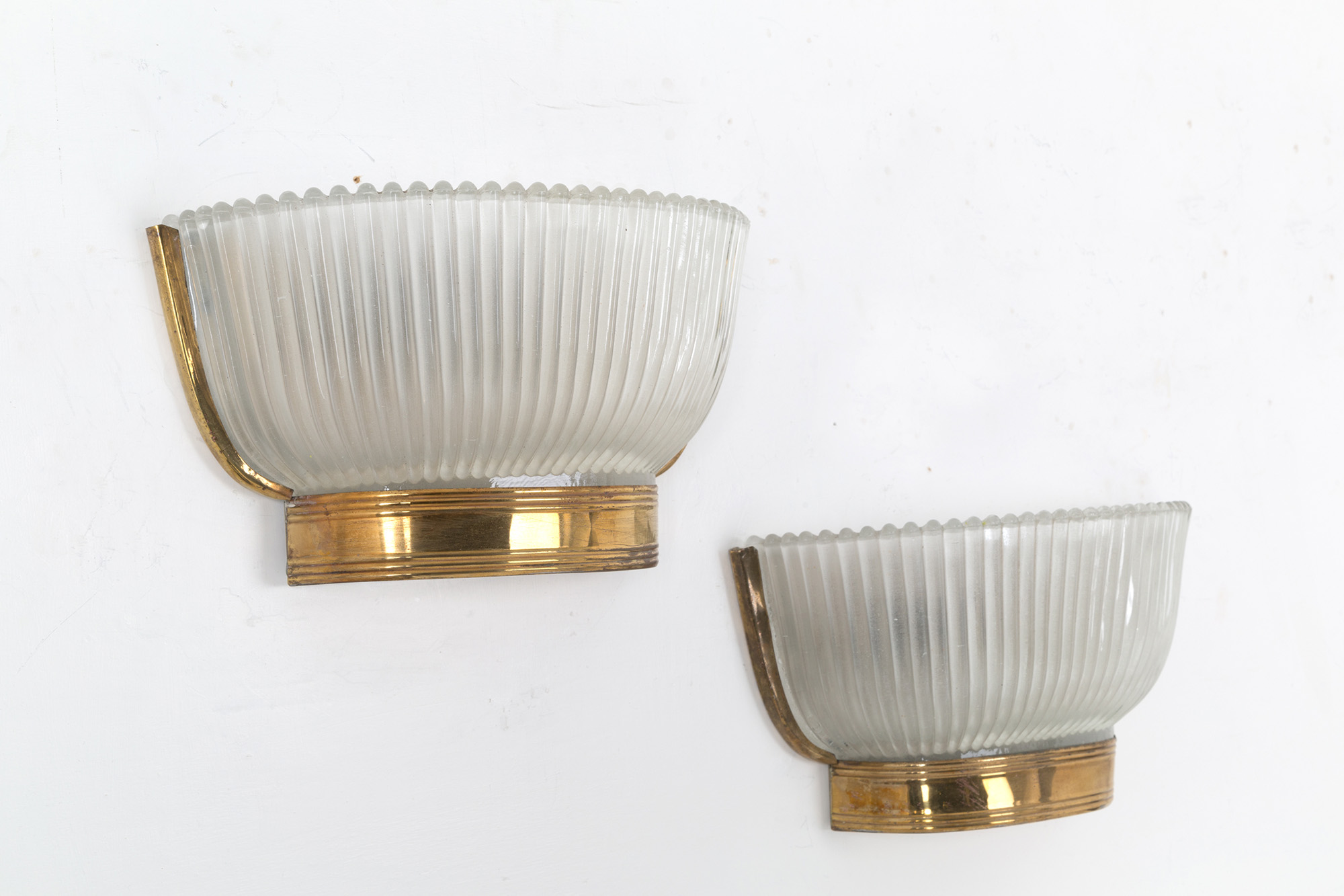 Coppia di applique in vetro di Murano e ottone. Produzione SEGUSO. Anni '50 Mis. Lung. cm. 30 Alt. cm. 18 Prof. cm. 10 ca.