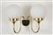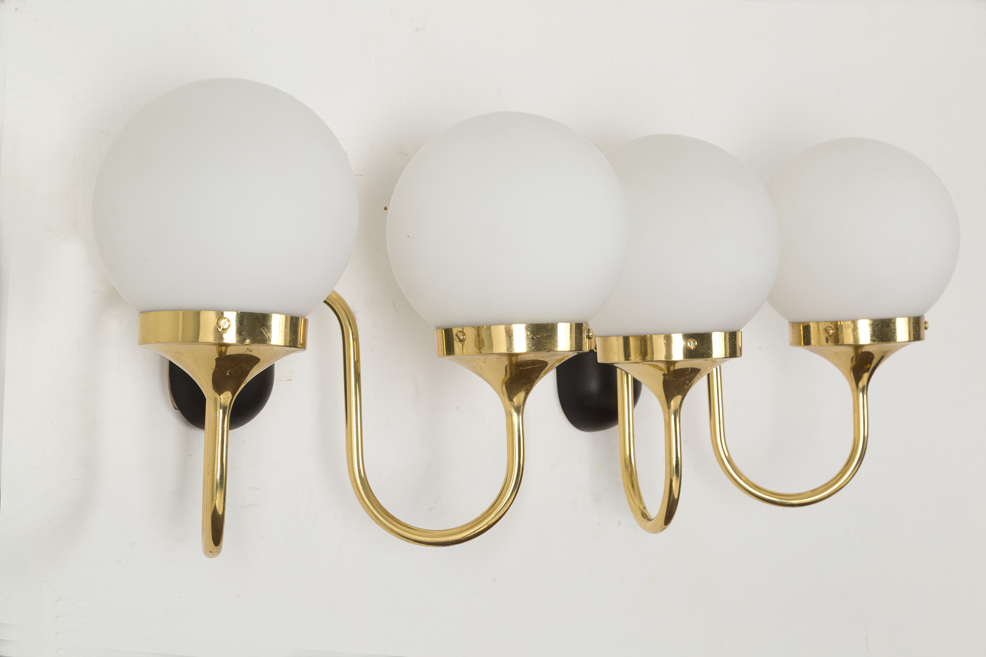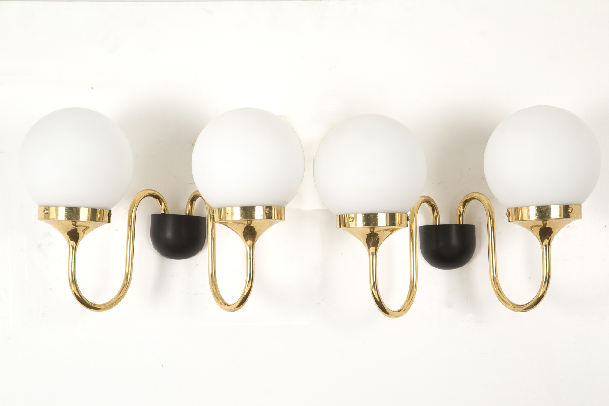 Coppia di applique in ottone dorato e metallo verniciato nero con due sfere in vetro lattimo. Produzione STILNOVO. Con etichetta del produttore sul montante. Anni '50. Mis. Lung. cm. 45 Alt. cm. 29 Prof. cm. 25 ca.