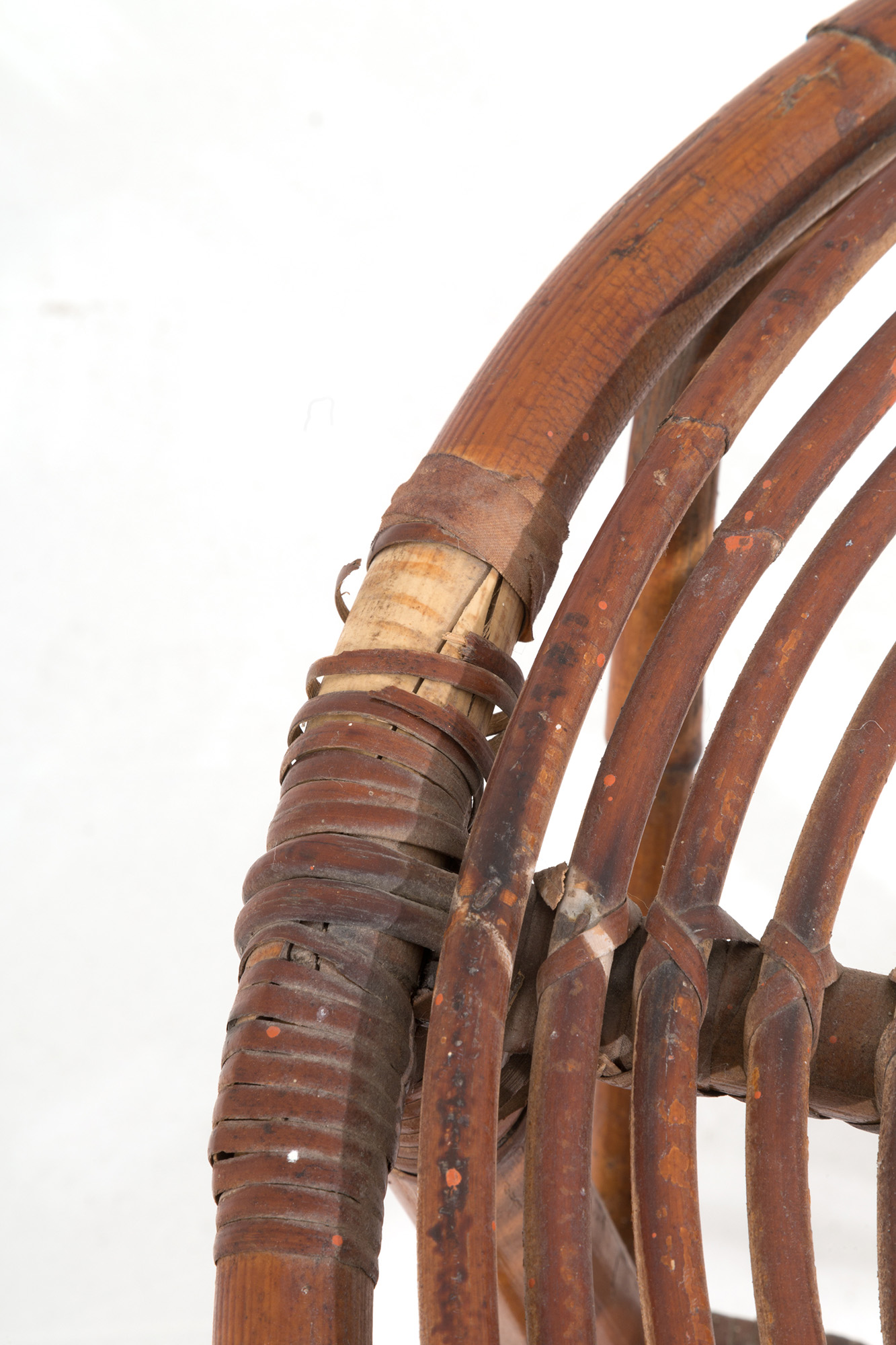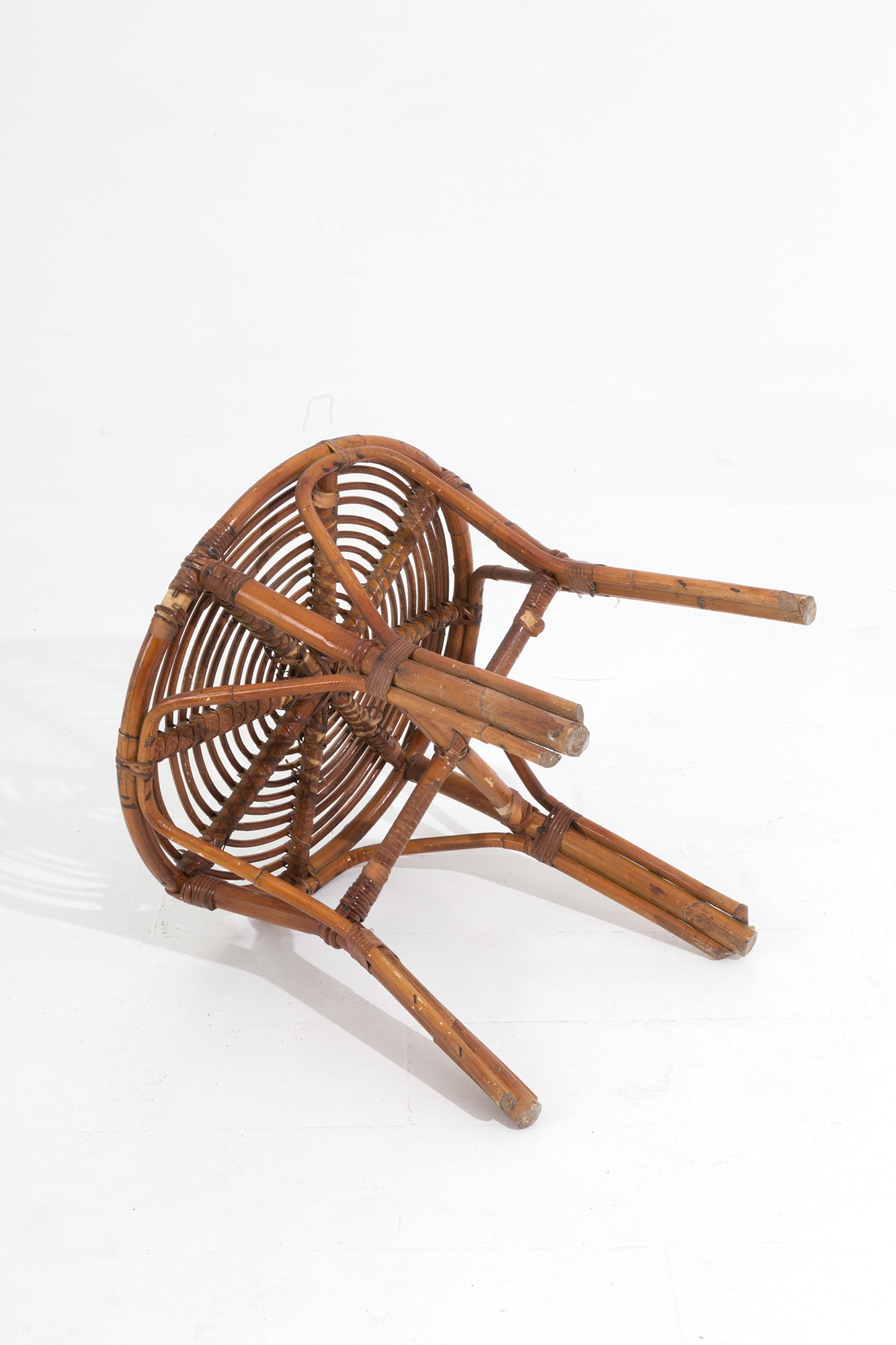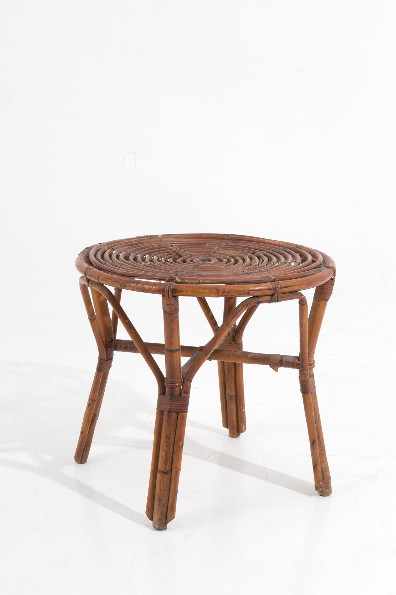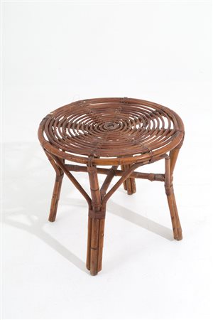 Tavolino in rattan. Manifattura italiana. Anni '50. Difetti. Mis. Alt. cm. 56 Diam. cm. 60 ca.