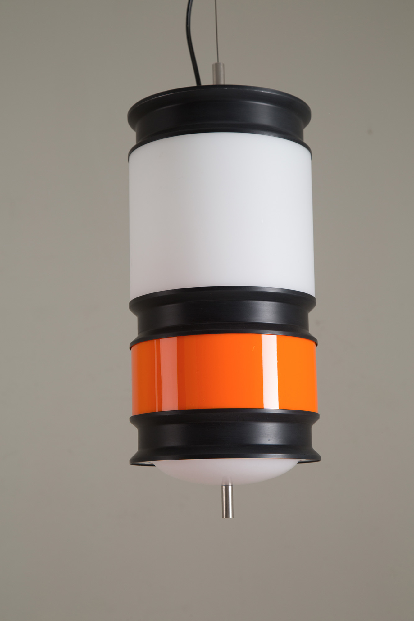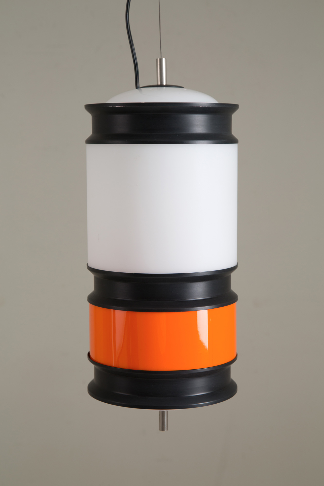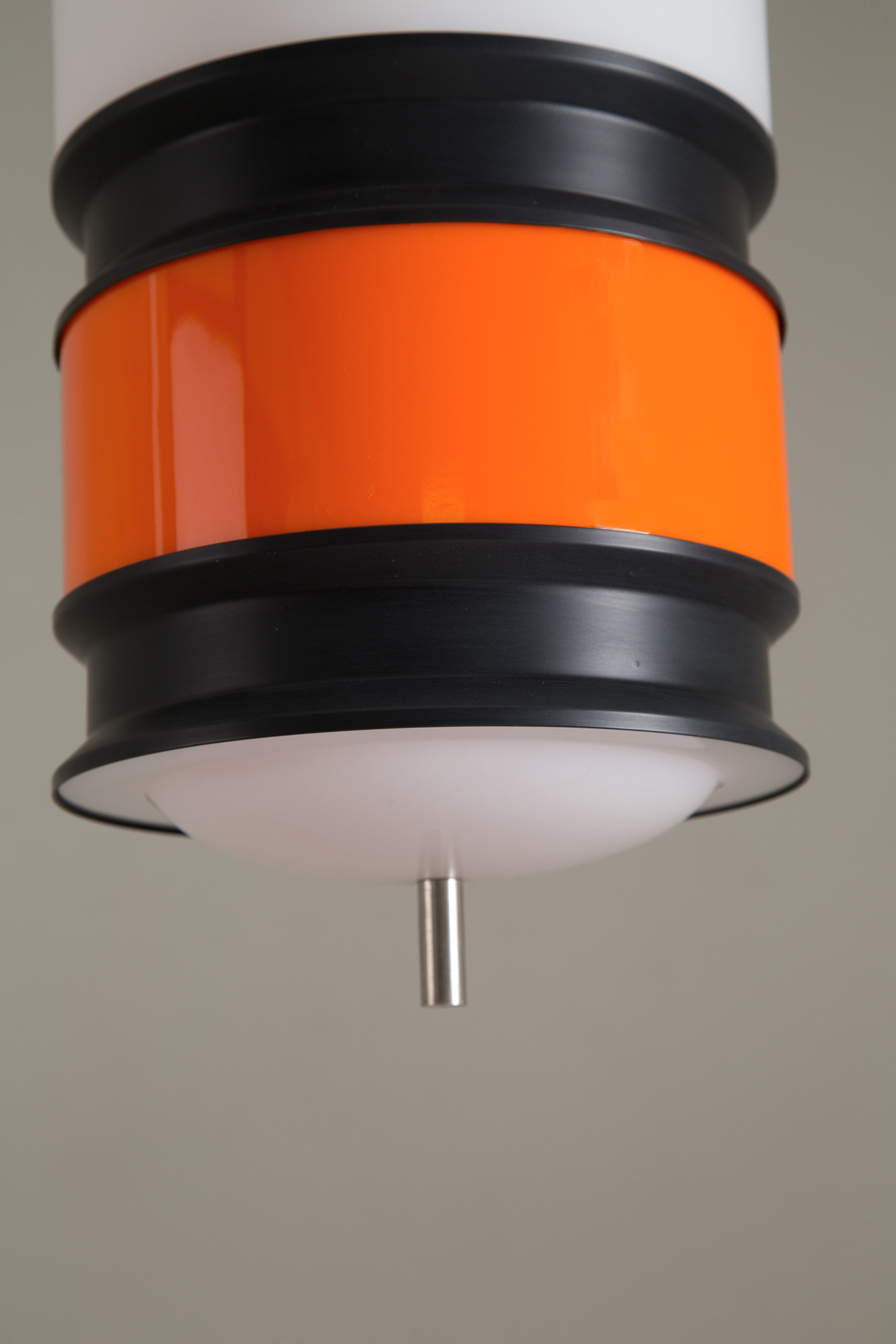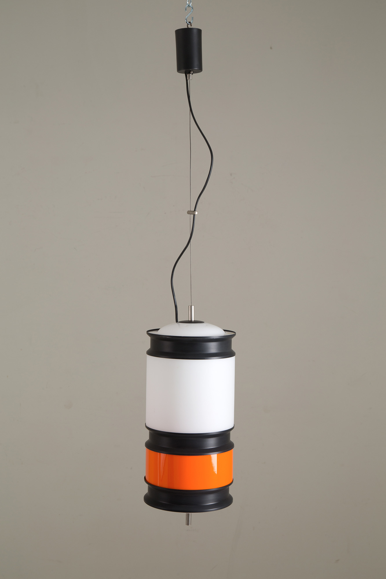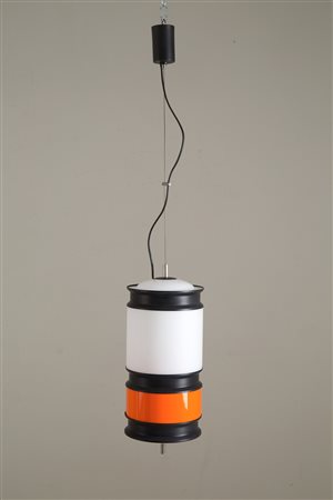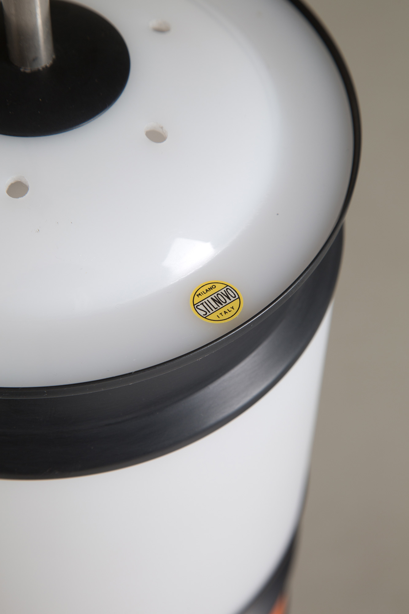 Lampadario con struttura in metallo cromato e verniciato e diffusori in vetro satinato e plexiglass. Produzione STILNOVO. Con etichetta del produttore nella parte superiore. Anni '50. Mis. Alt. cm. 94 Diam. cm. 17 ca.