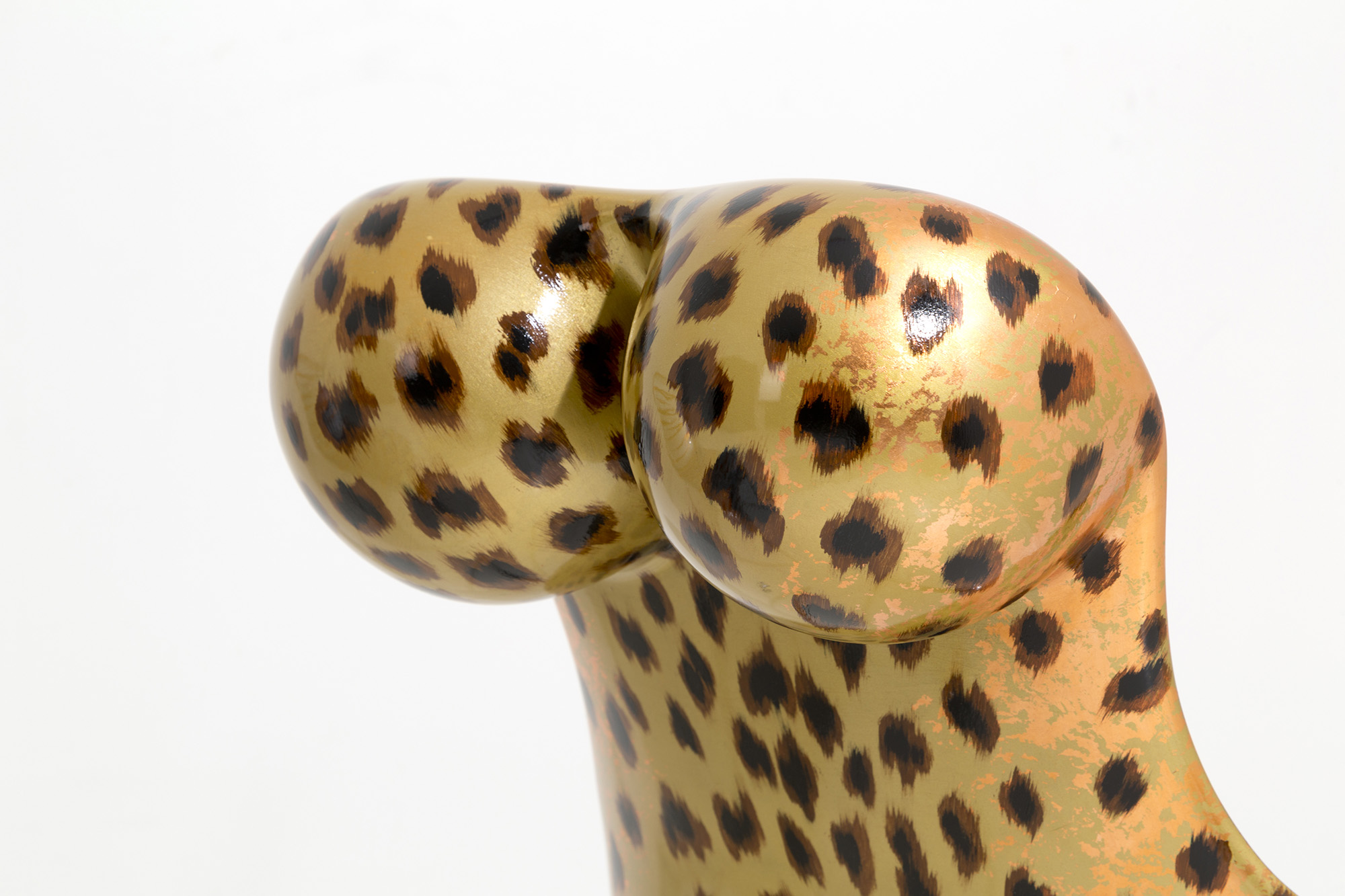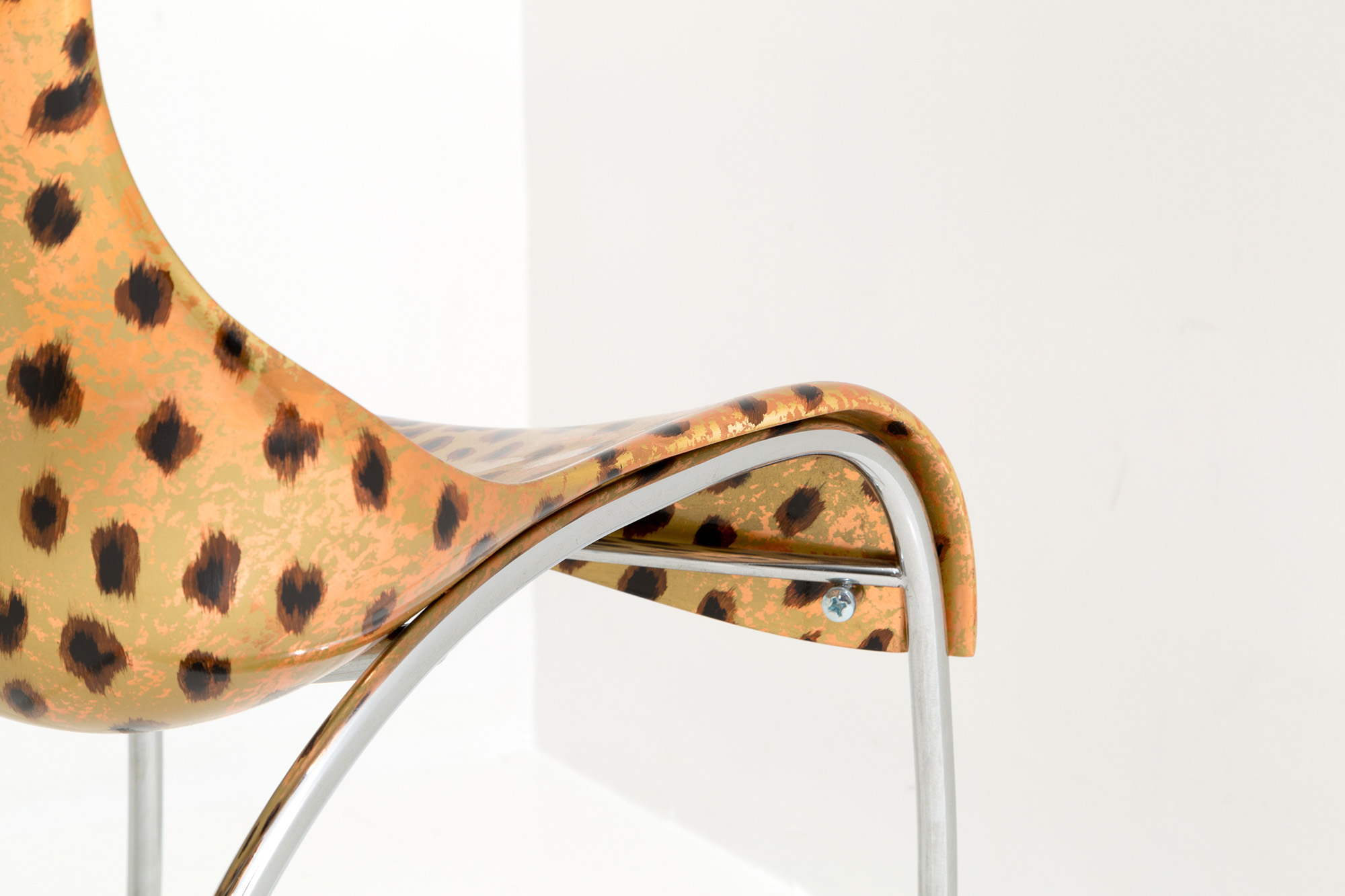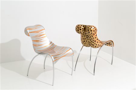 FRANCO PEROTTI per TECNO. Due sedie in resina Silicon Hill con gambe in metallo cromato, una leoparda e una zebrata. 1996. Mis. Lung. cm. 45 Alt. cm. 80 Prof. cm. 60 ca.