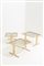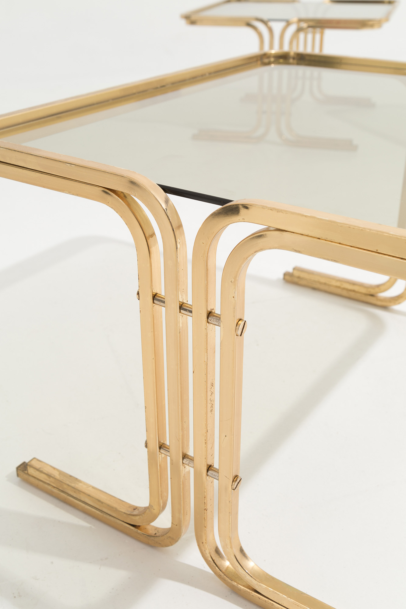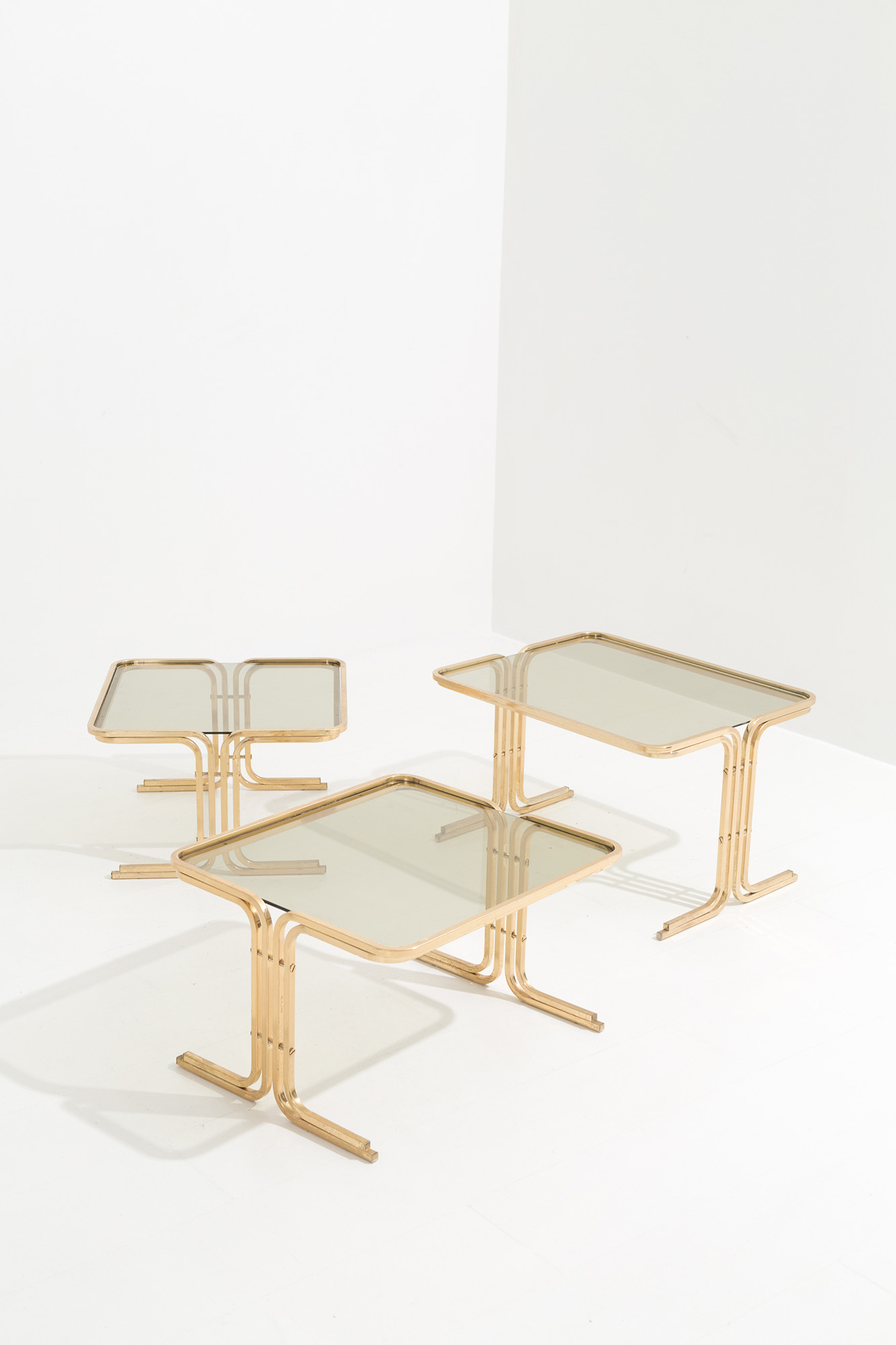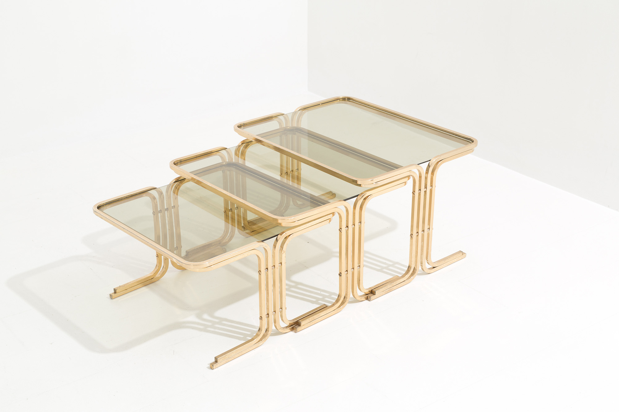 Trittico di tavolini in ottone con piano in vetro fumè. Manifattura italiana. Anni '70. Mis. Alt. minima cm. 28 massima 37 Lung. cm. 61 Prof. cm. 49 ca.