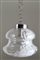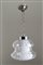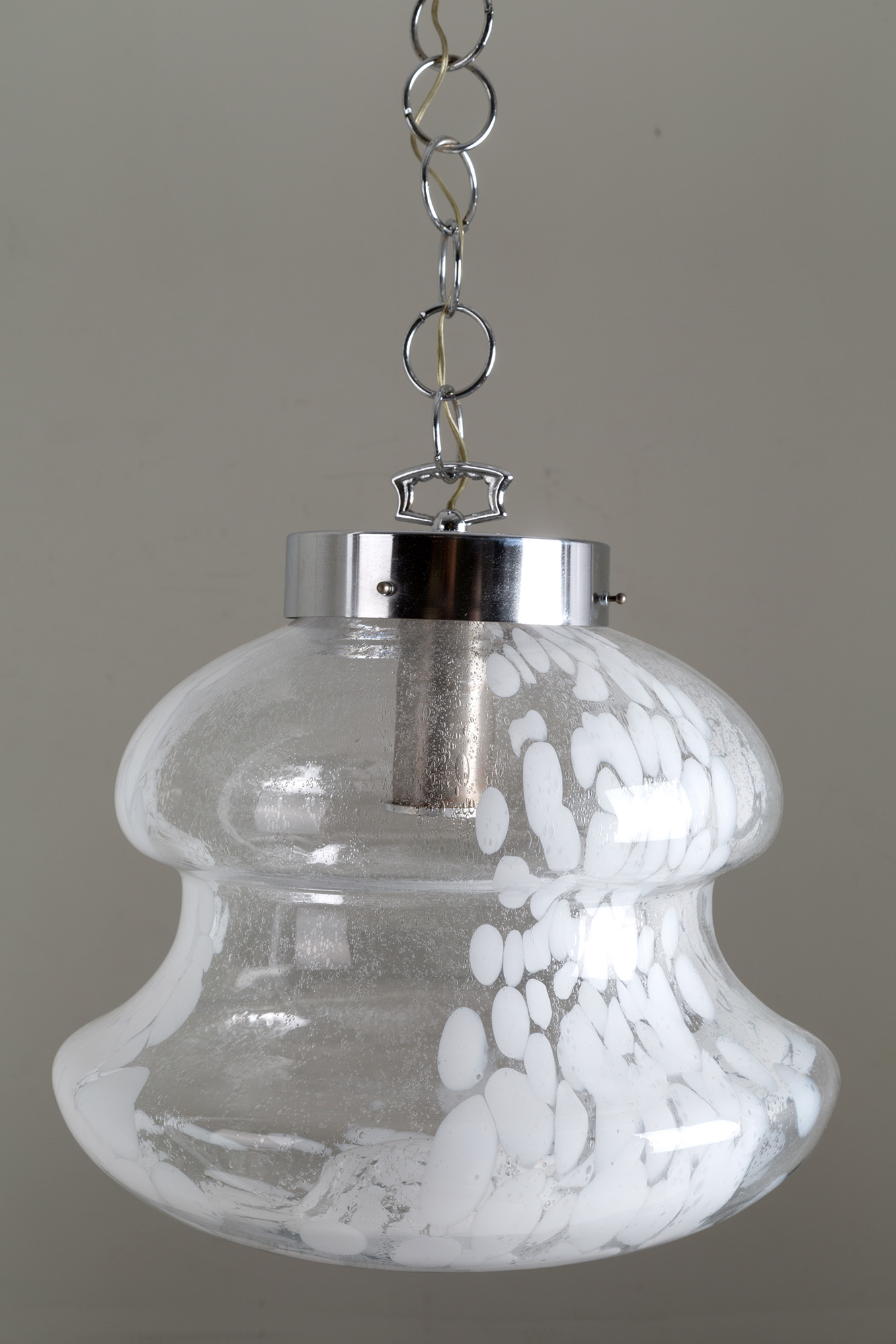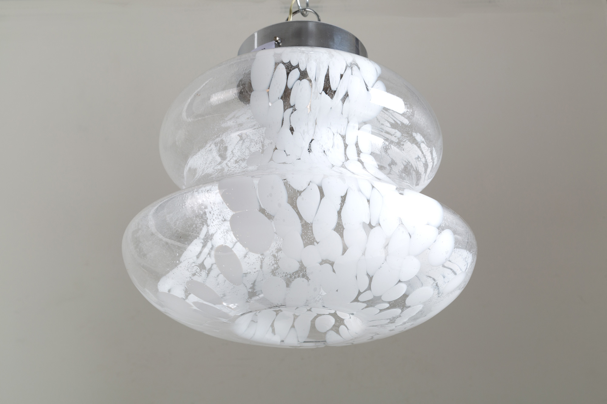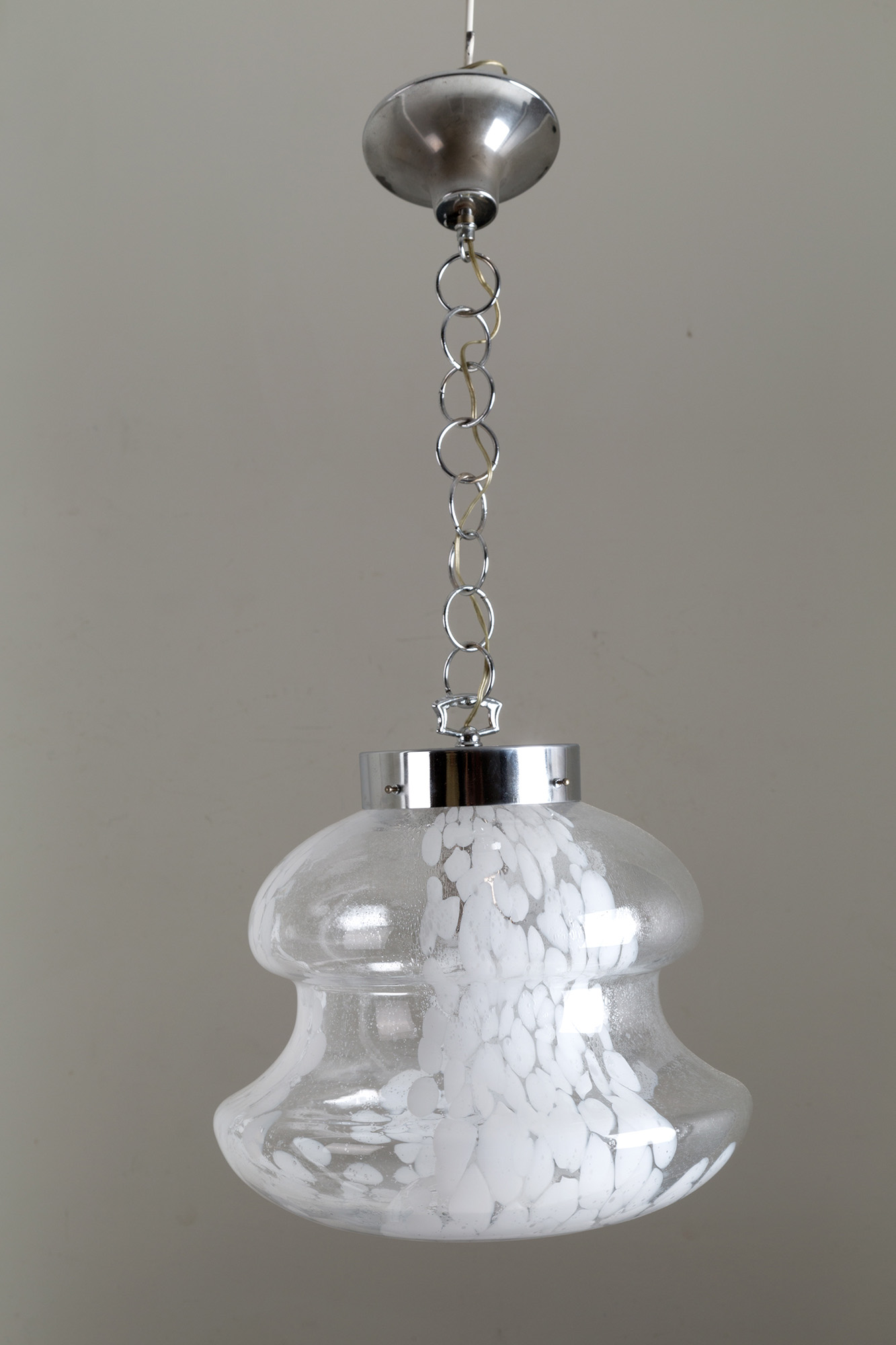 Lampadario in vetro trasparente e bianco con struttura in metallo cromato. Manifattura italiana. Anni '70. Mis. Alt. cm. 88 Diam. cm. 40 ca.