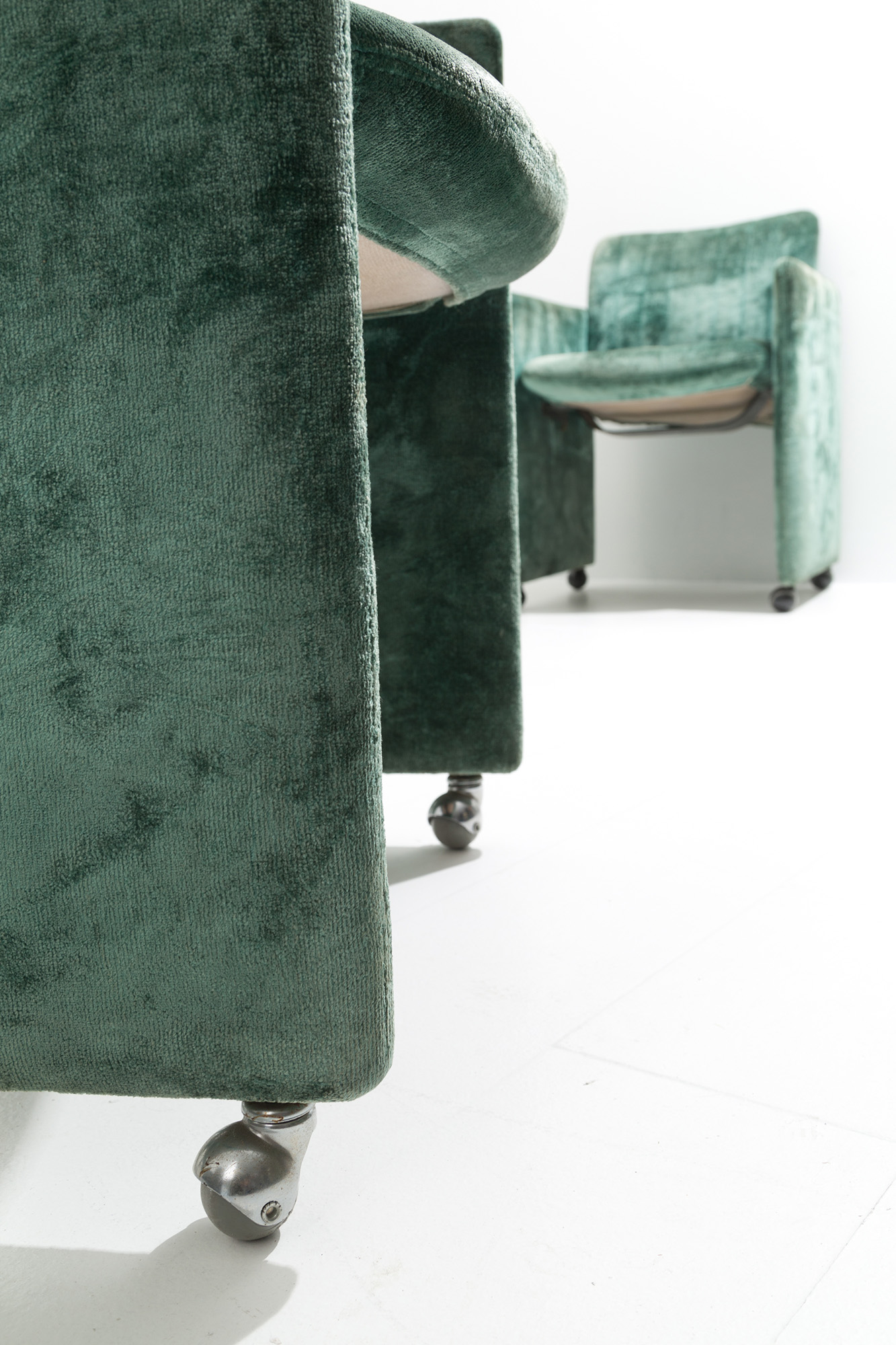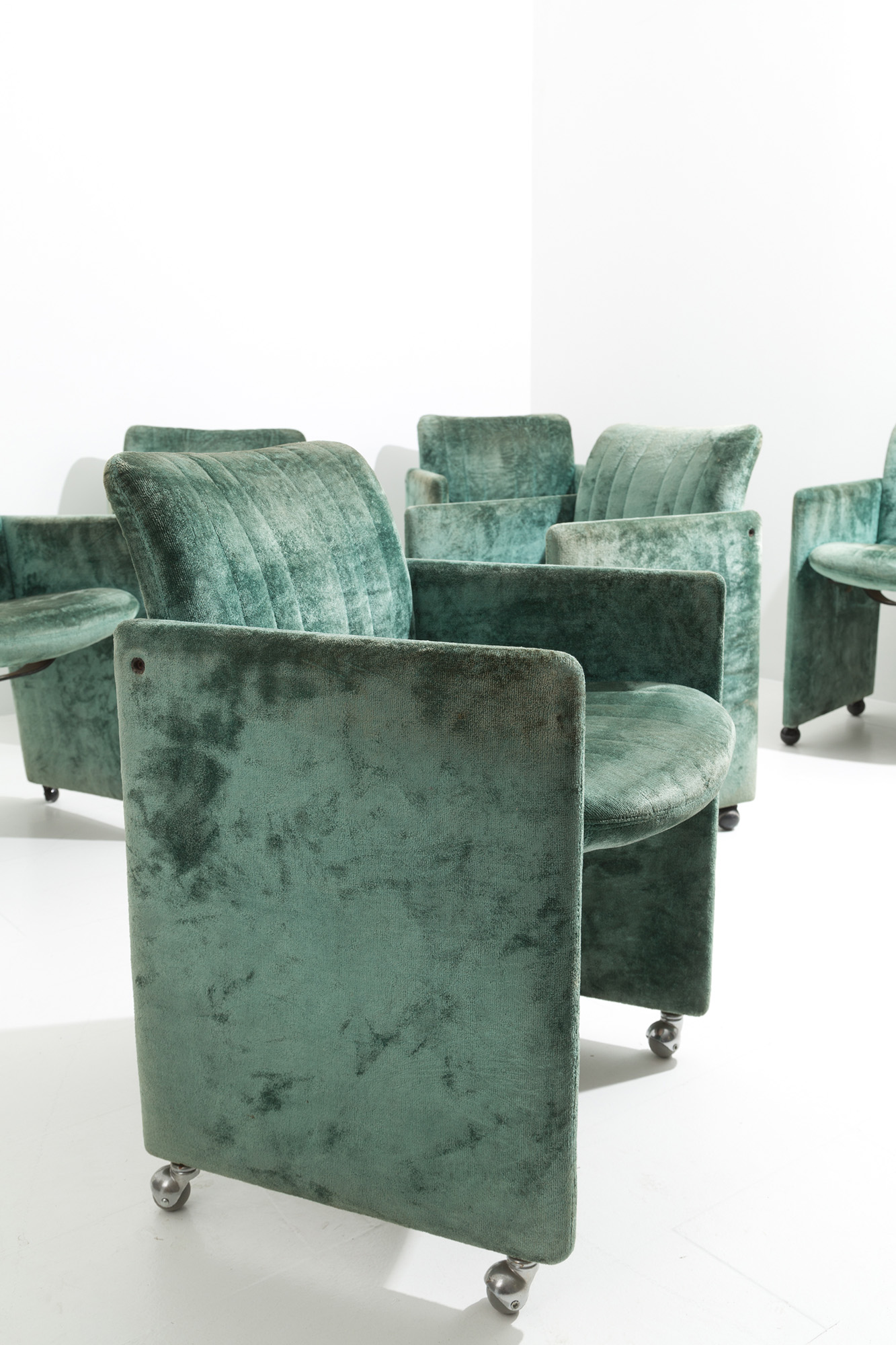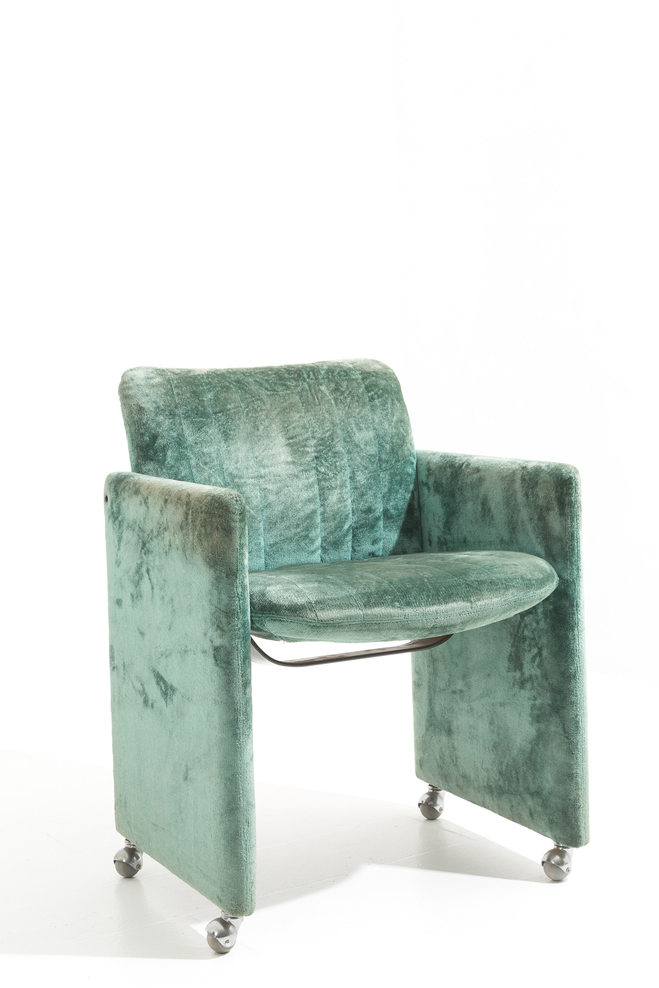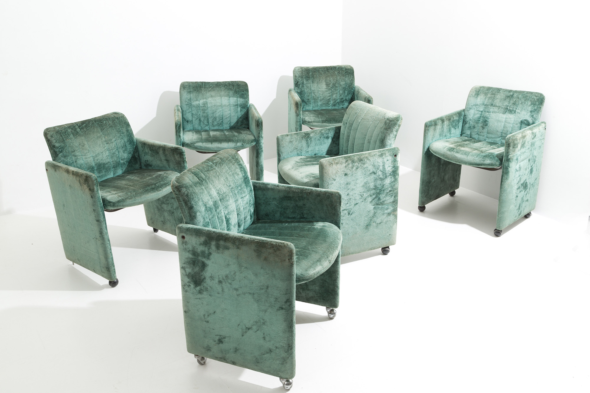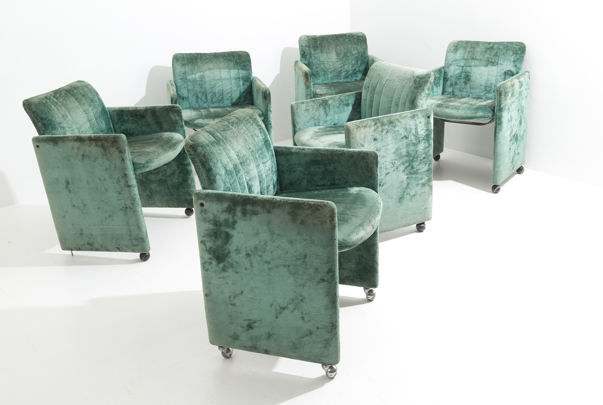 KAZUHIDE TAKAHAMA (Nobeoka, 1930 - Bologna, 2010). Sei poltroncine da ufficio in legno, metallo e velluto verde. Anni '70. Alcune mancanti di rotelle. Mis. Lung. cm. 60 Alt. cm. 80 Prof. cm. 60 ca.