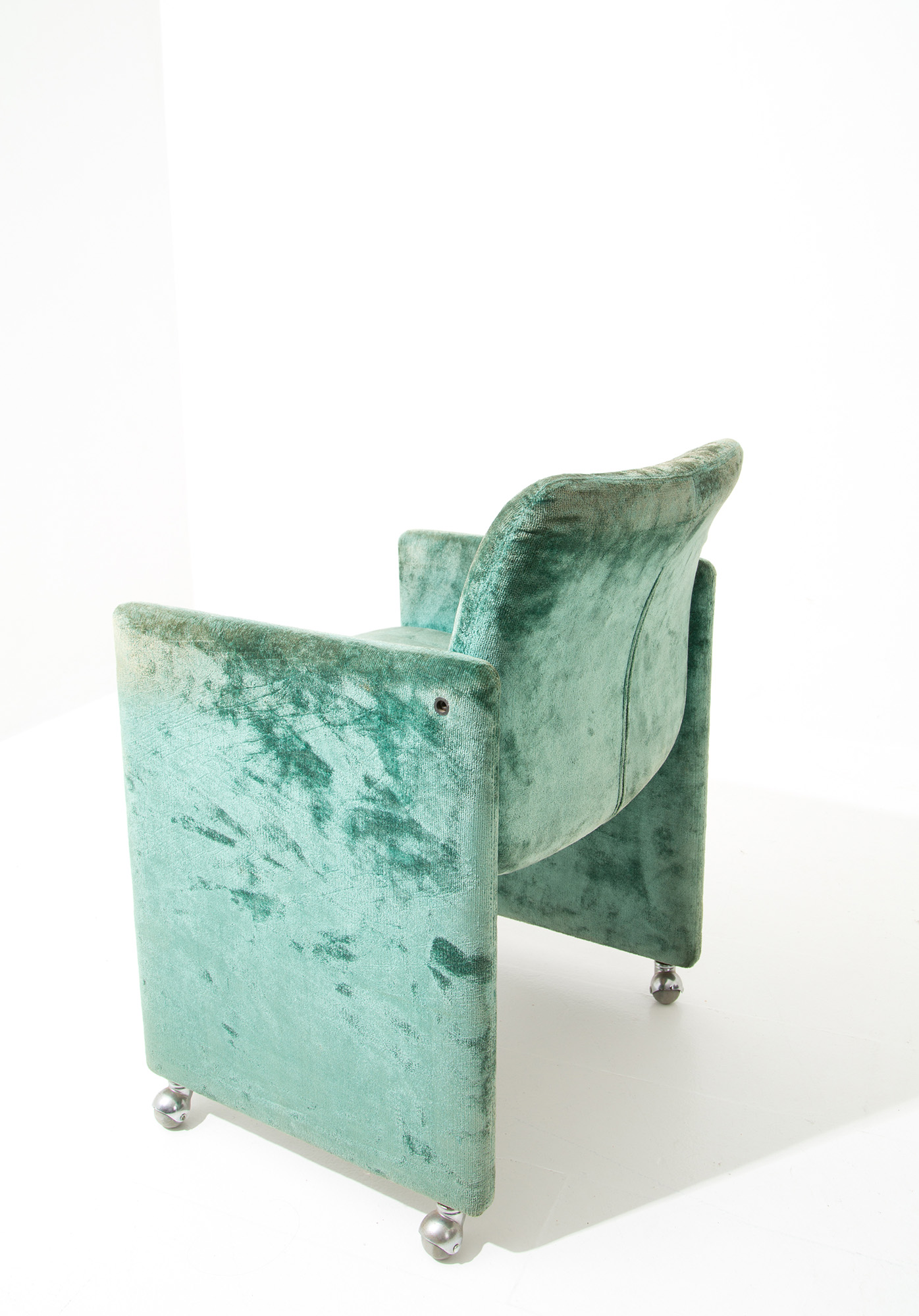 KAZUHIDE TAKAHAMA (Nobeoka, 1930 - Bologna, 2010). Quattro poltroncine da ufficio in legno, metallo e velluto verde. Anni '70. Alcune mancanti di rotelle. Mis. Lung. cm. 60 Alt. cm. 80 Prof. cm. 60 ca.