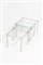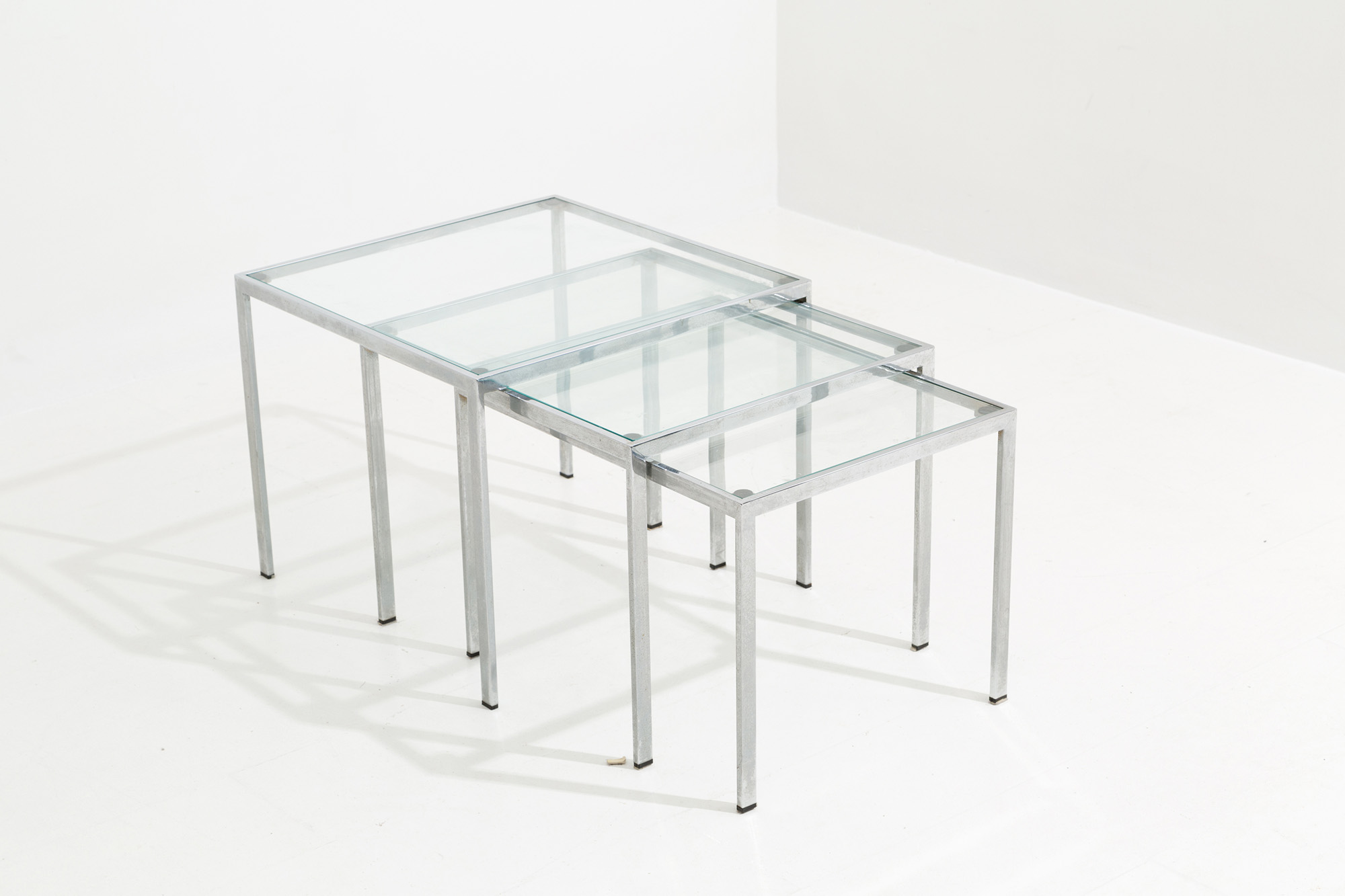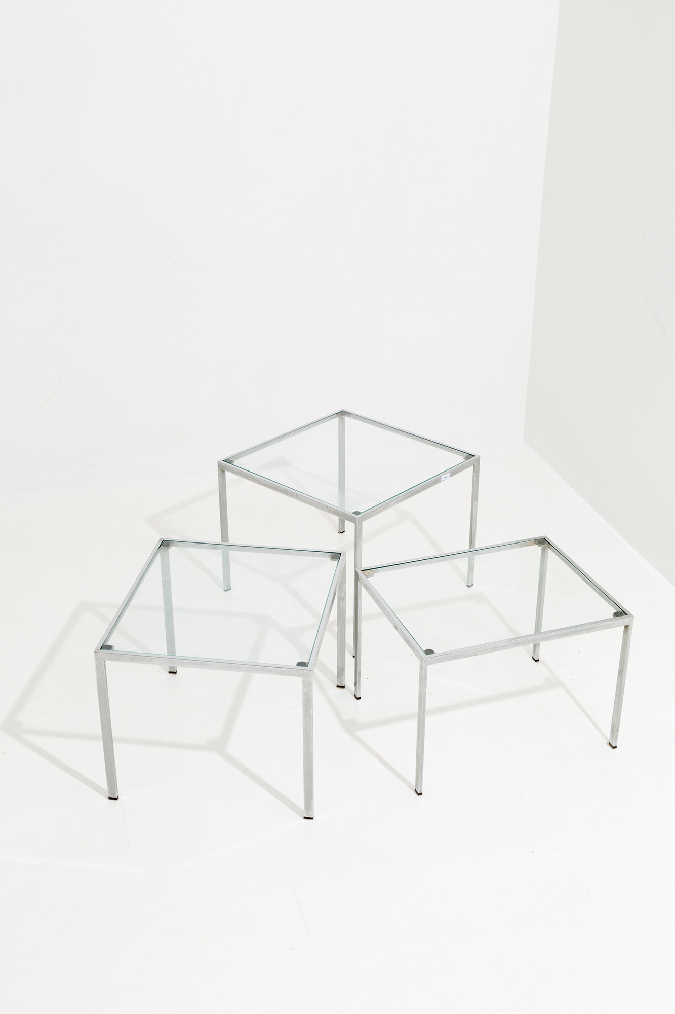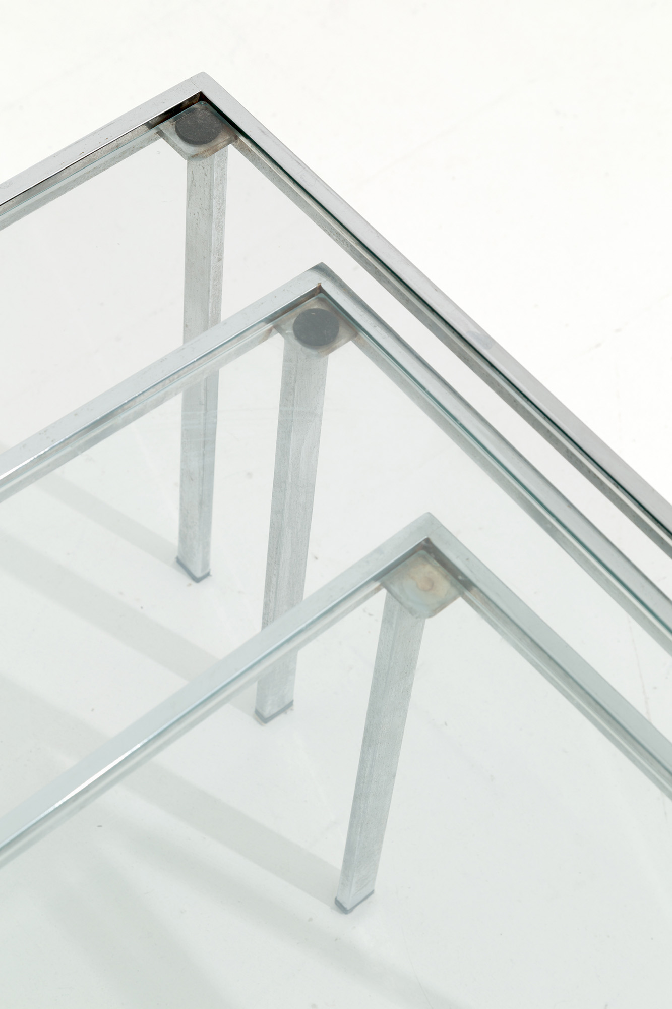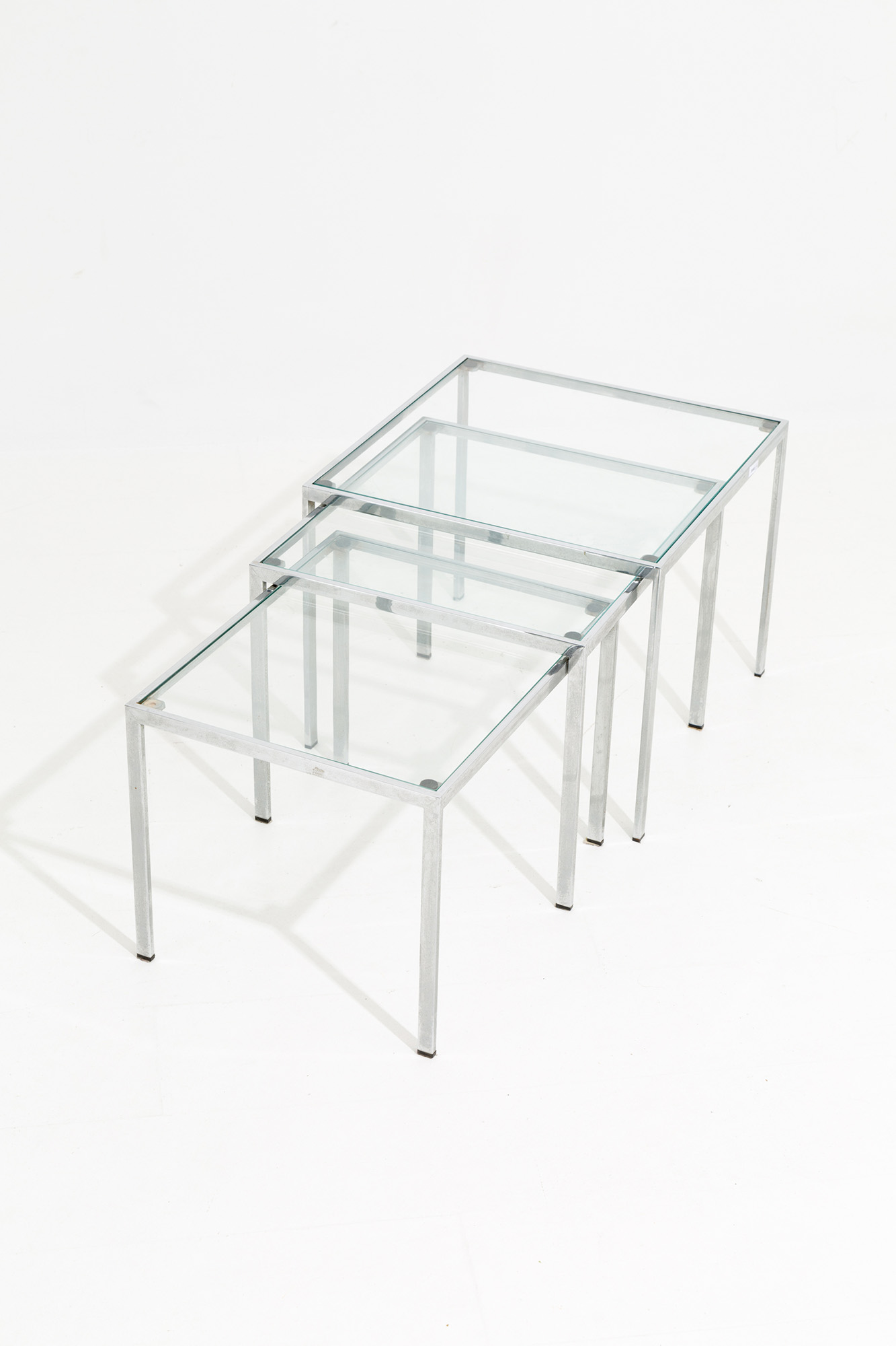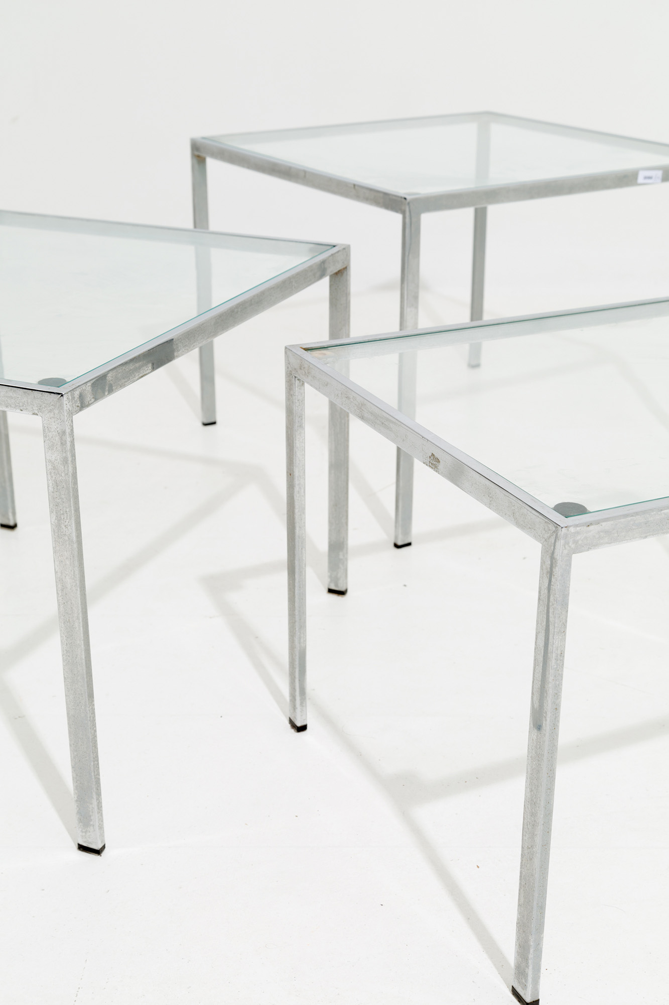 Trittico di tavolini quadrati in metallo cromato con piano in vetro. Manifattura italiana. Anni '70. Mis. Lung. cm. 50 Alt. cm. 40 Prof. cm. 50 ca.