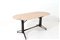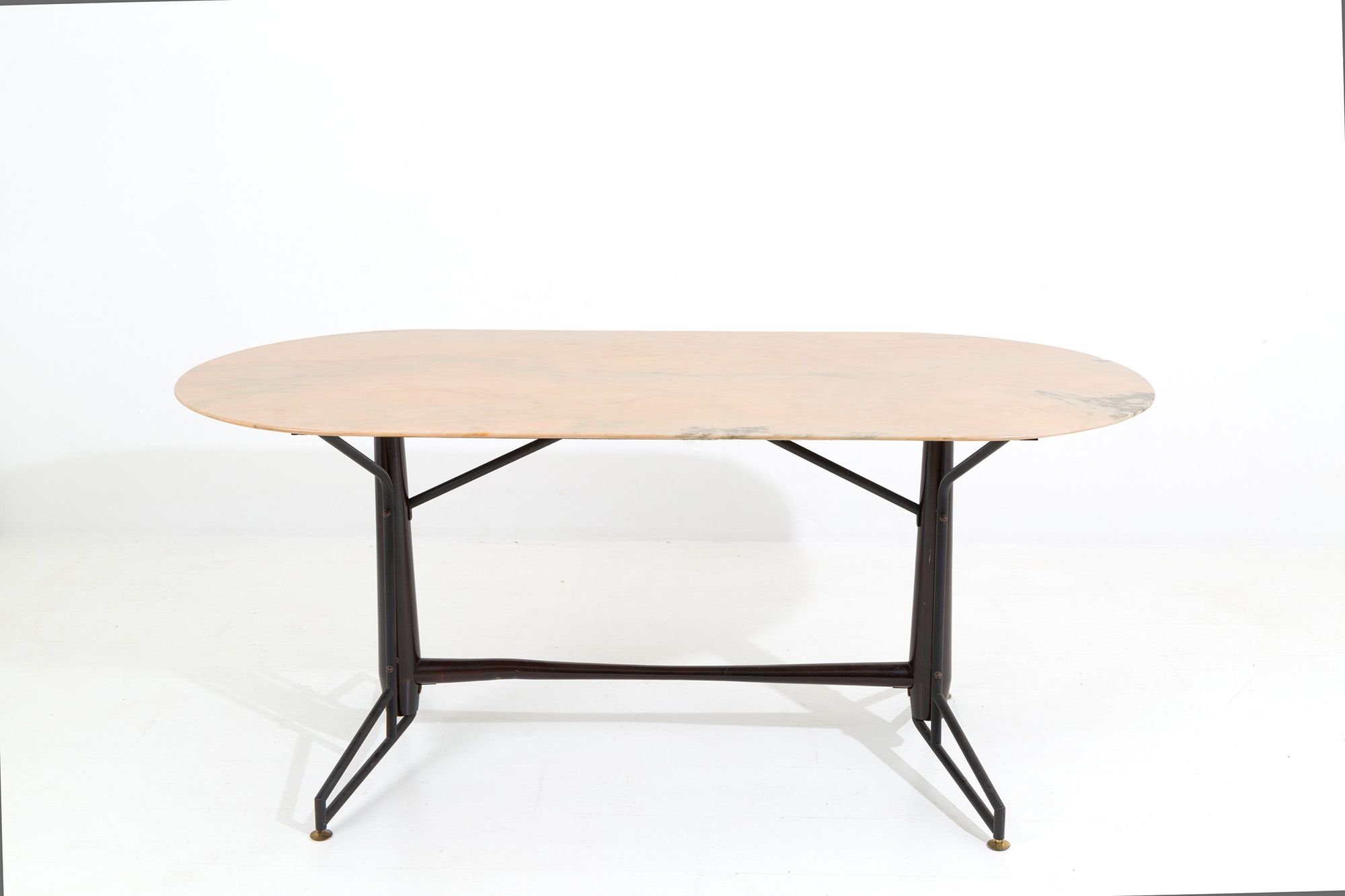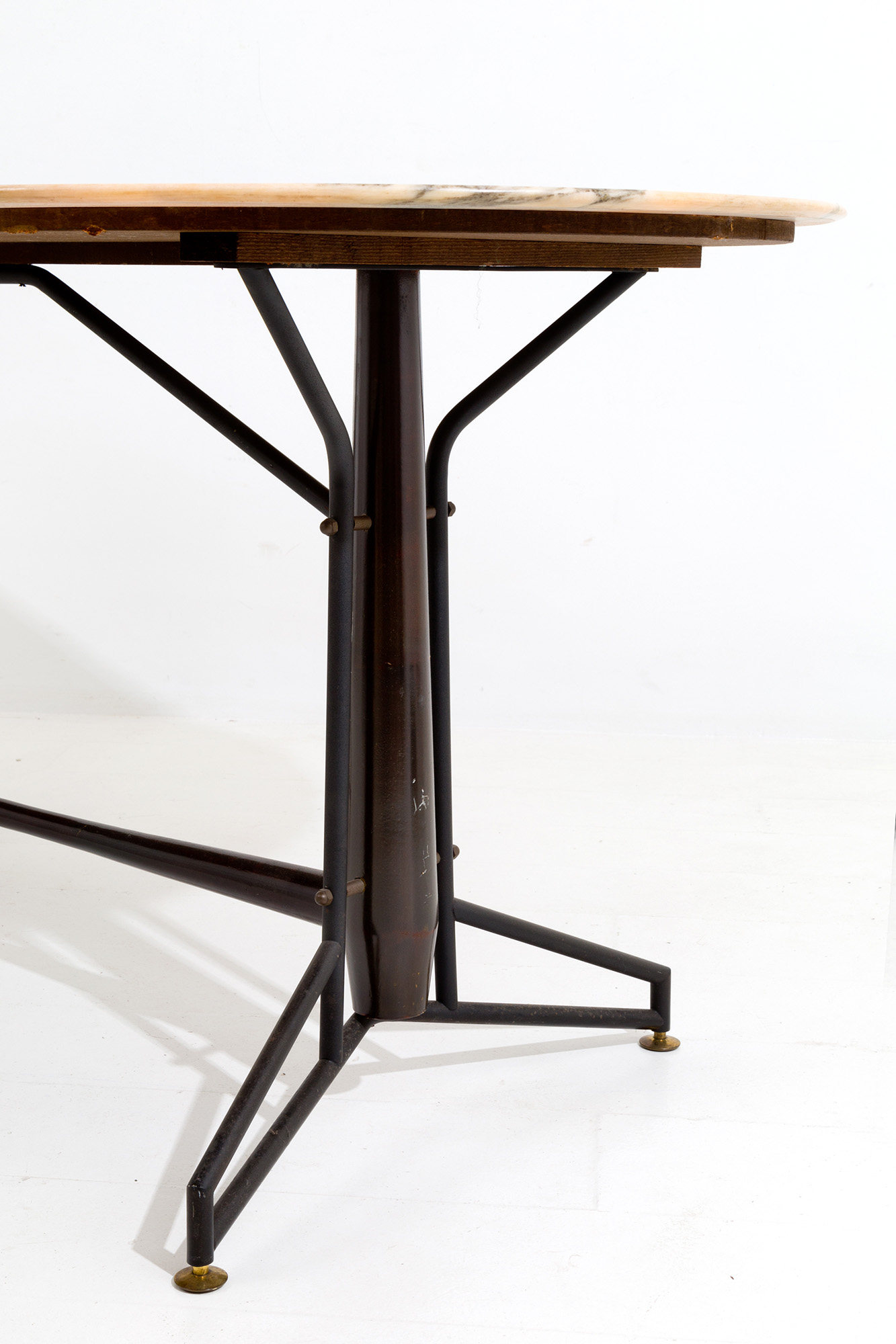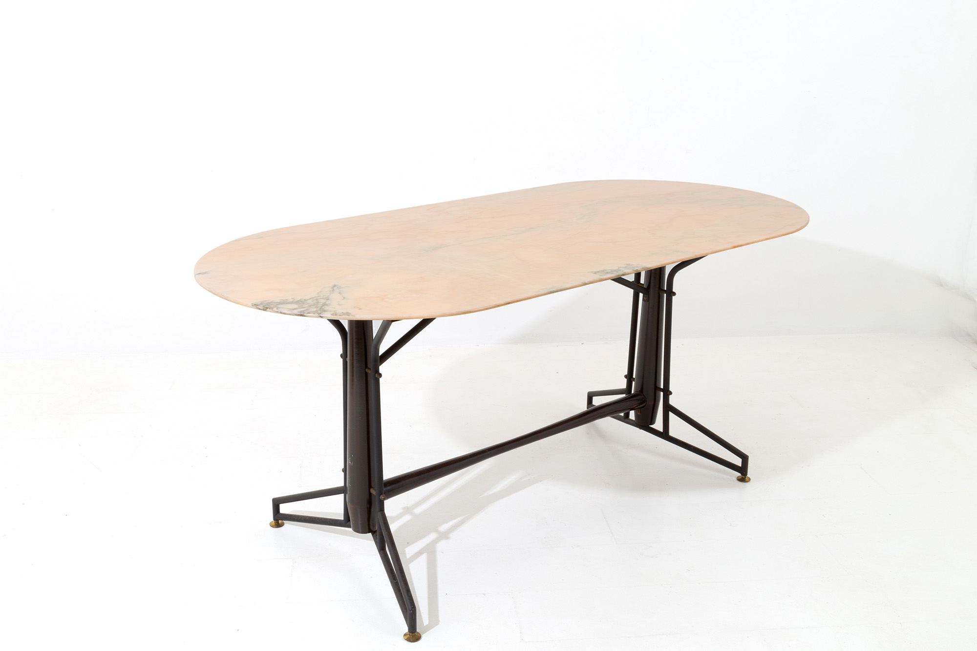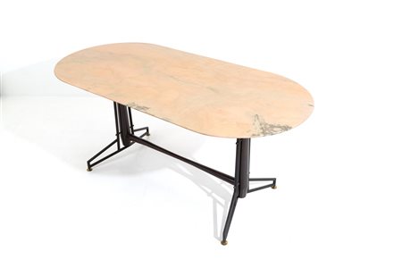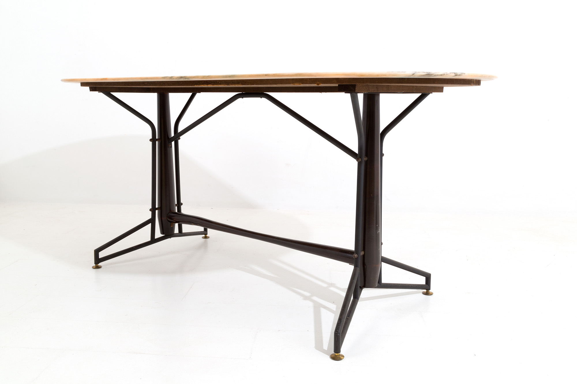 Tavolo ovale in ferro, ottone e legno con piano in onice giallo. Manifattura italiana. Anni '50. Mis. Lung. cm. 176 Alt. cm. 80 Prof. cm. 85 ca.