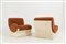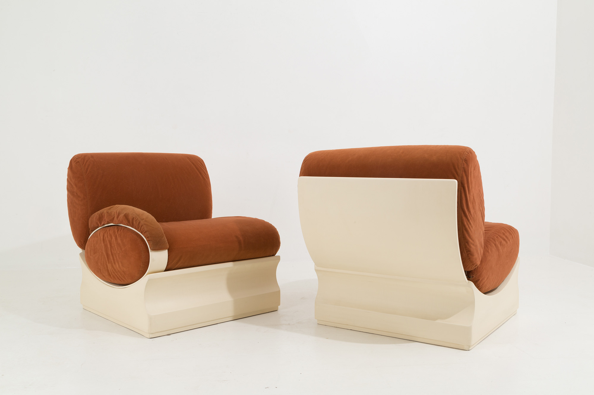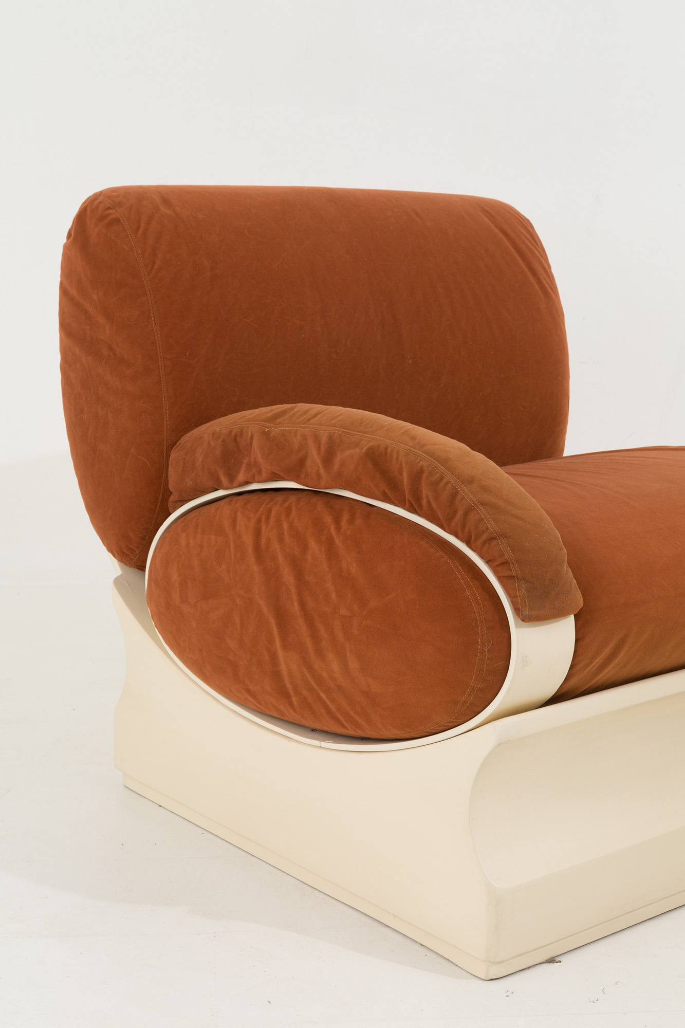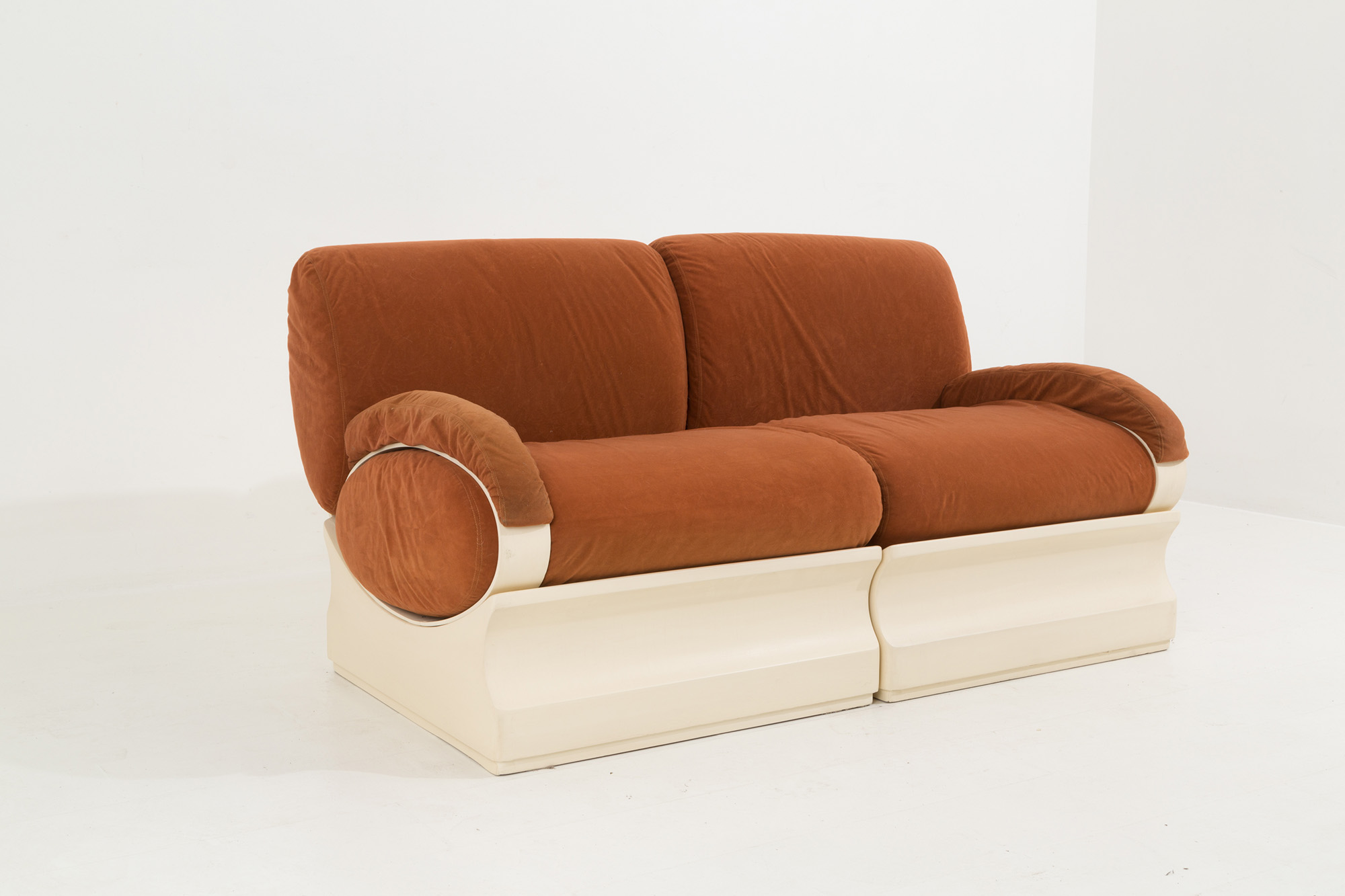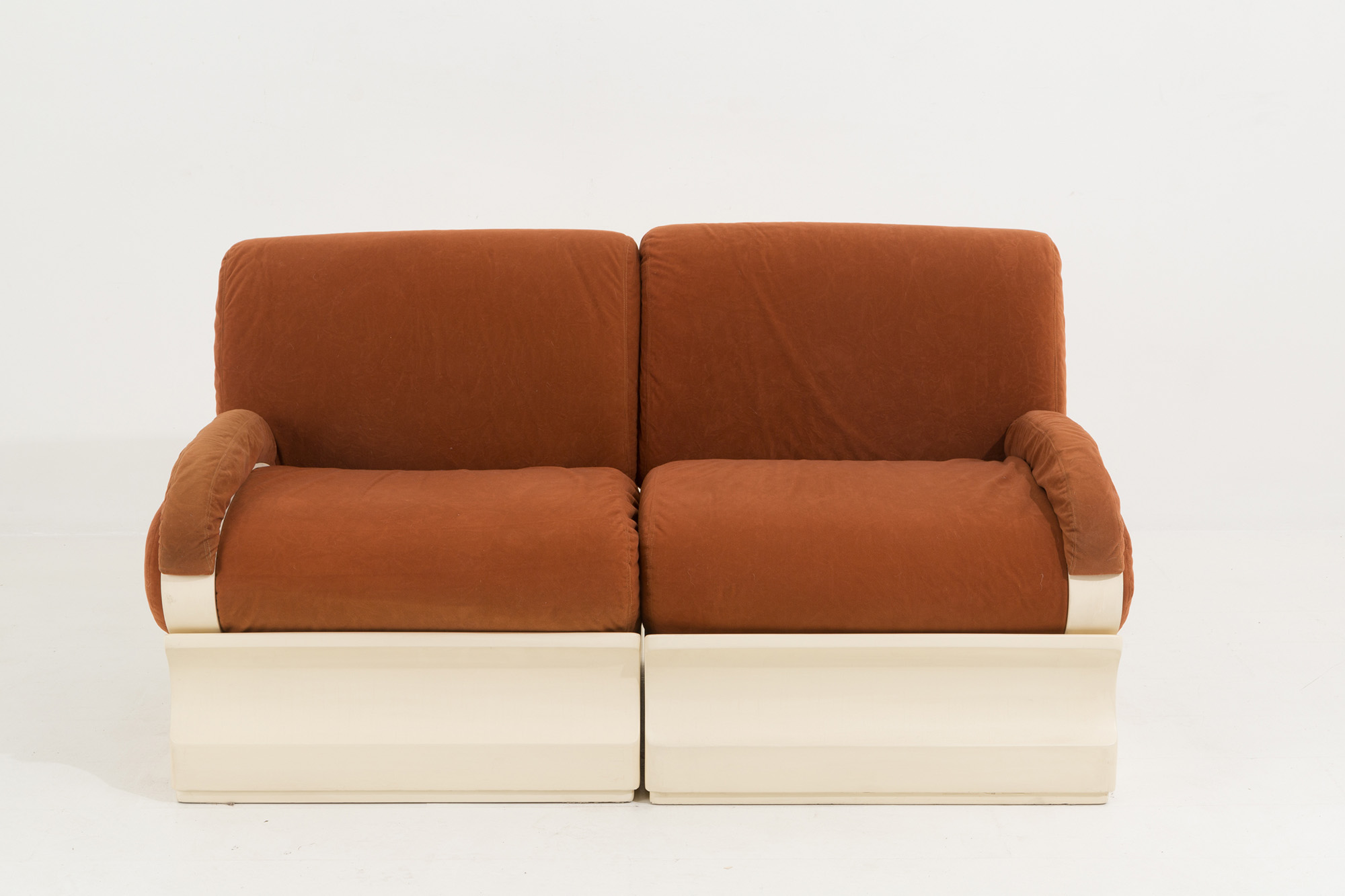 Divanetto a due elementi in legno laccato bianco e alcantara sintetica color mattone. Manifattura italiana. Anni '70. Mis. Lung. cm. 147 Alt. cm. 72 Prof. cm. 92 ca.