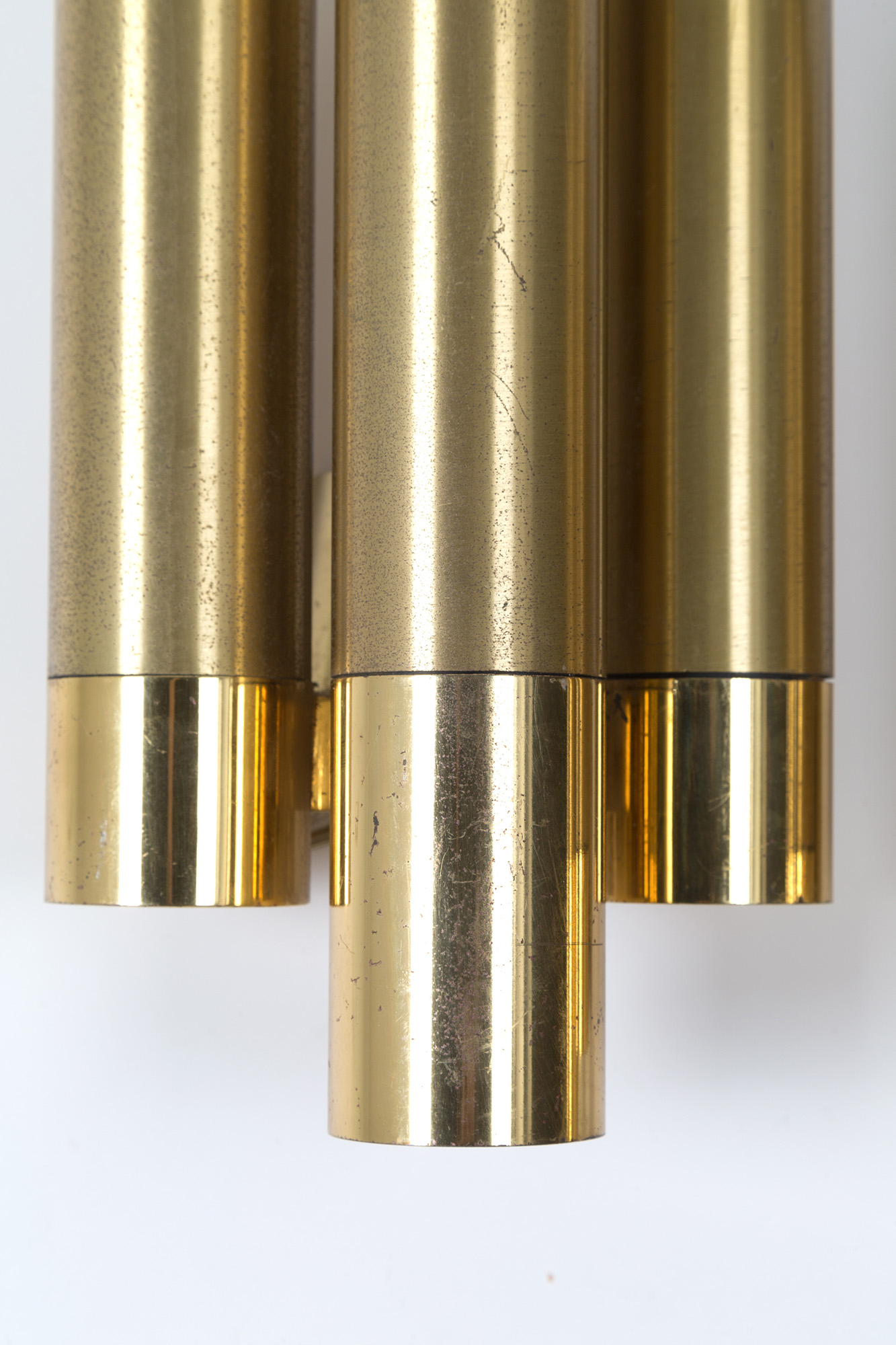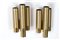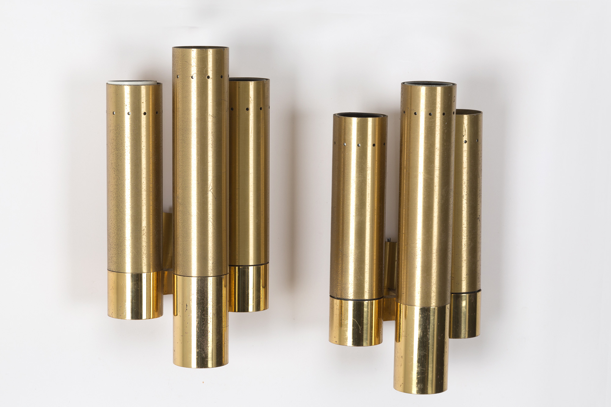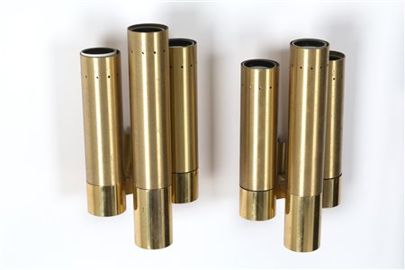 Due applique in ottone a tre tubi. Manifattura italiana. Anni '70. Mis. Lung. cm. 13.5 Alt. cm. 25.5 Prof. cm. 10 ca.