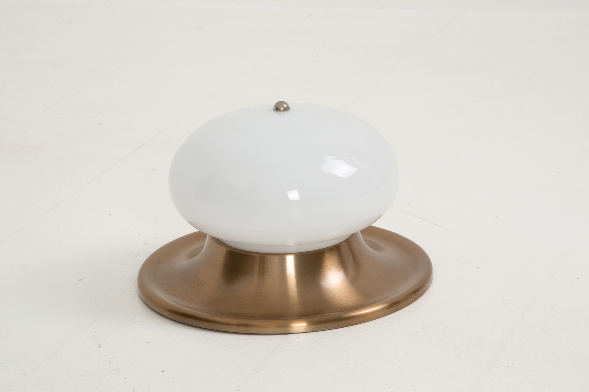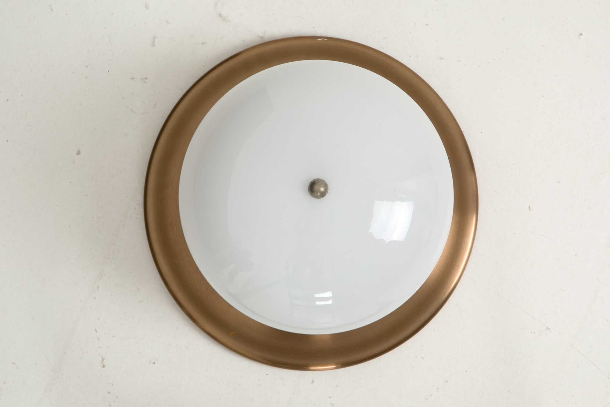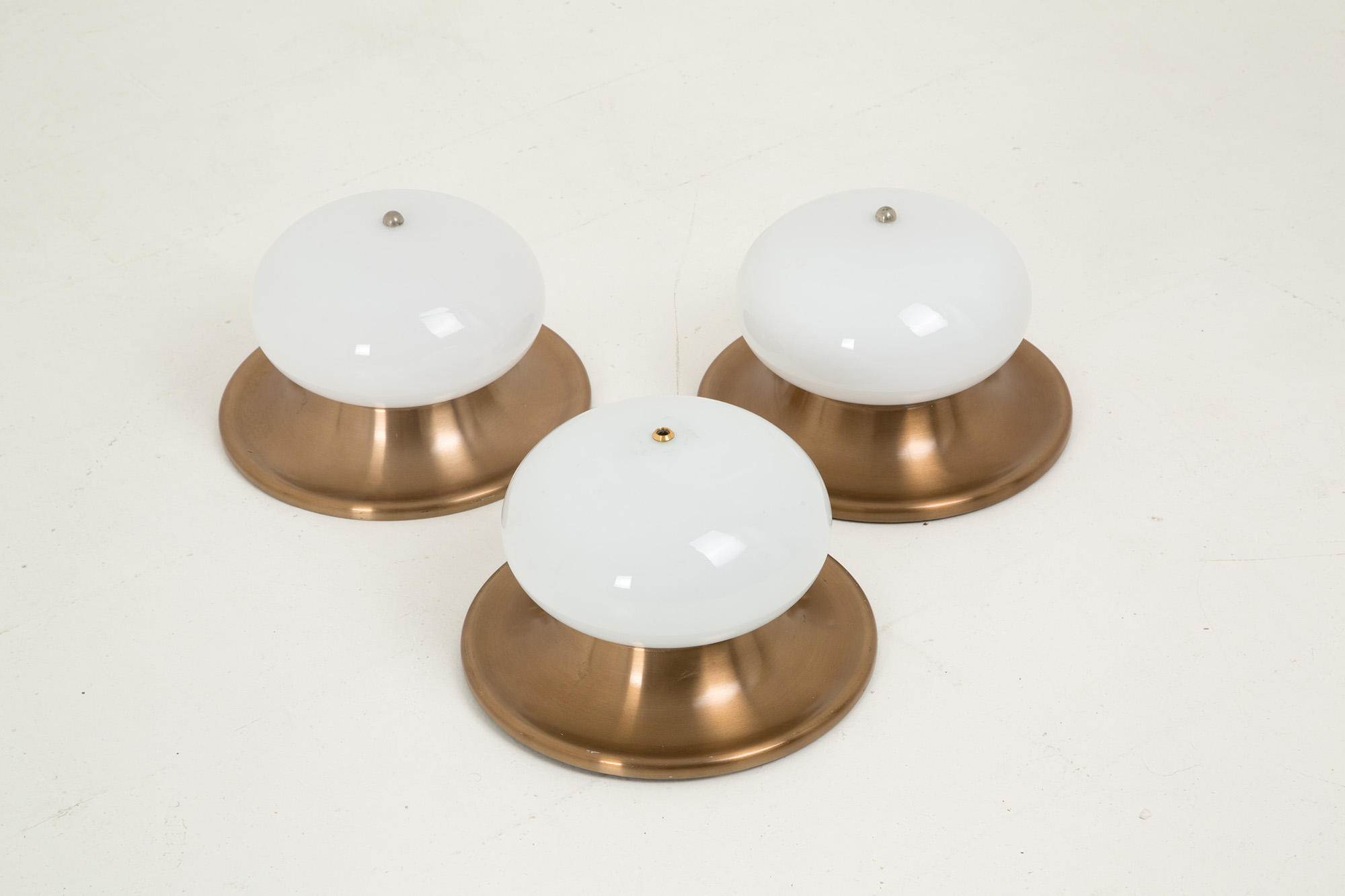 Tre plafoniere in ottone e vetro. Manifattura italiana. Anni '60. Mis. Diam. cm. 26 ca.