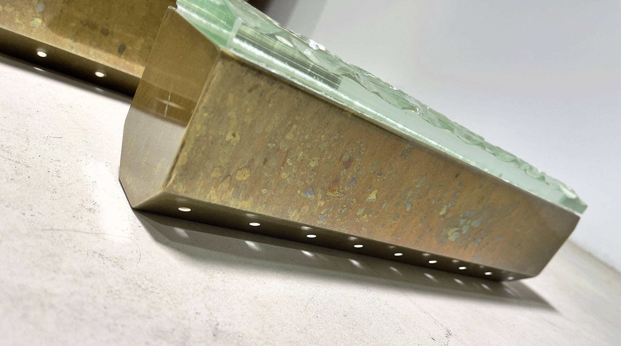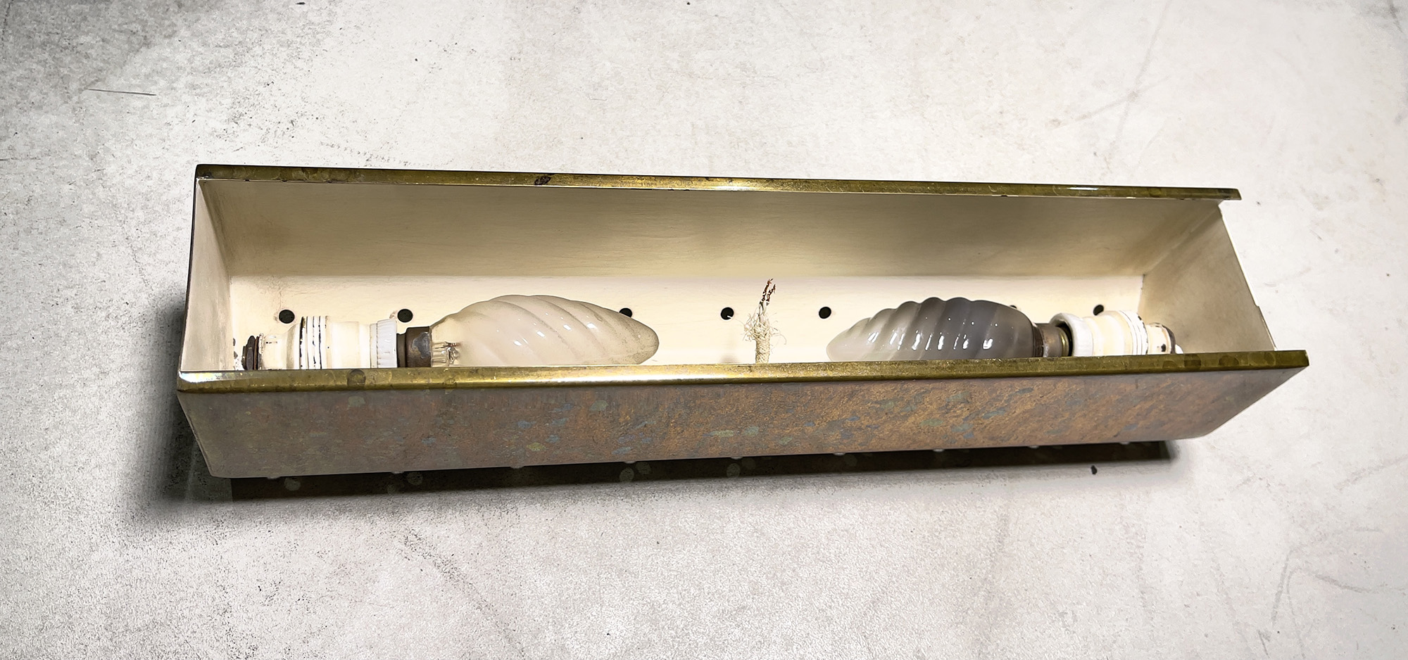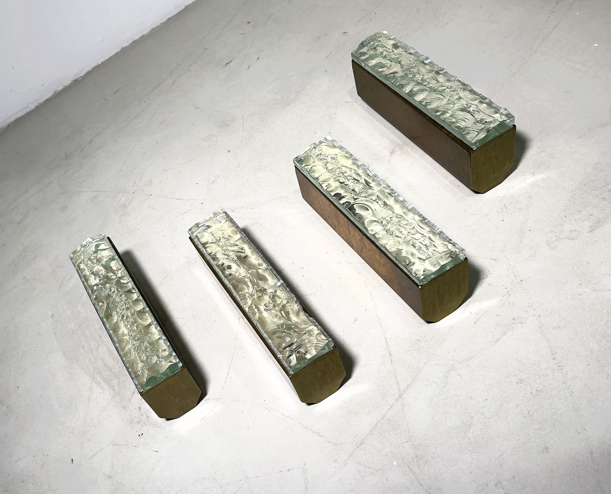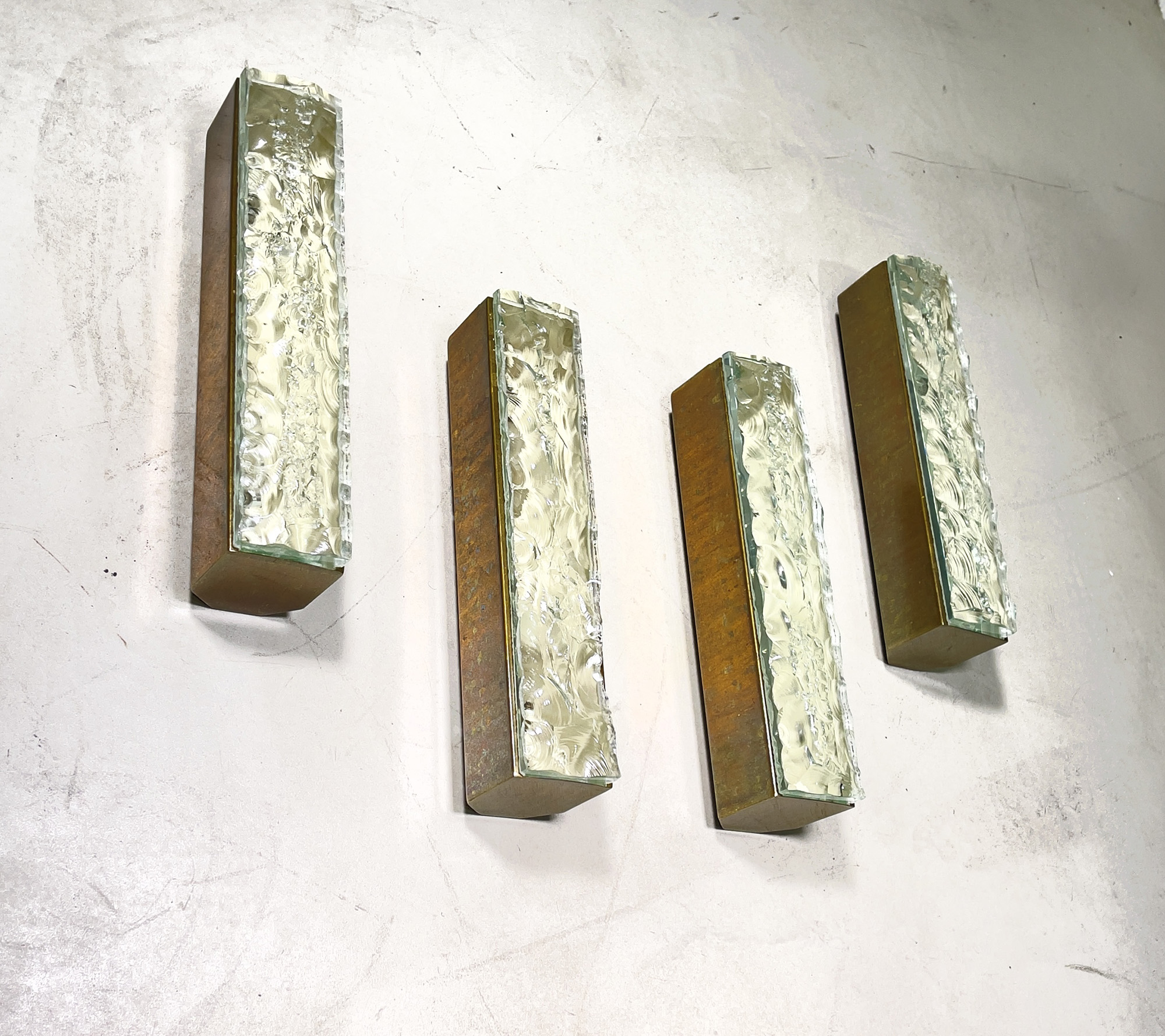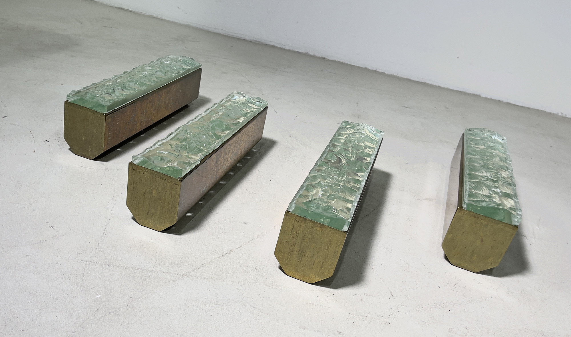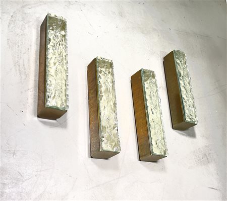 Quattro applique in ottone e vetro scalpellato. Produzione FONTANA ARTE. Anni '50. Mis. Lung. cm. 7 Alt. cm. 33 Prof. cm. 10 ca.