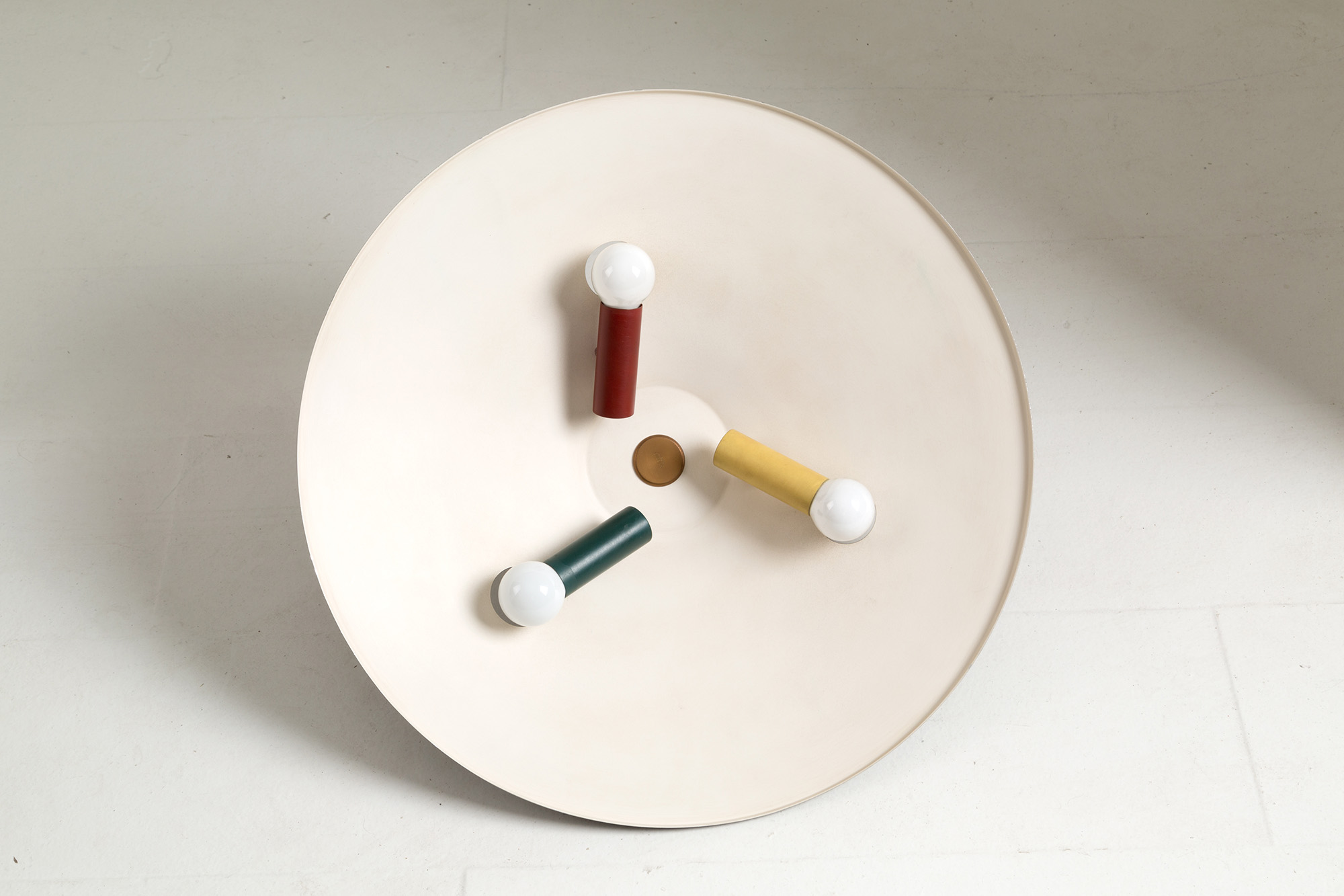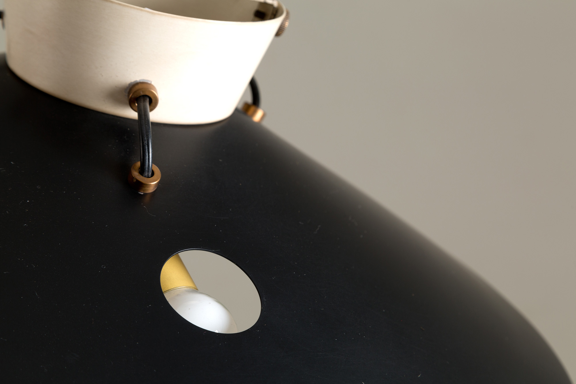Plafoniera tre luci in ferro verniciato nero all'esterno e beige, rosso, verde e giallo all'interno. Marcata STILNOVO all'interno. Anni '50. Mis. Alt. cm. 15 Diam. cm. 50.5 ca.