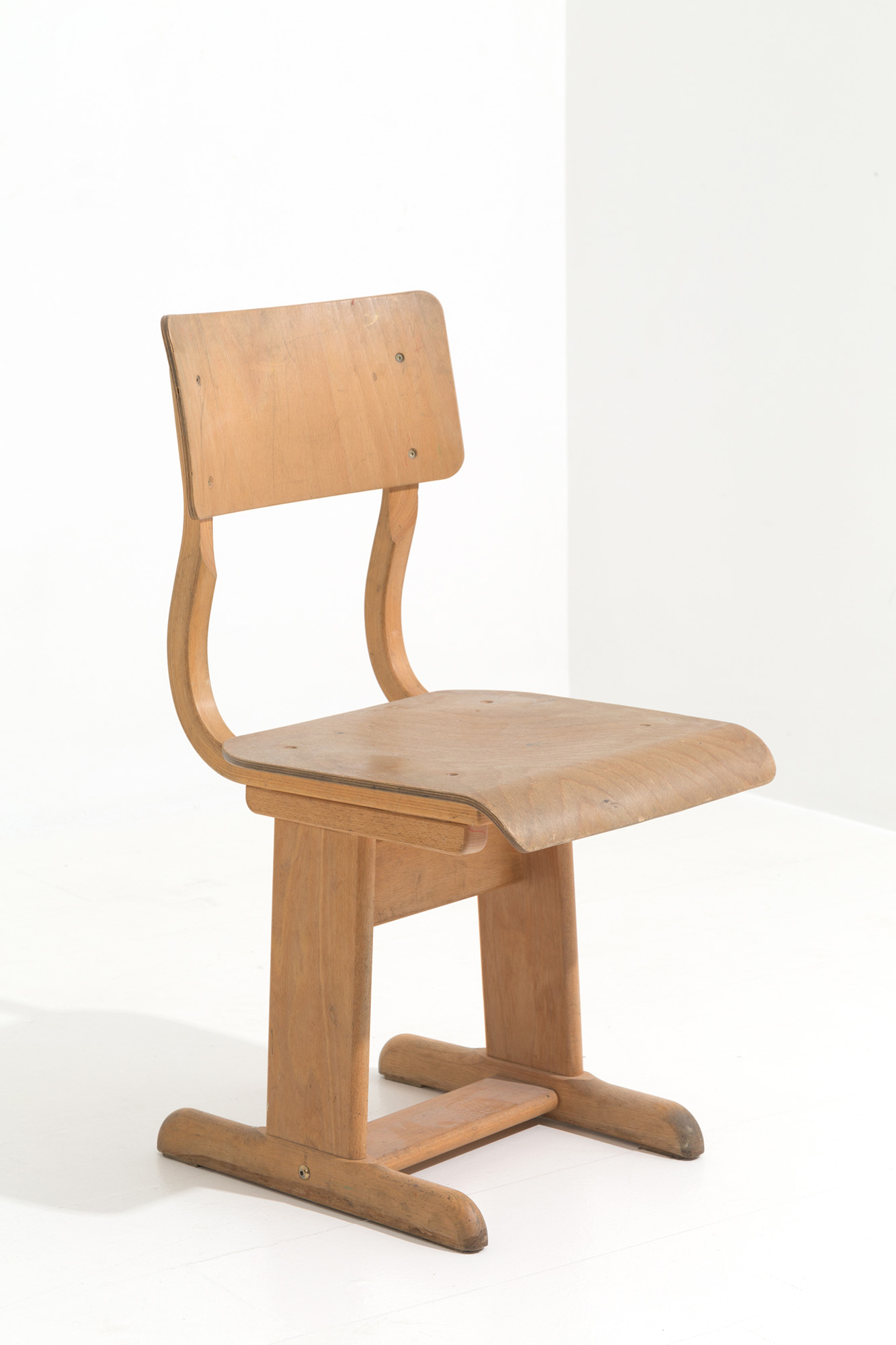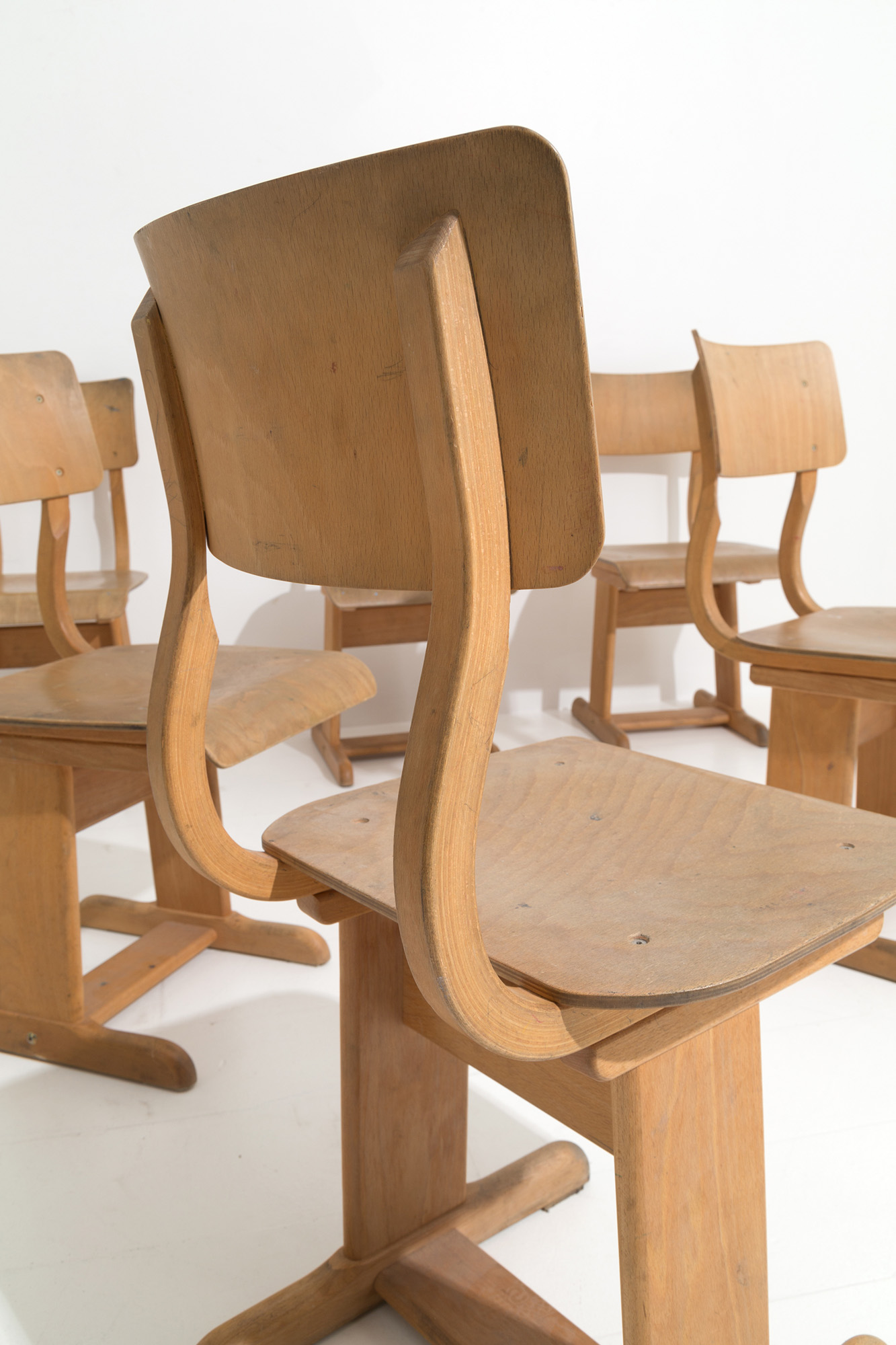 Sei sedie da scuola in legno. Manifattura italiana. Anni '50. Mis. Lung. cm. 41 Alt. cm. 82 Prof. cm. 50 ca.
