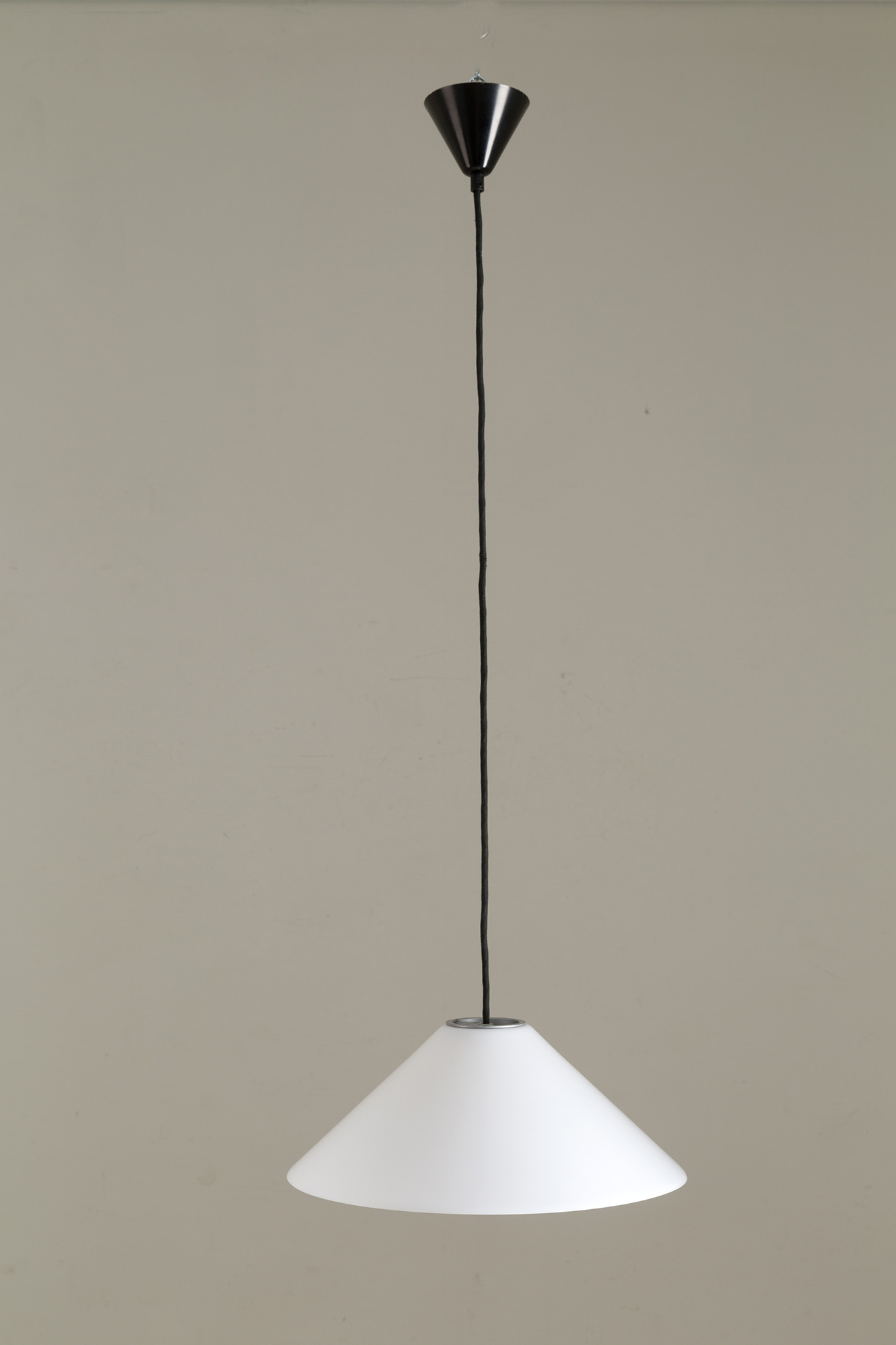 ENZO MARI (Cerano, 1932 - Milano, 2020) per ARTEMIDE. Lampadario in plexiglass, acciaio cromato e metallo verniciato nero. Anni '70. Mis. Alt. cm. 105 Diam. cm. 38 ca.