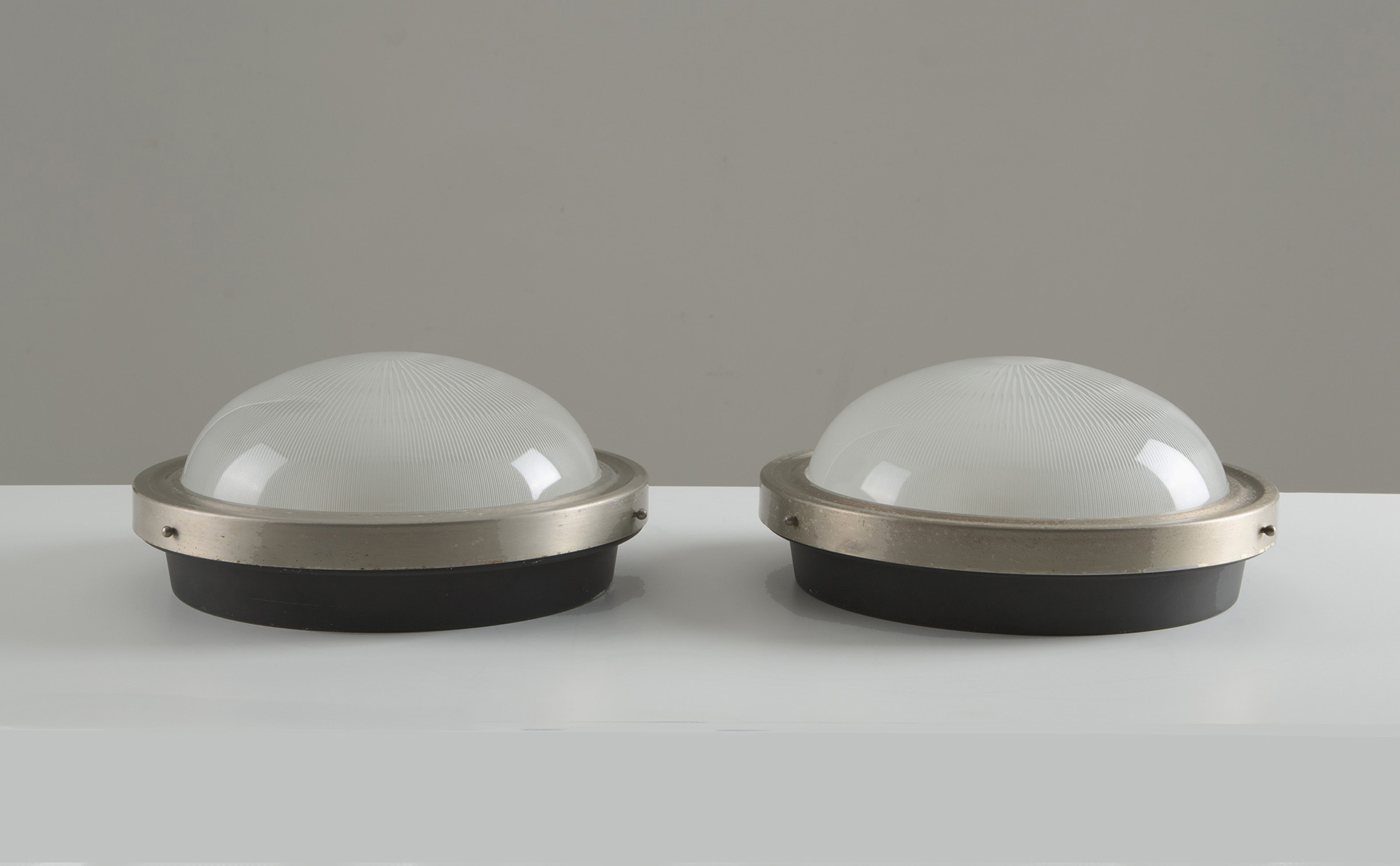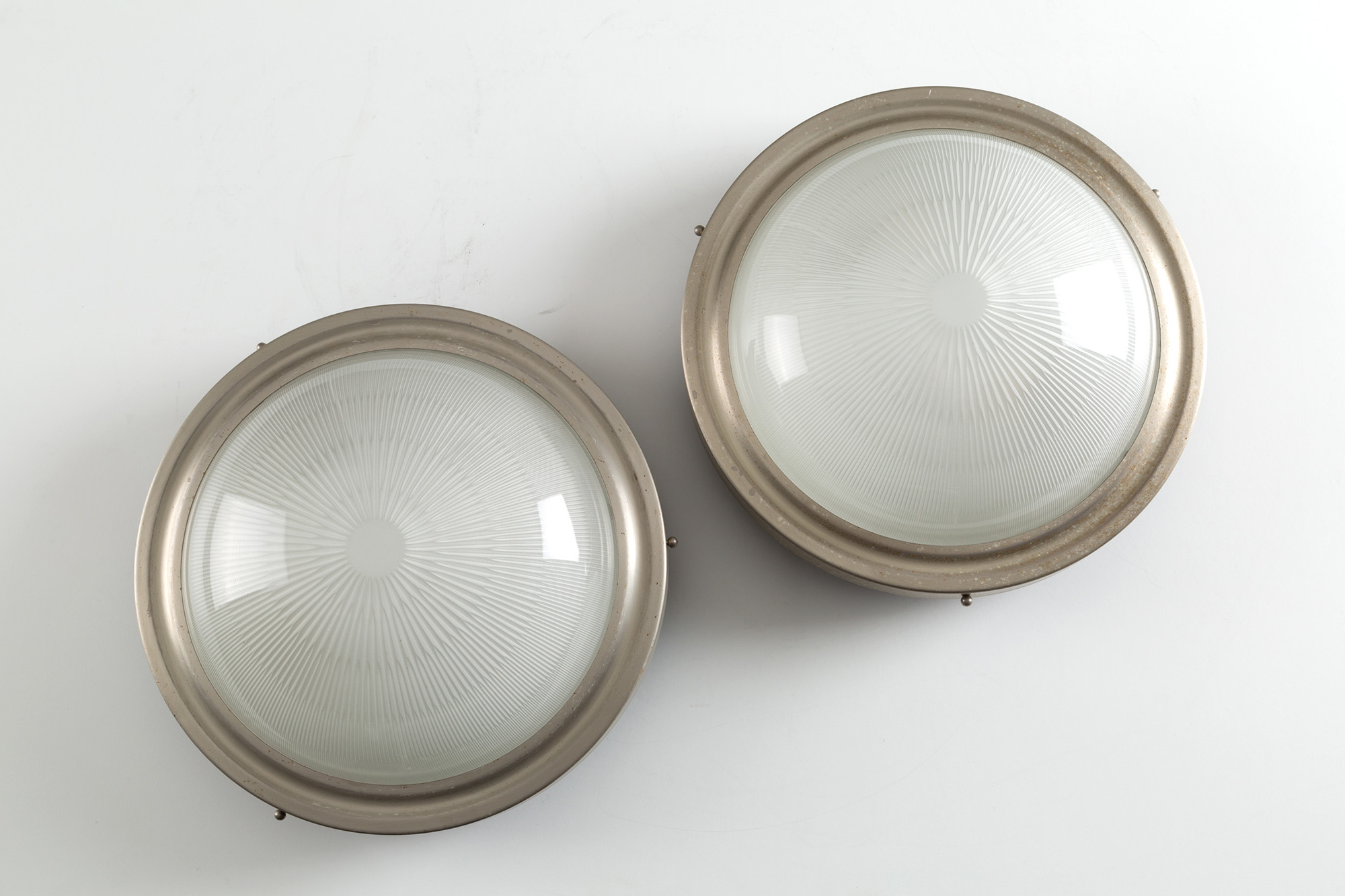 SERGIO MAZZA (Milano, 1931) per ARTEMIDE. Coppia di applique in vetro e metallo nichelato. Anni '60. Mis. Prof. cm. 15 Diam. cm. 30 ca.