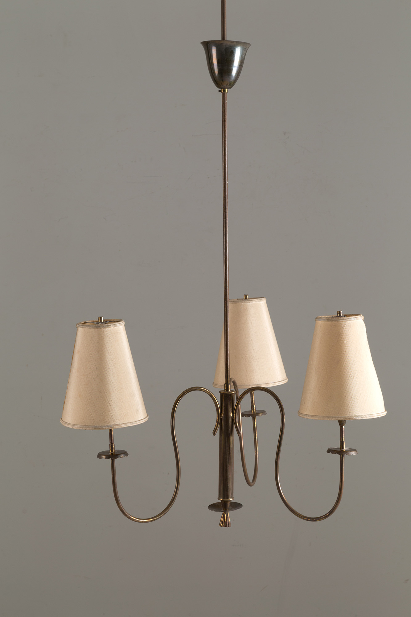 Lampadario tre bracci in ottone. Manifattura italiana. Anni '50-'60. Mis. Alt. cm. 120 Diam. cm. 60 ca.
