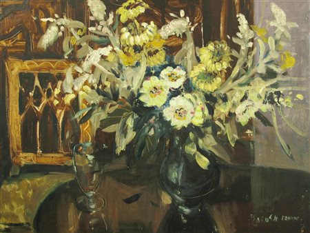 Balogh Ervin (1925) Natura morta con fiori bianchi Olio su faesite Firmato Misure 60x81 cm