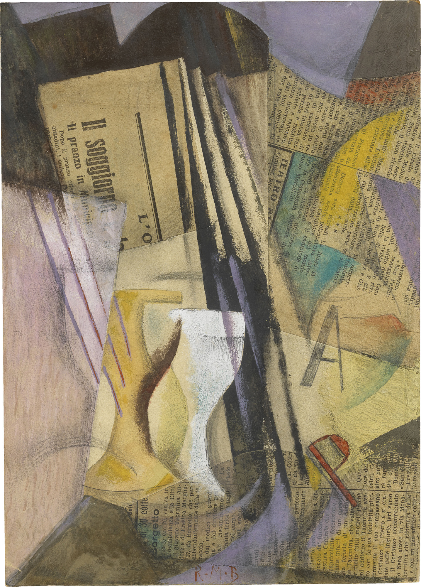 ROBERTO MARCELLO (IRAS) BALDESSARI, COMPOSIZIONE CUBO-FUTURISTA. NATURA MORTA CON GIORNALI E BICCHIERI, 1917 CA.